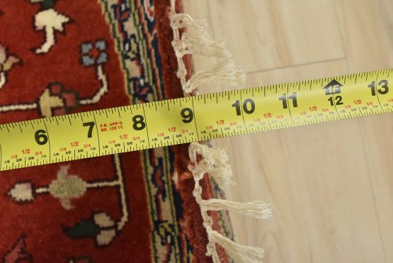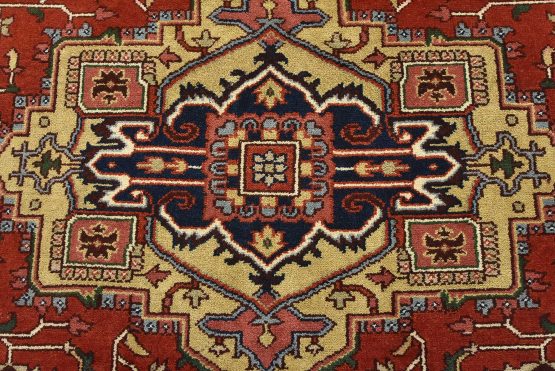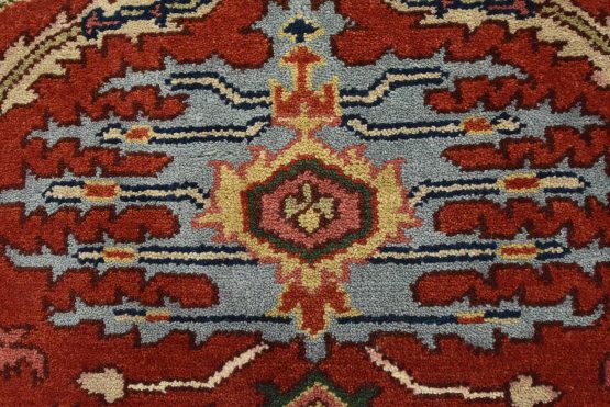 A traditional tribal Heriz rug hand-knotted with an all-wool pile on a cotton foundation. This oriental rug features a central medallion surrounded by geometric botanical designs set against a red background. It is new and in excellent condition.
