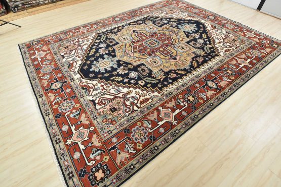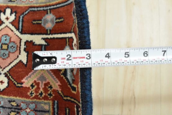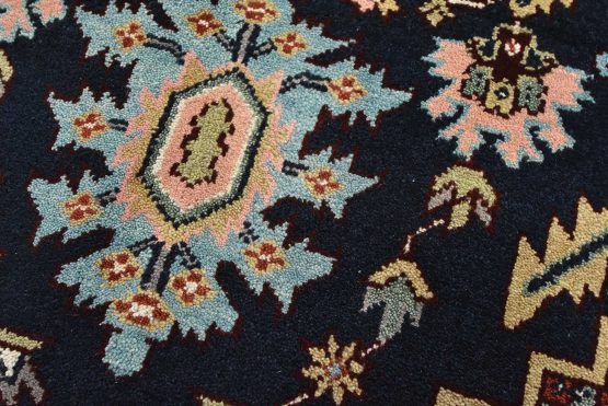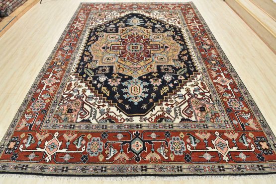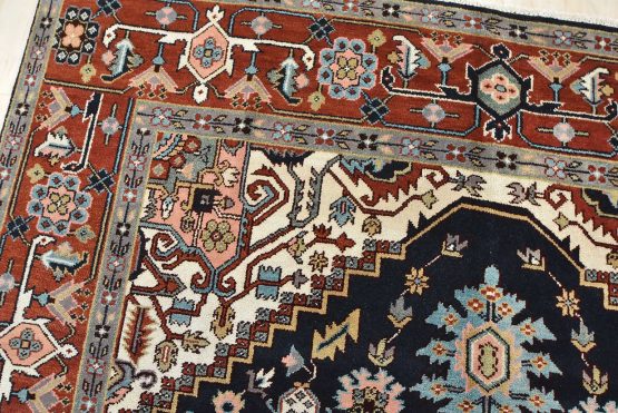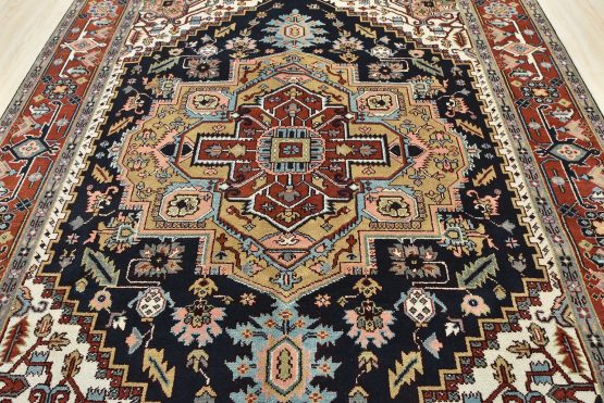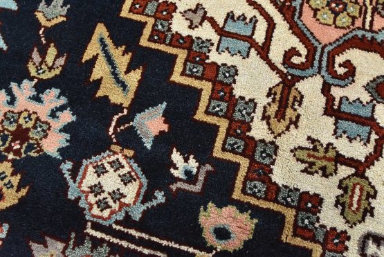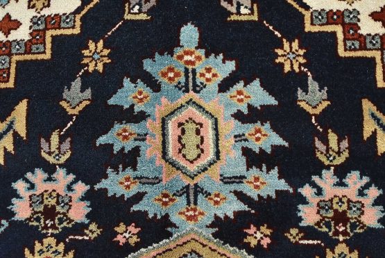 A traditional tribal Heriz rug hand-knotted with an all-wool pile on a cotton foundation. This oriental rug features a central medallion surrounded by a geometric botanical design set against a dark blue background. It is new and in excellent condition.