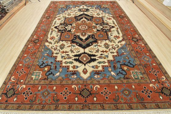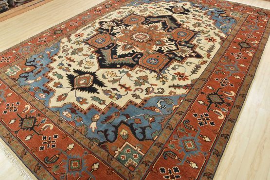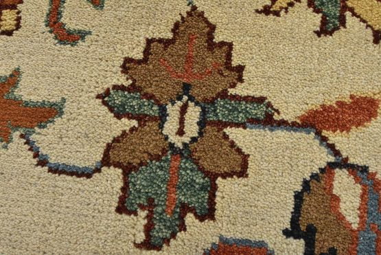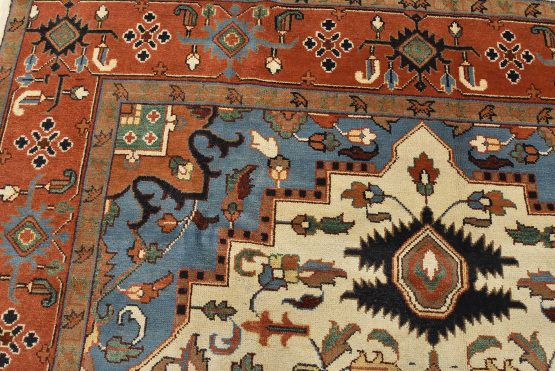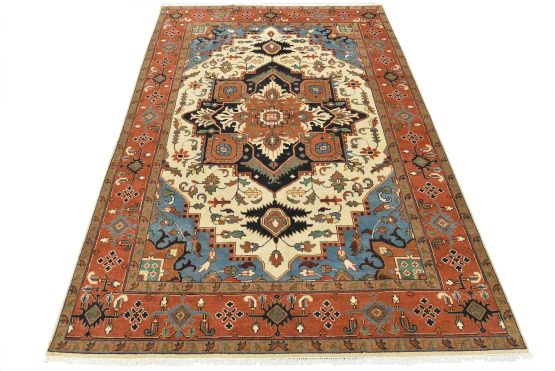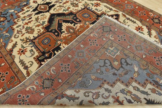 A traditional Heriz rug hand-knotted with an all-wool pile on a cotton foundation. This oriental rug features a central geometric medallion surrounded by a botanical design set against an ivory background. It is new and in excellent condition.