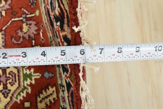 A traditional tribal Heriz rug hand-knotted with an all-wool pile on a cotton foundation. This oriental rug features a central geometric medallion surrounded by a botanical design set against a red background. It is new and in excellent condition.