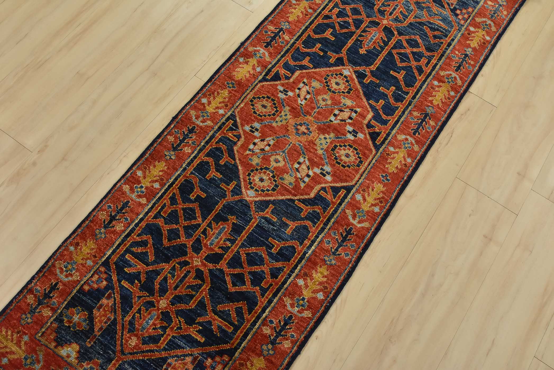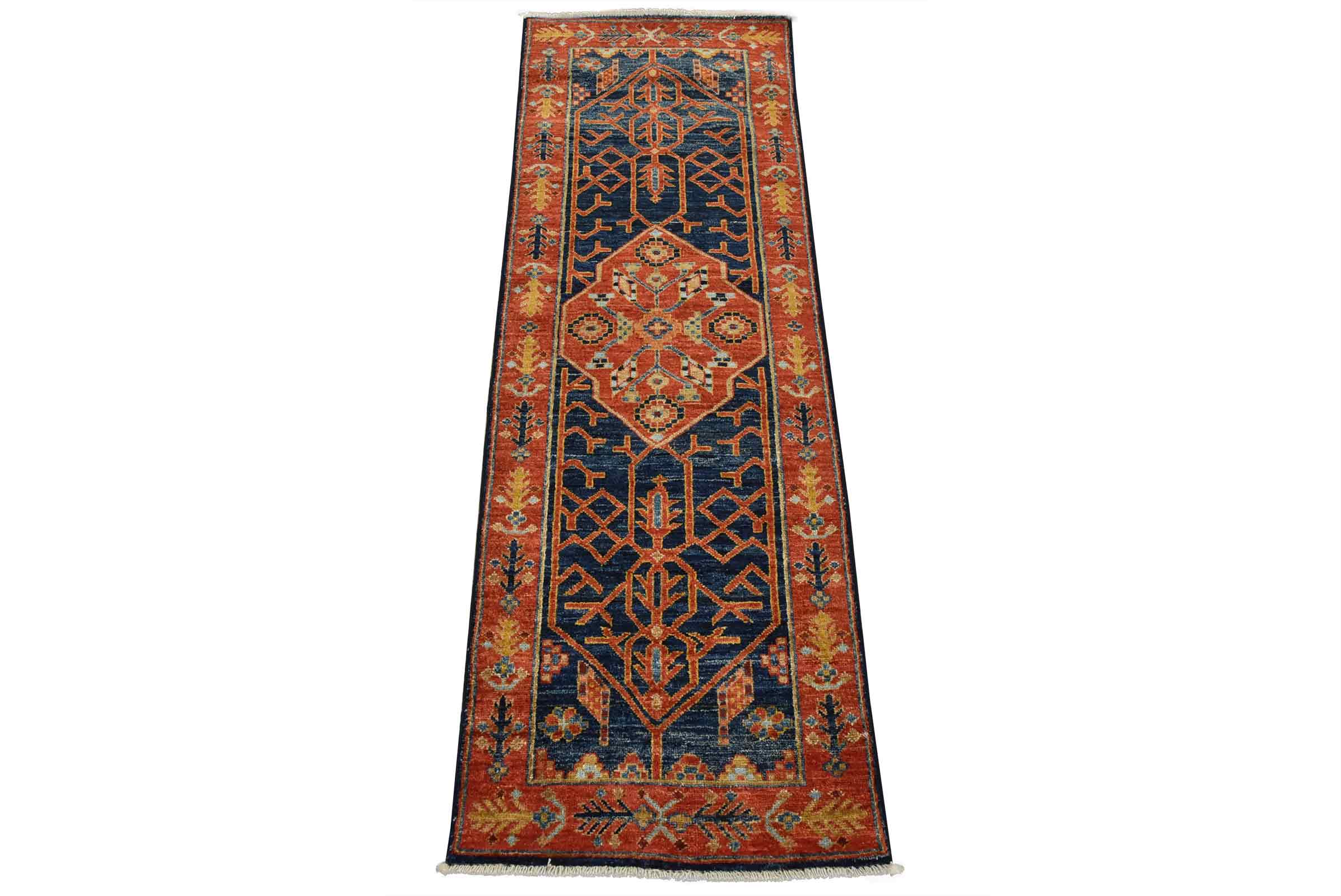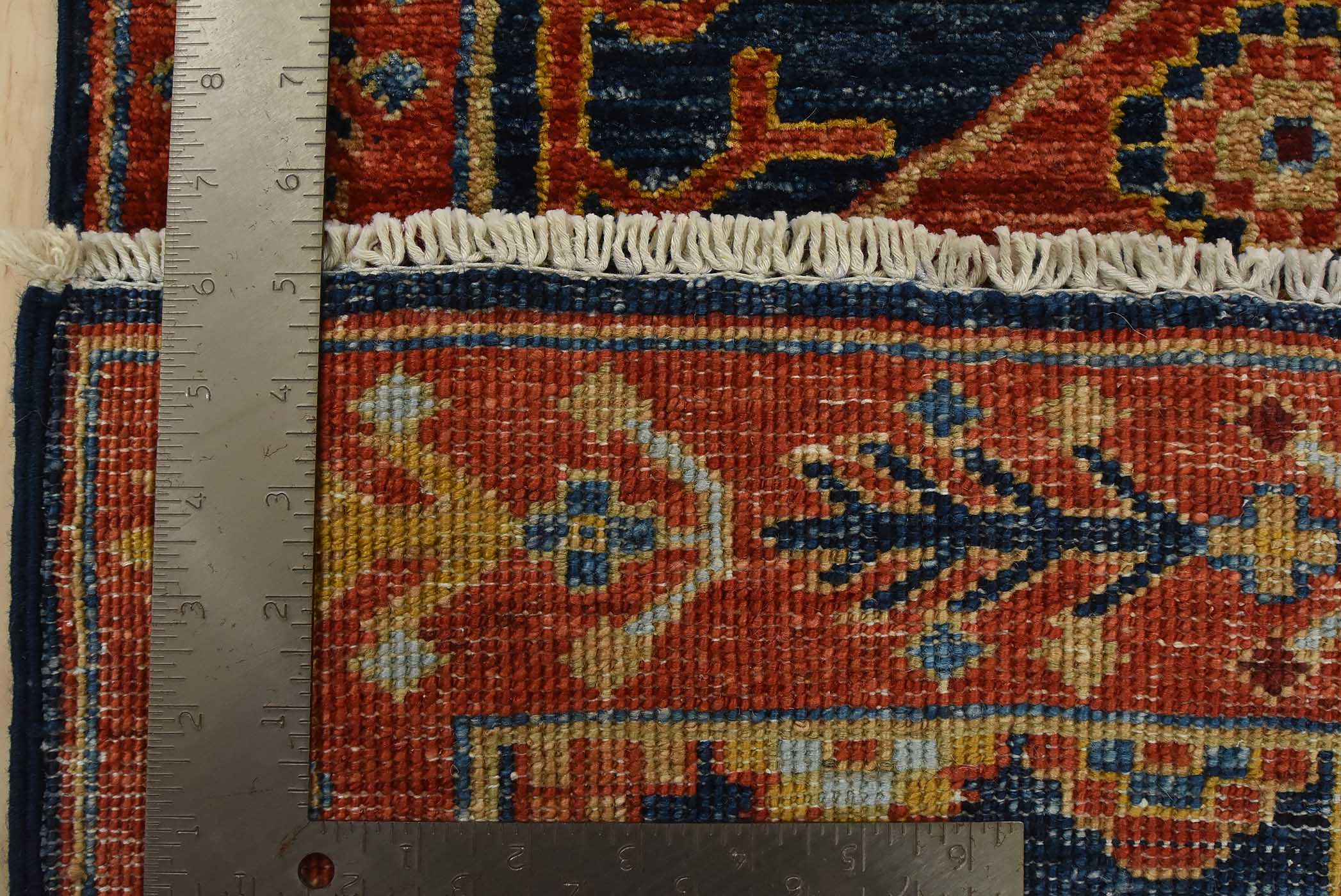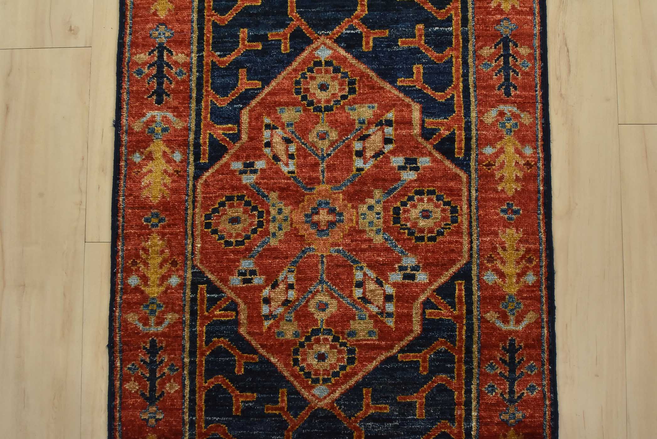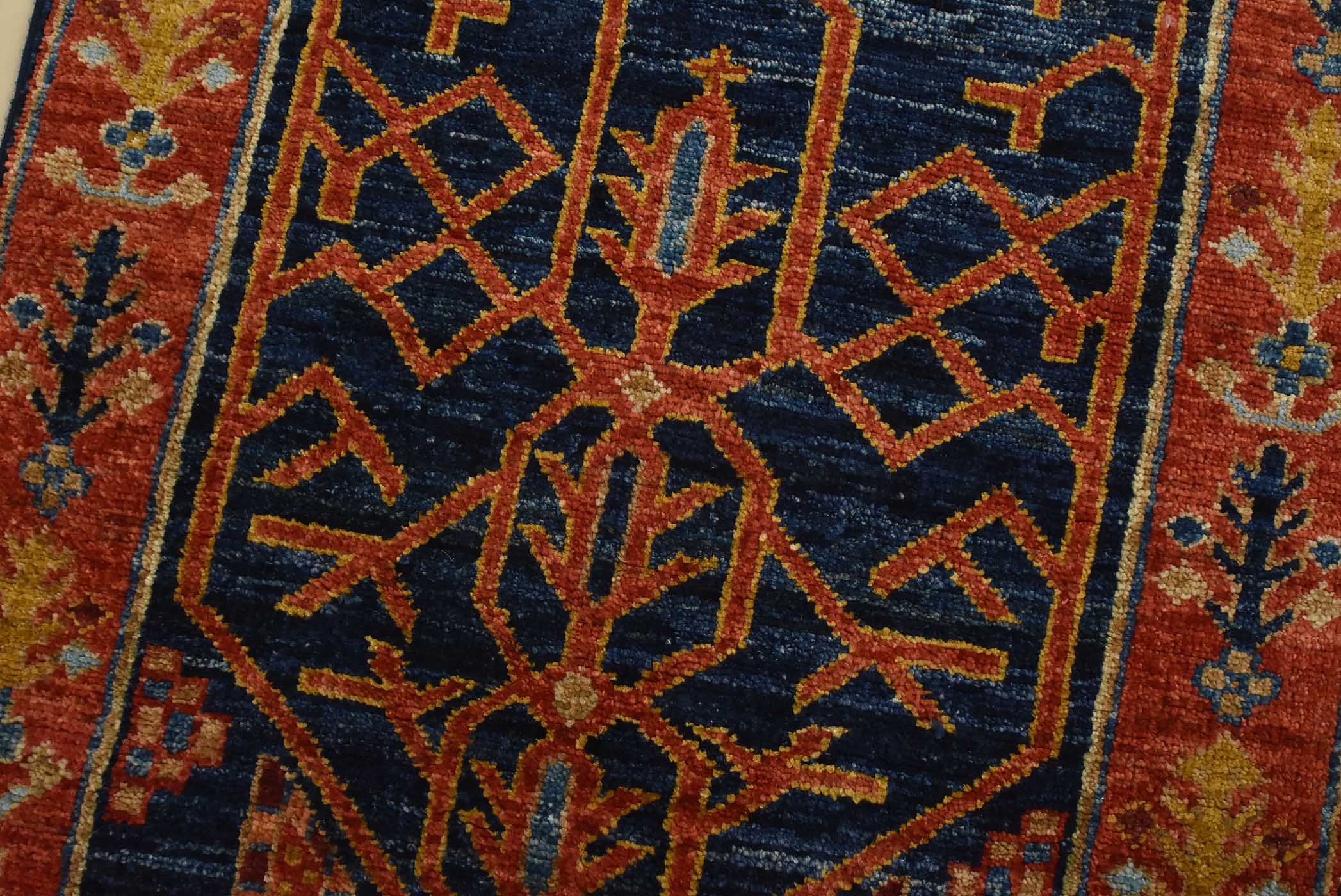 A tribal Heriz rug hand-knotted with fine wool on a cotton foundation. This oriental rug features a central geometric medallion surrounded by geometric motifs set against a dark blue background. It is new and in excellent condition.