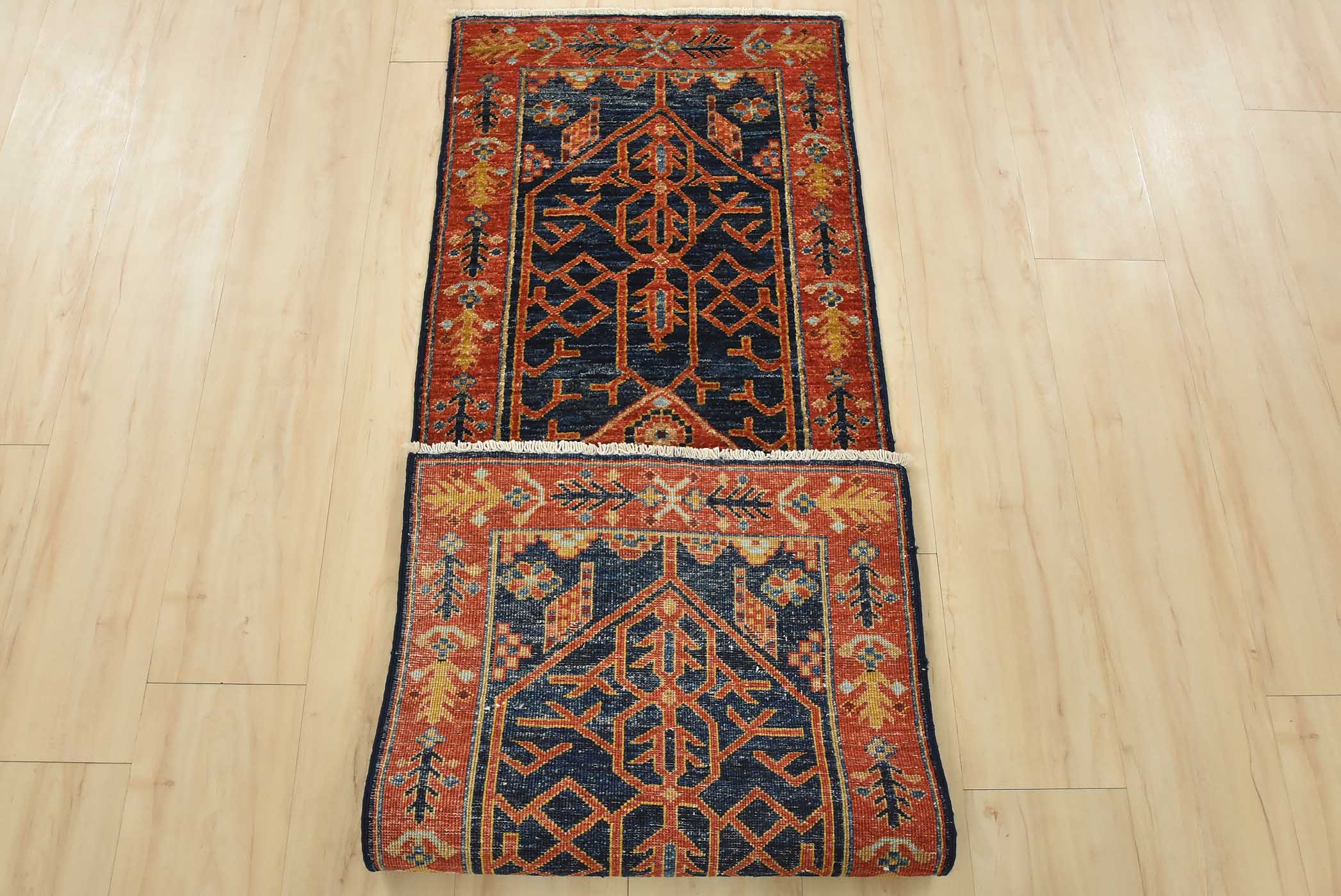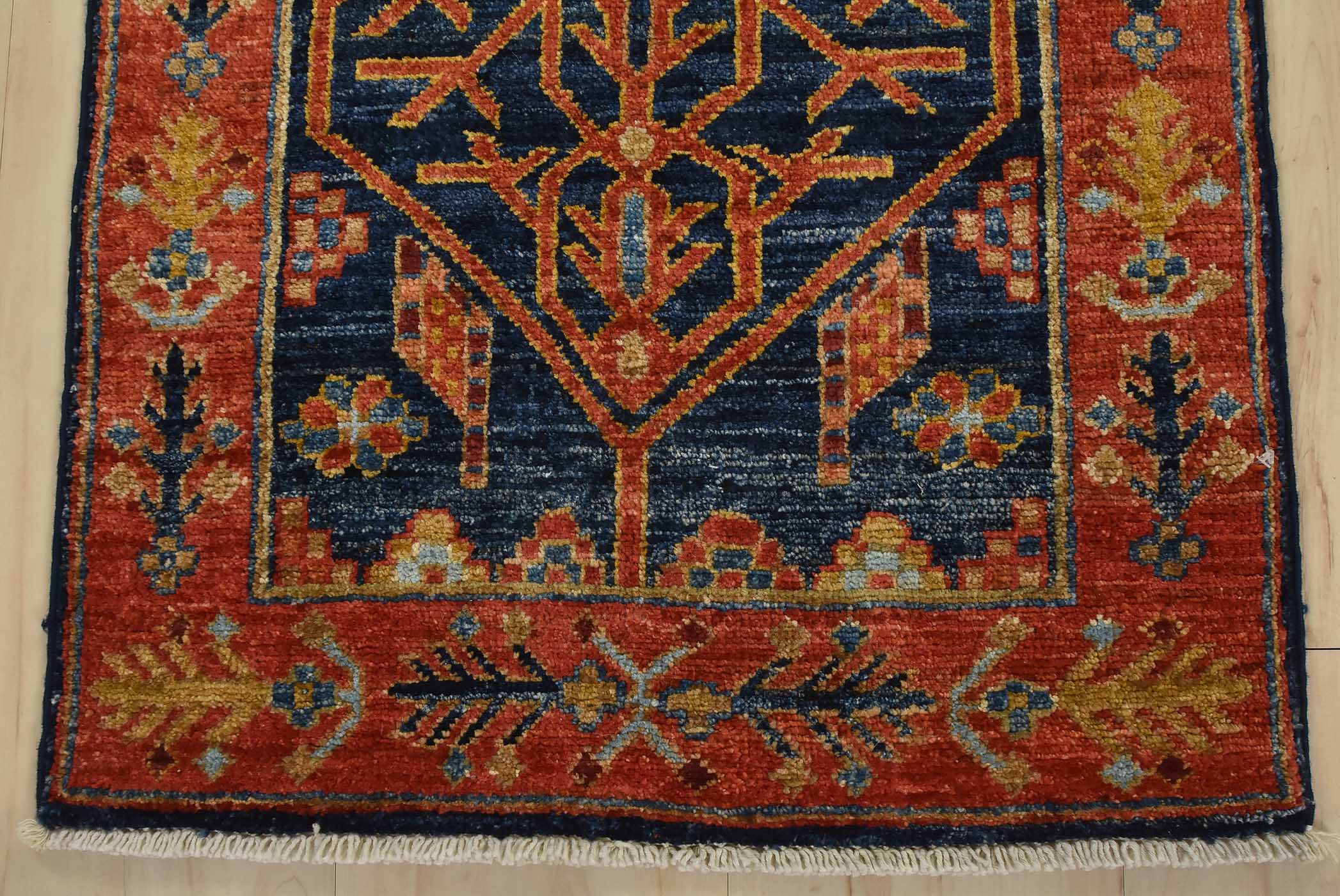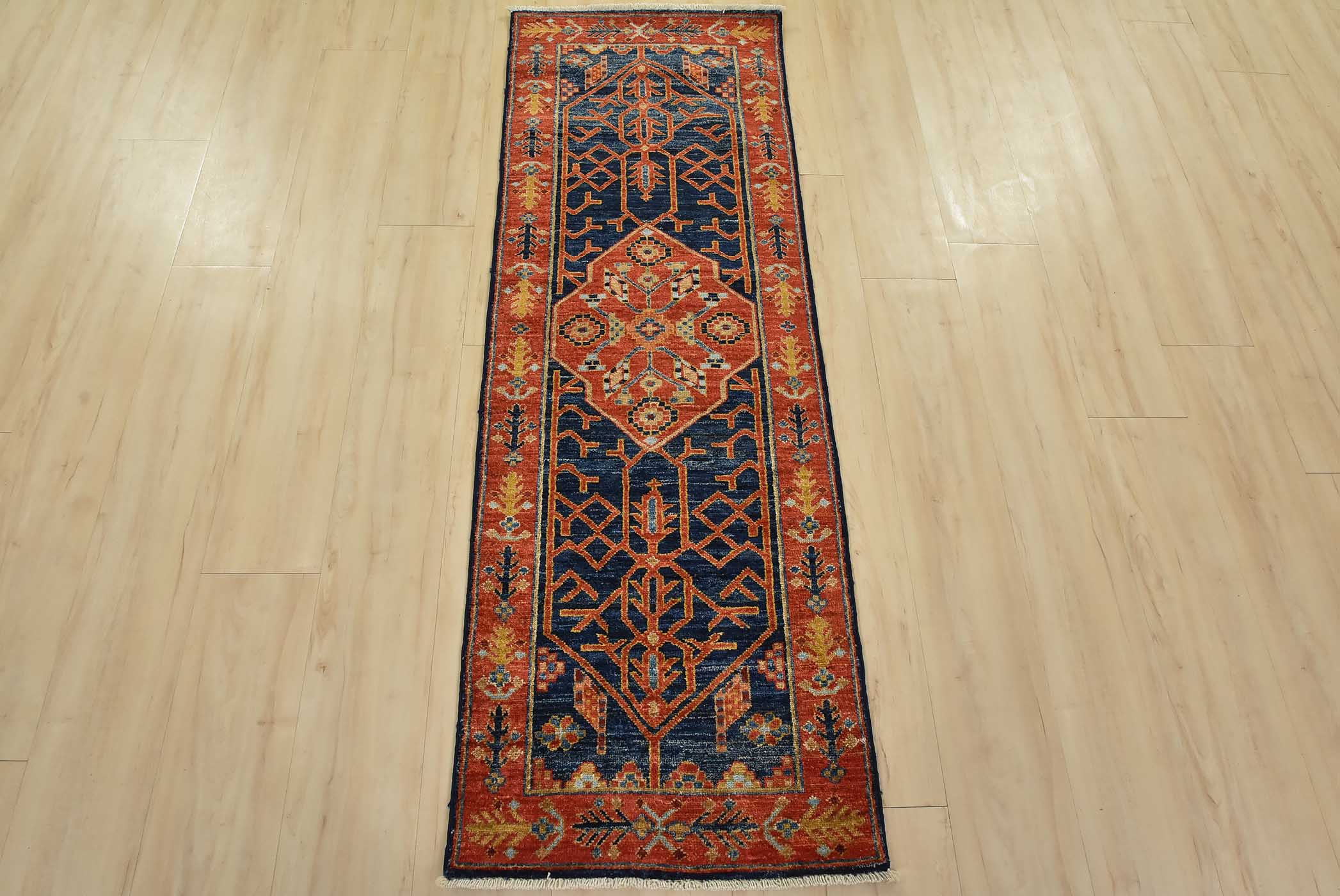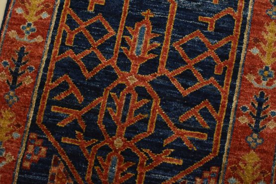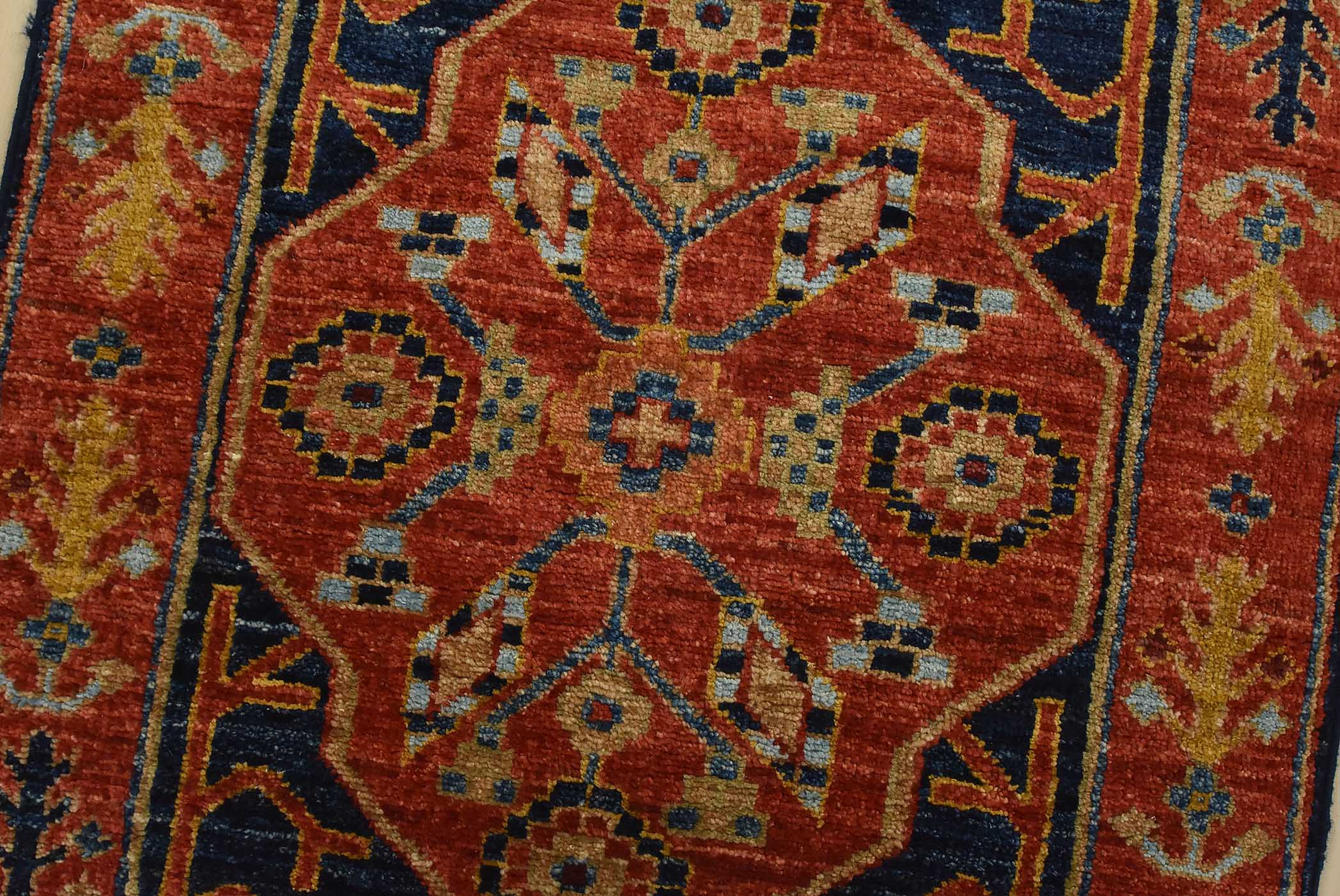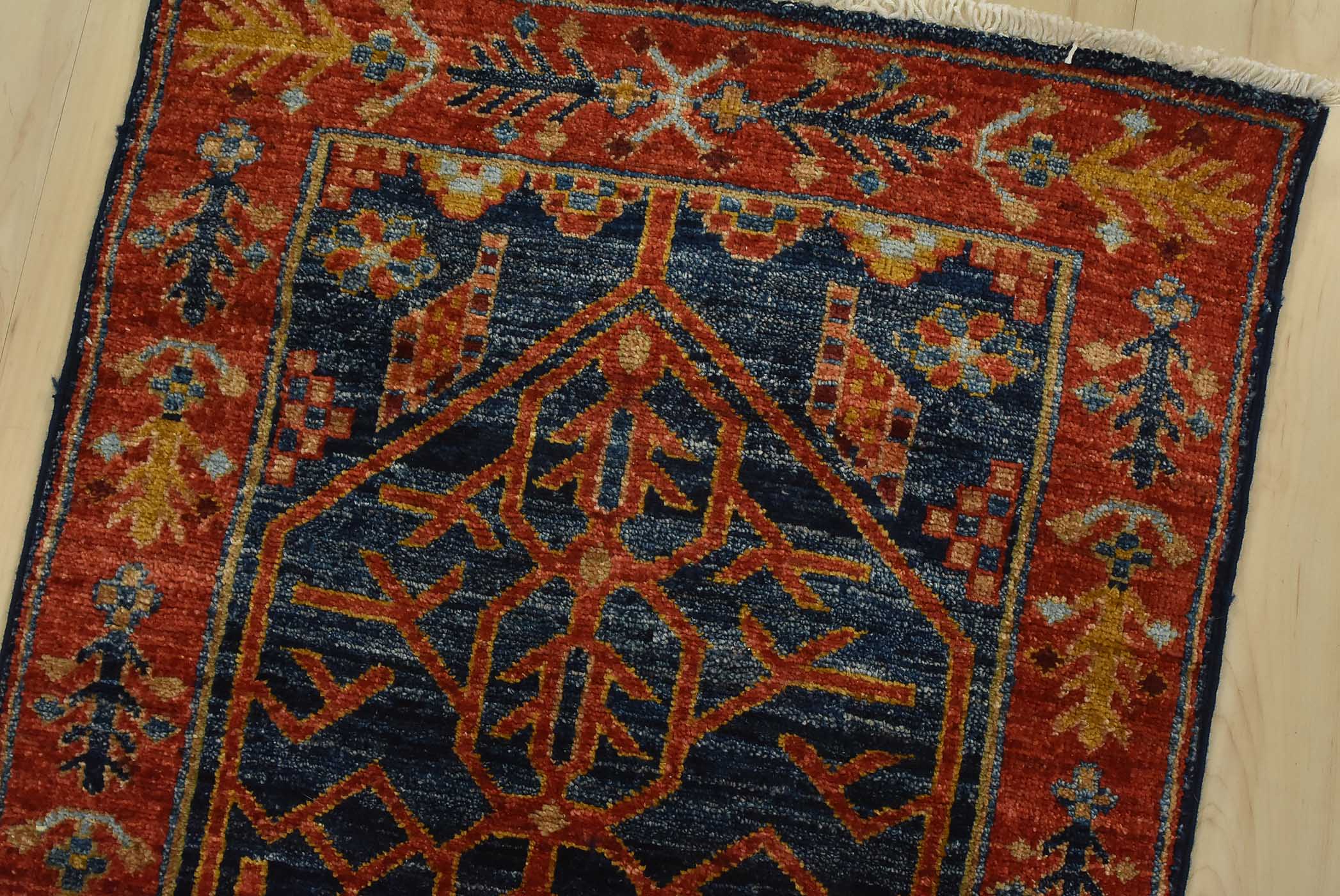 A tribal Heriz rug hand-knotted with fine wool on a cotton foundation. This oriental rug features a central geometric medallion surrounded by geometric motifs set against a dark blue background. It is new and in excellent condition.