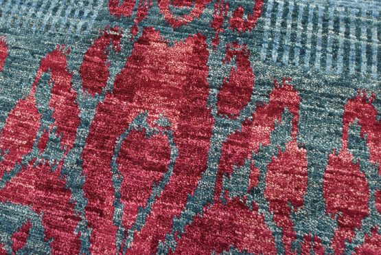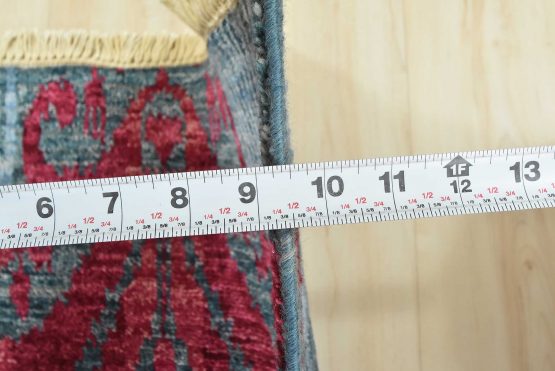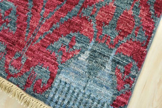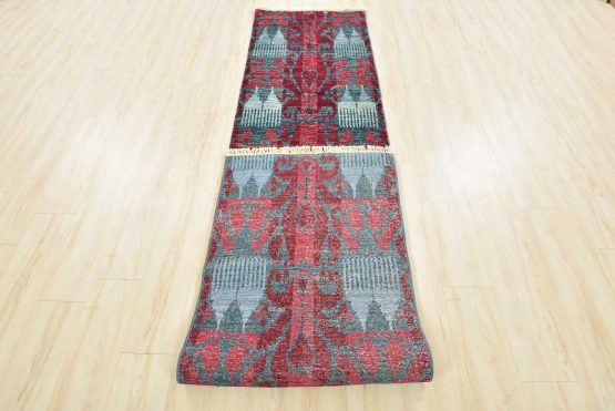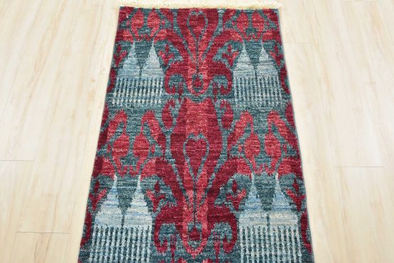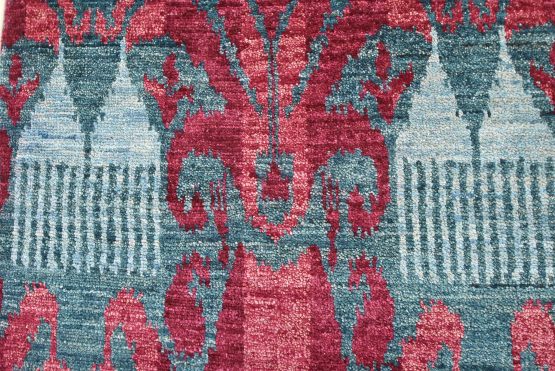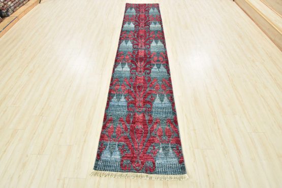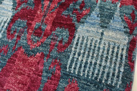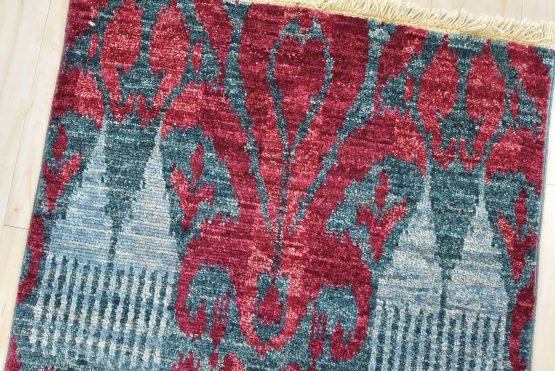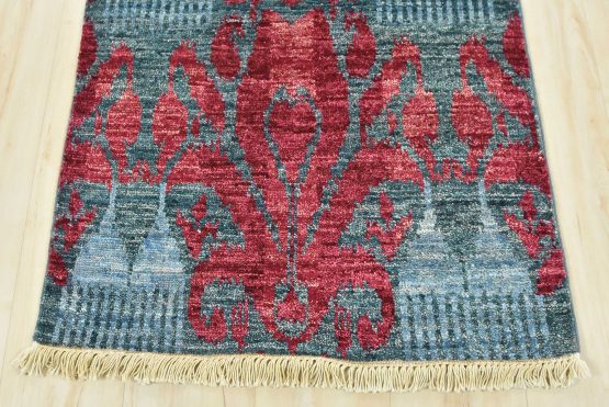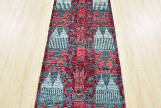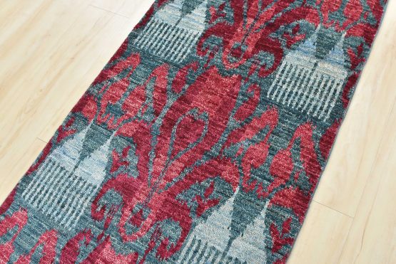 A modern traditional Ikat runner hand-knotted with an all-wool pile on a cotton foundation. This oriental rug features an Ikat design made of botanical motifs set against a blue background. It is new and in excellent condition.