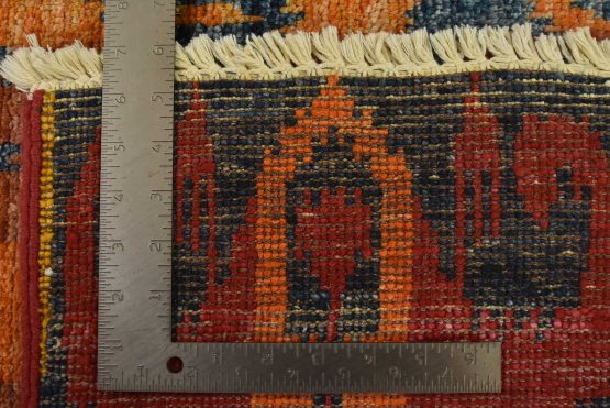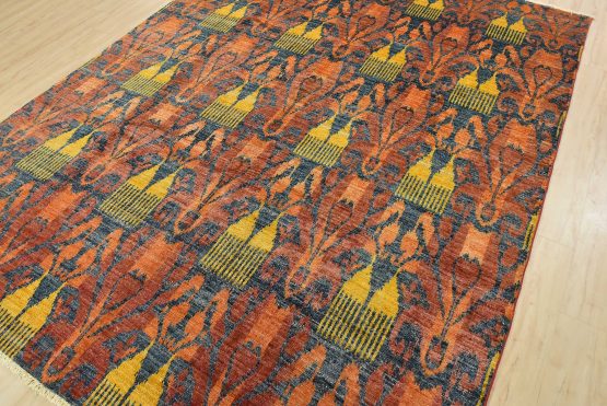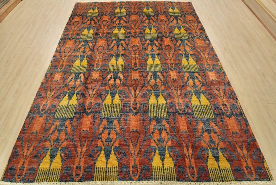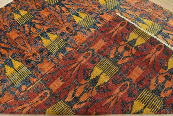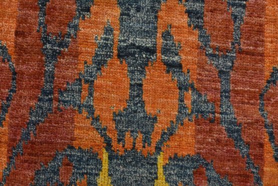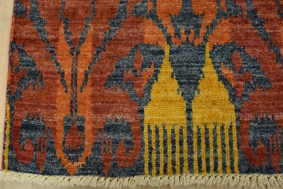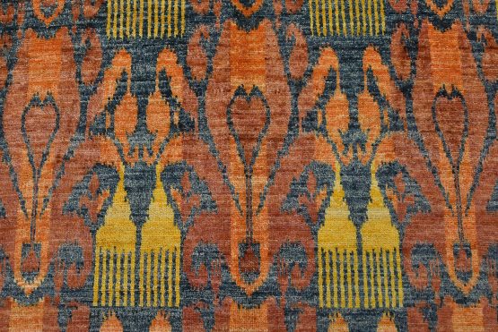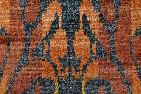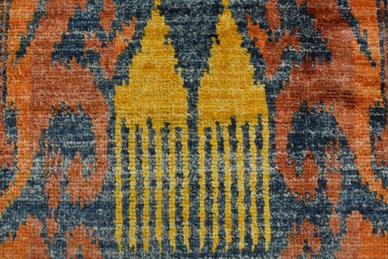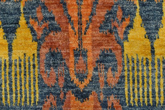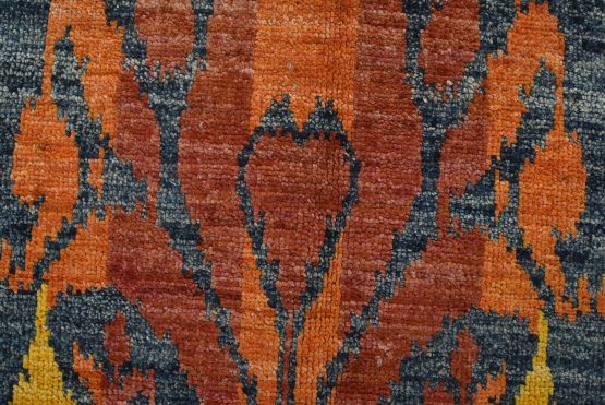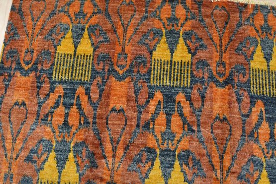 A modern Ikat rug hand-knotted with an all-wool pile on a cotton foundation. This oriental rug features an all-over ikat design made of botanical motifs set against a blue background. It is new and in excellent condition.