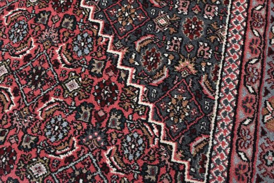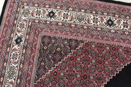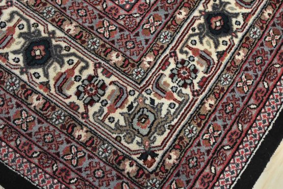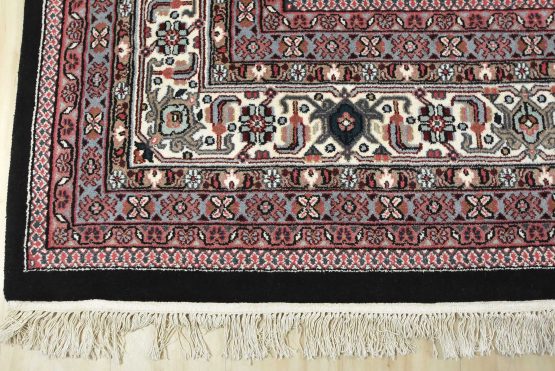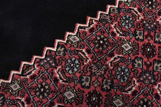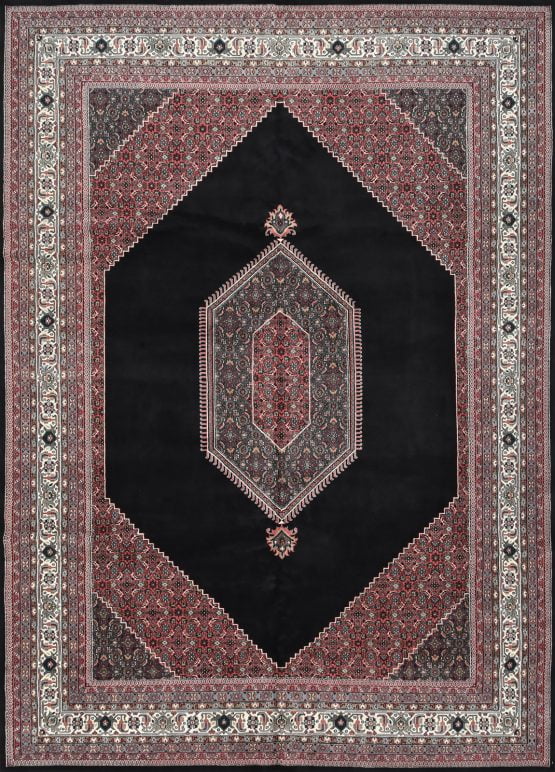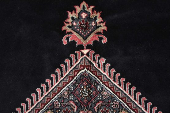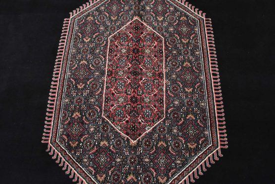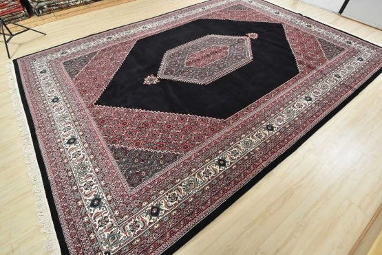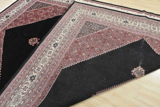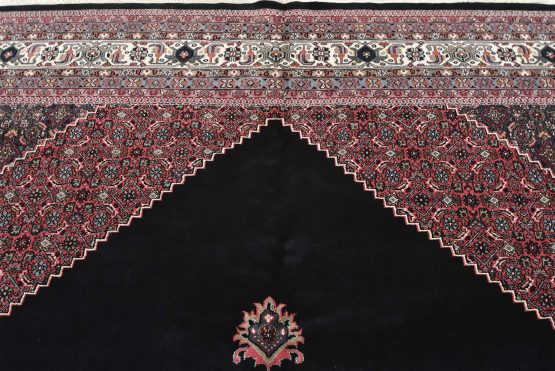 A vintage traditional Bidjar rug hand-knotted with an all-wool pile on a cotton foundation. This oriental rug features a central geometric medallion set against a solid black background. Additionally, an intricate Herati pattern is woven into the central medallion and spandrels. The rug has a full wool pile with no worn areas and is in very good condition.