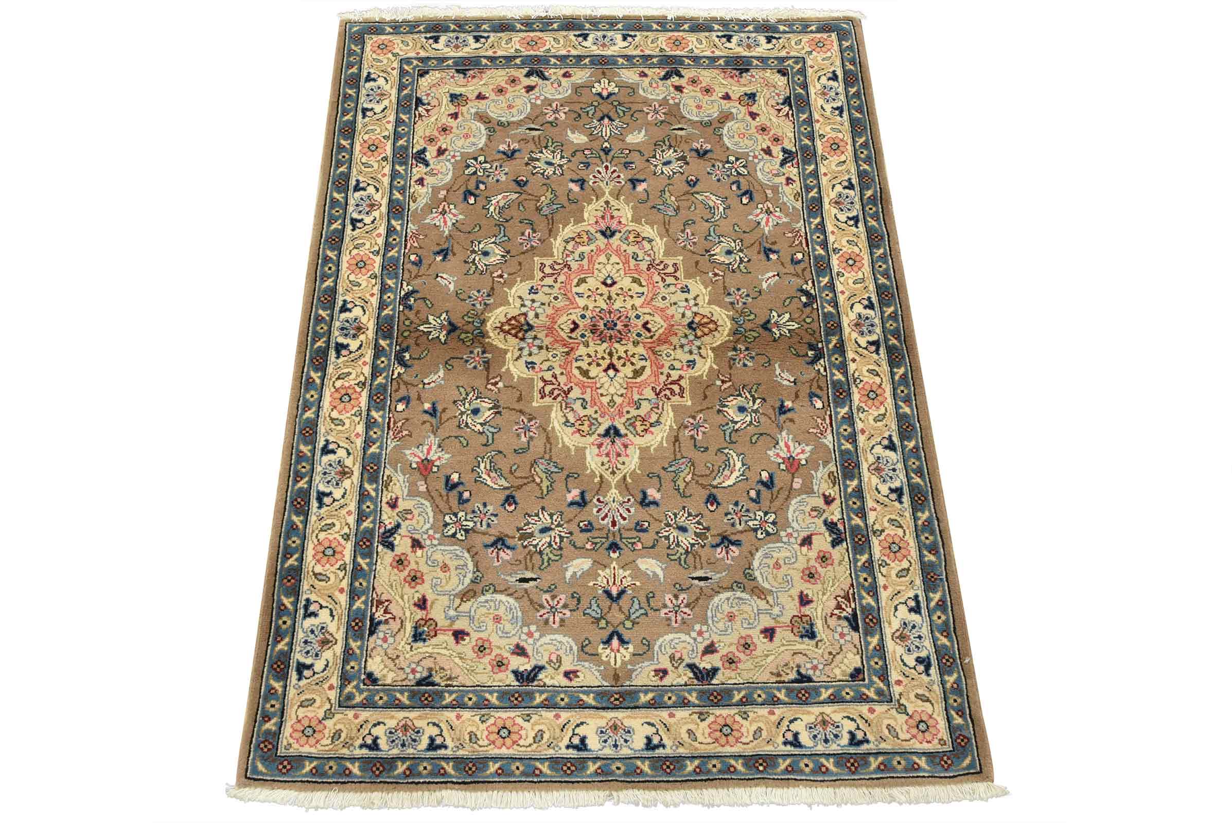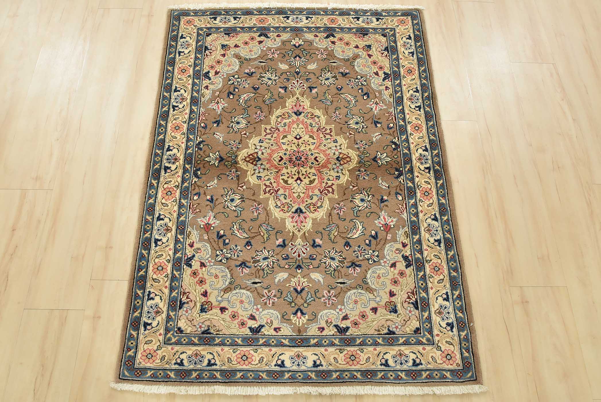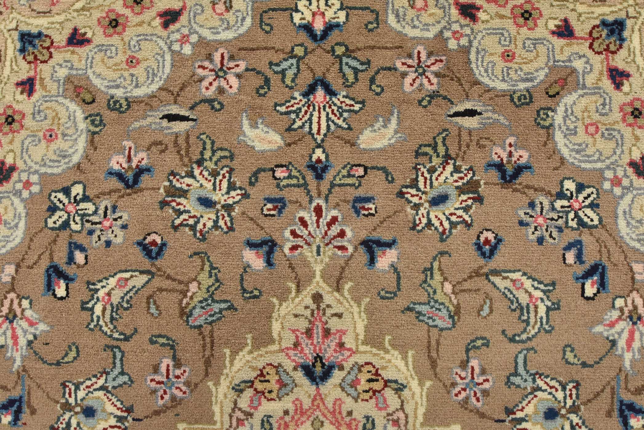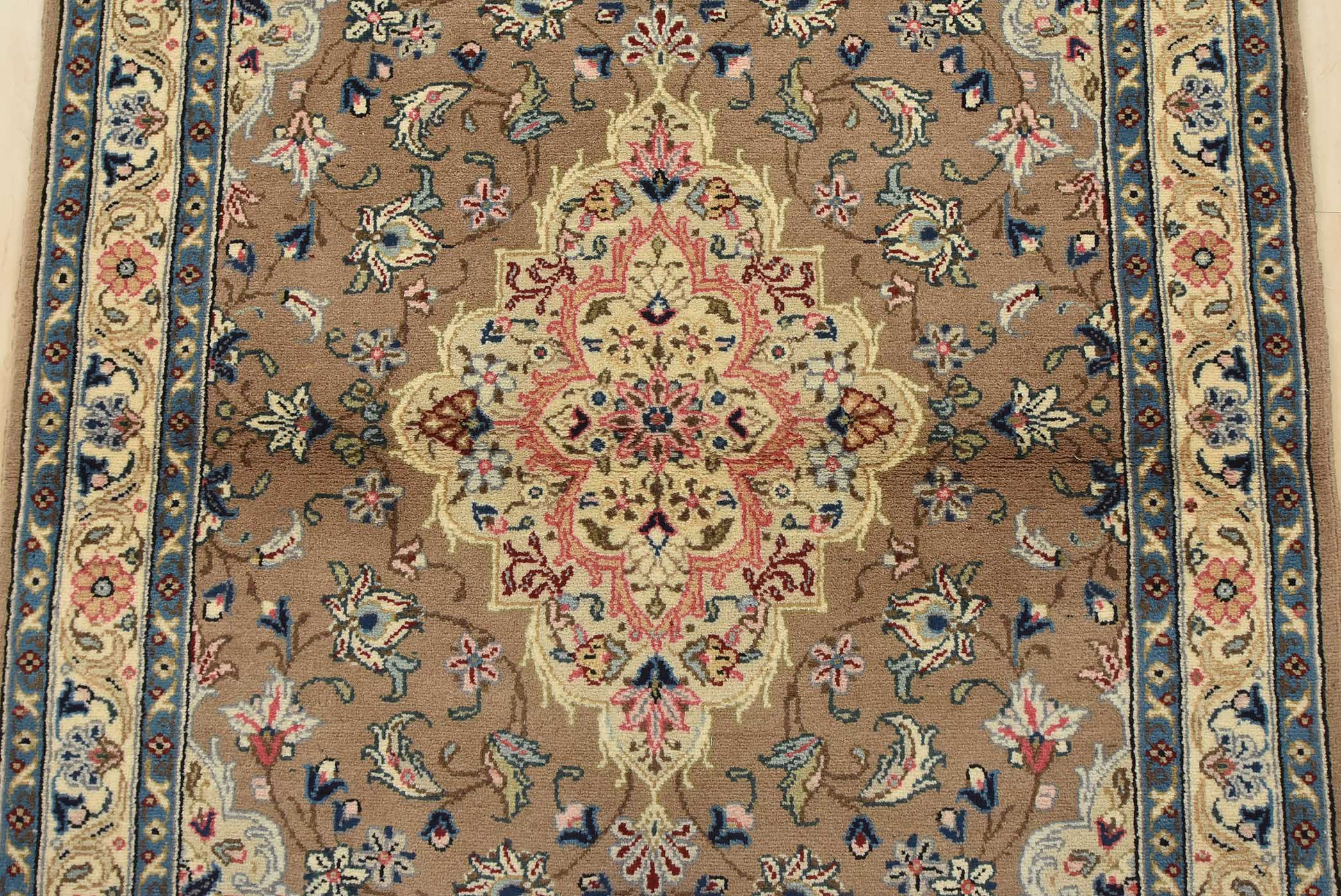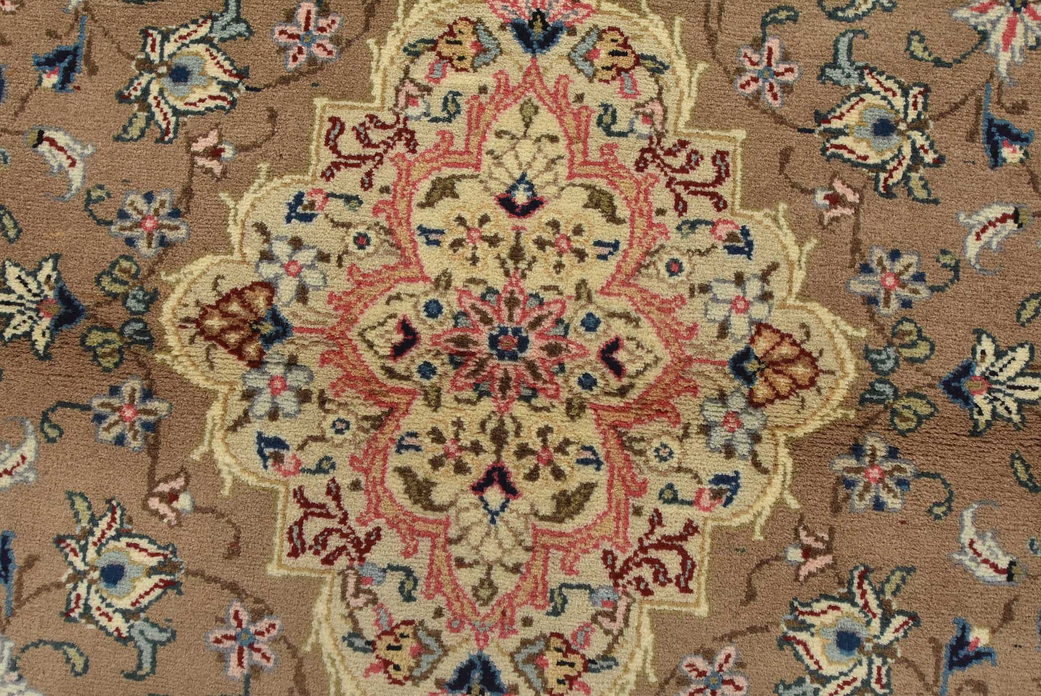 An authentic vintage traditional Kashan rug hand-knotted with fine wool and natural dyes. This intricately woven rug features a central medallion surrounded by a floral design set against a brown background. It has a full wool pile with no worn areas and is in very good condition.