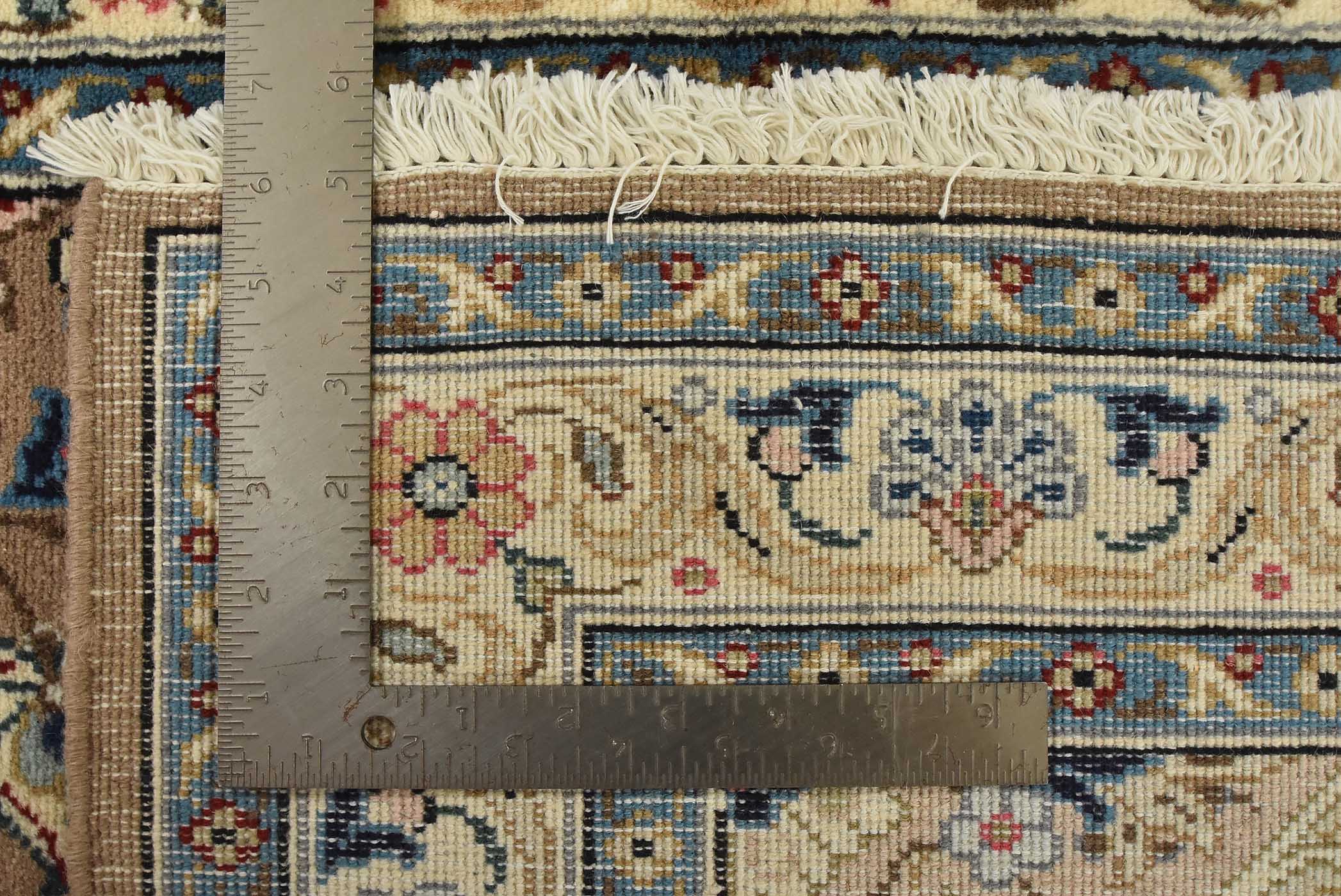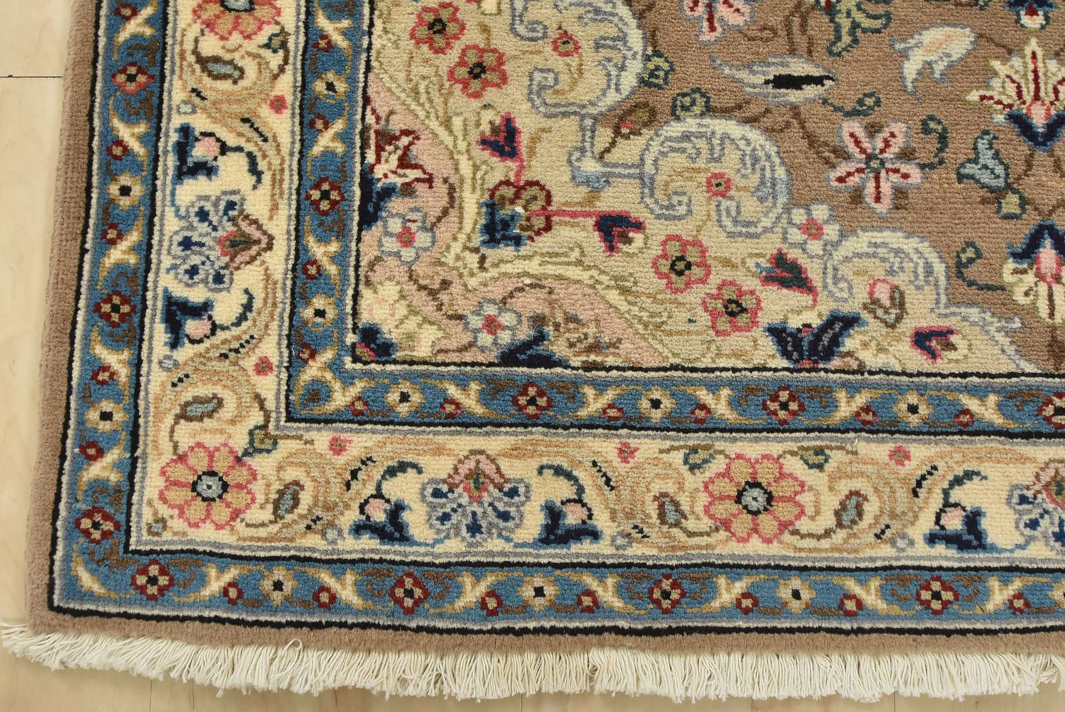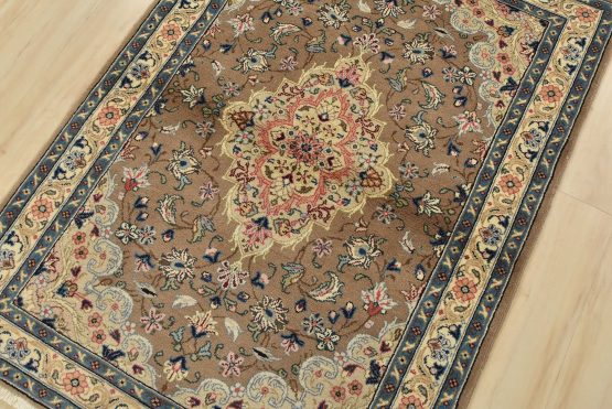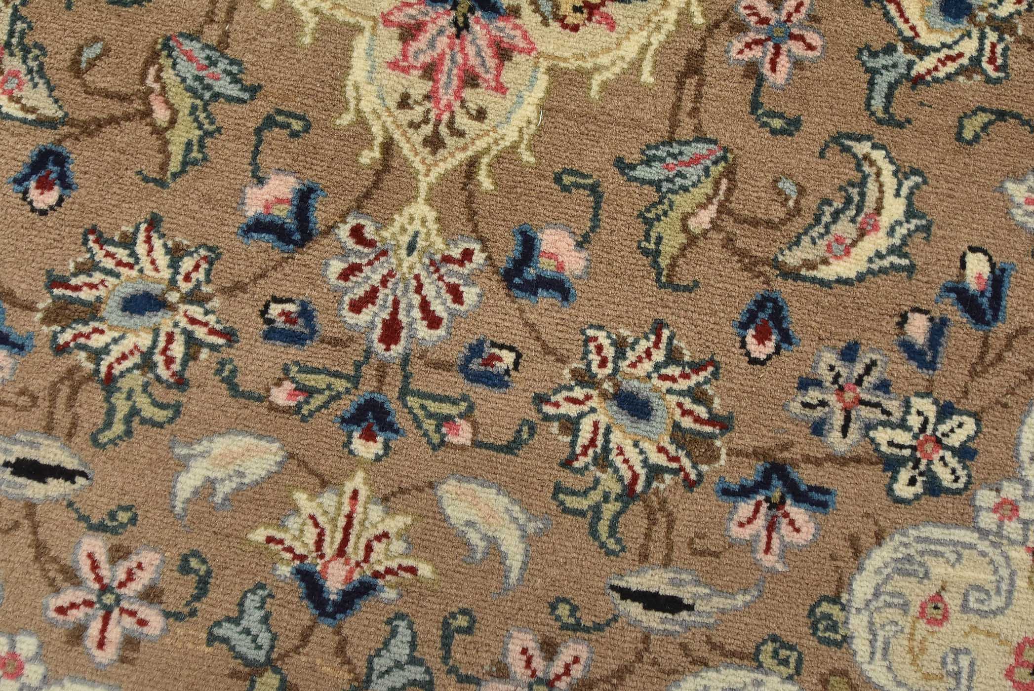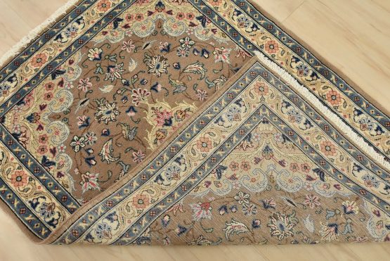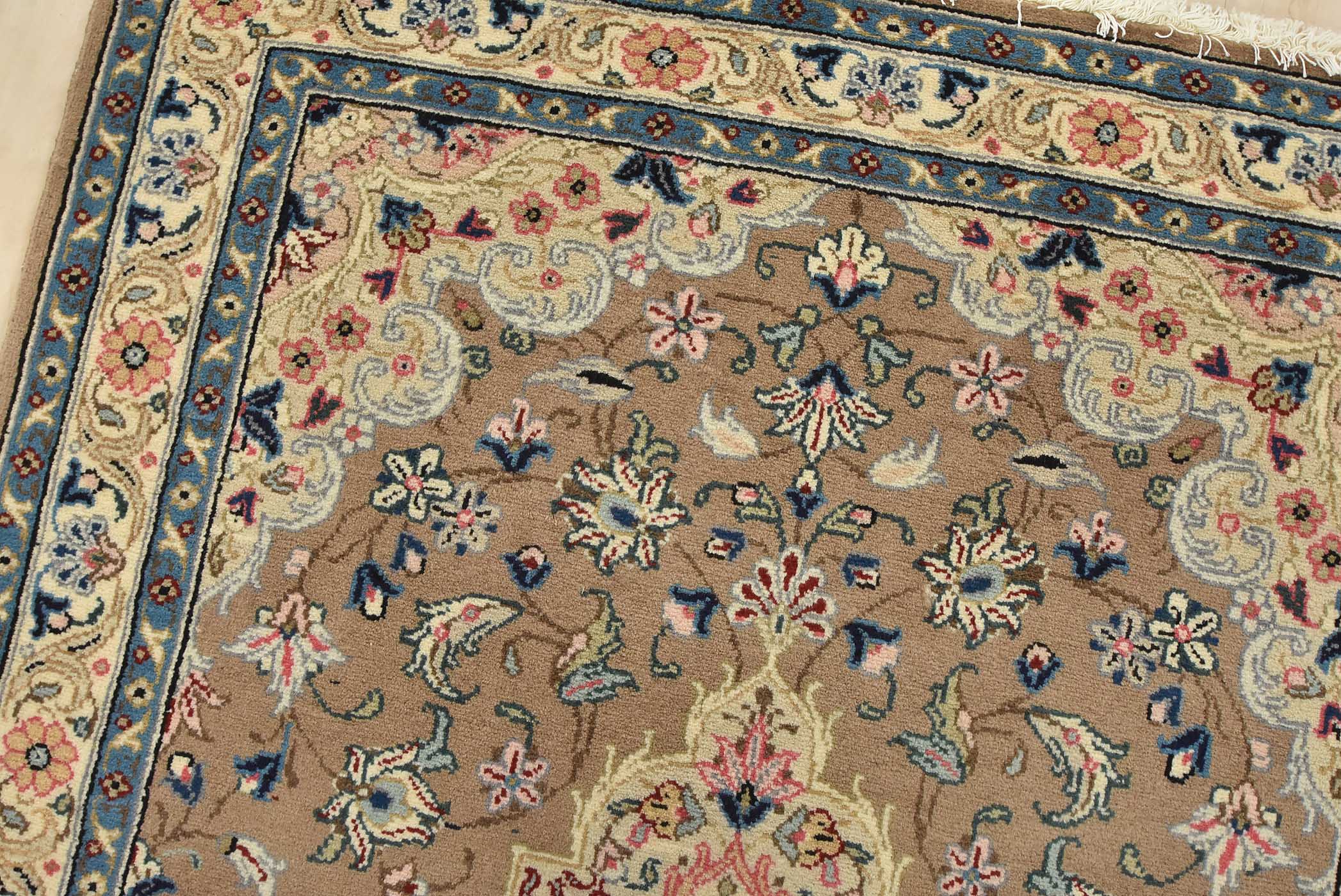 An authentic vintage traditional Kashan rug hand-knotted with fine wool and natural dyes. This intricately woven rug features a central medallion surrounded by a floral design set against a brown background. It has a full wool pile with no worn areas and is in very good condition.