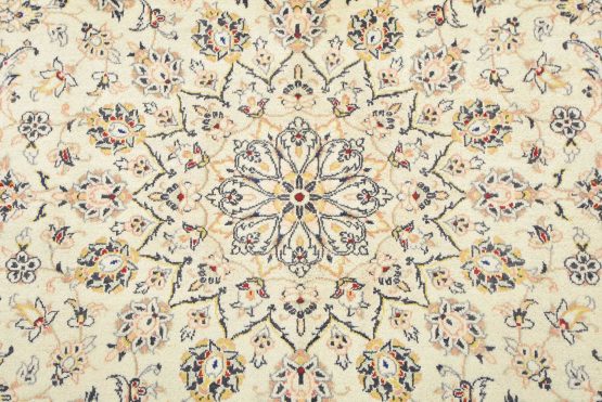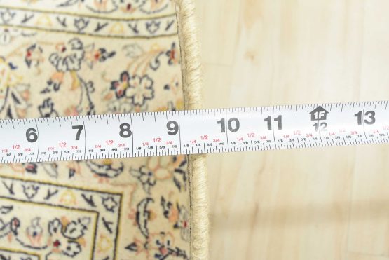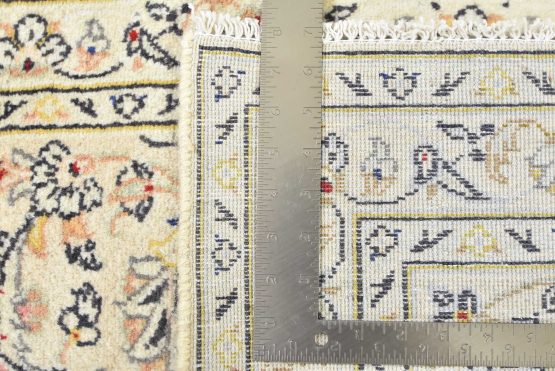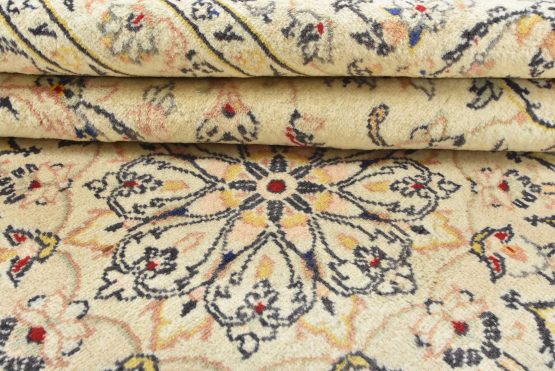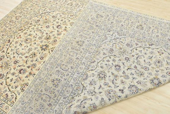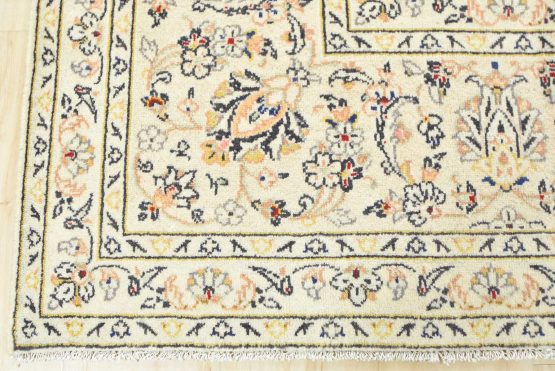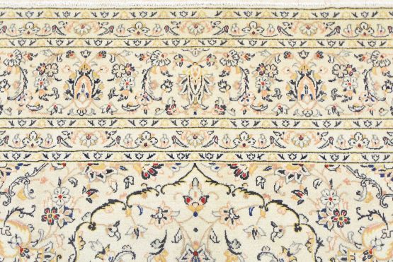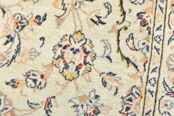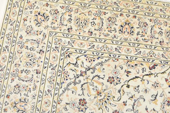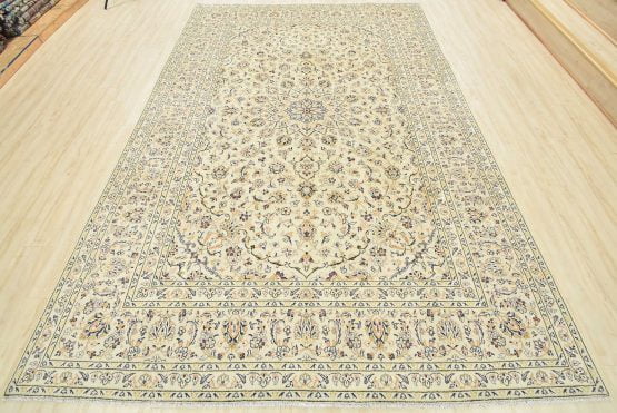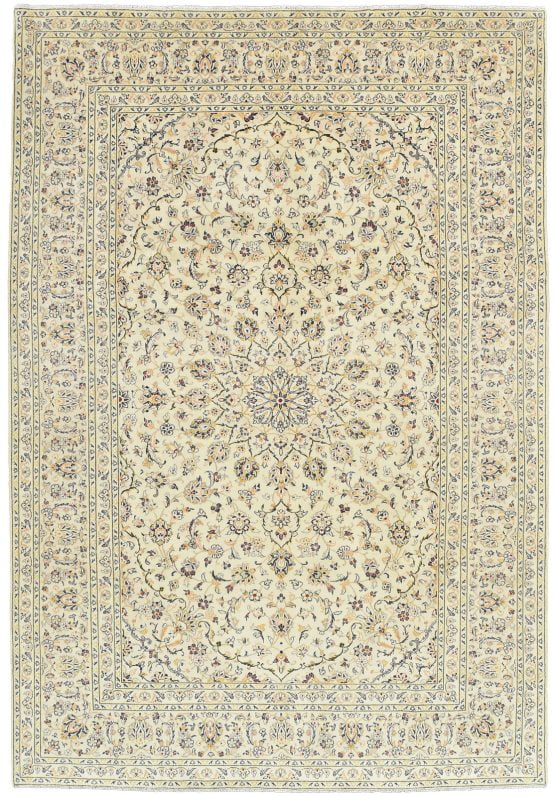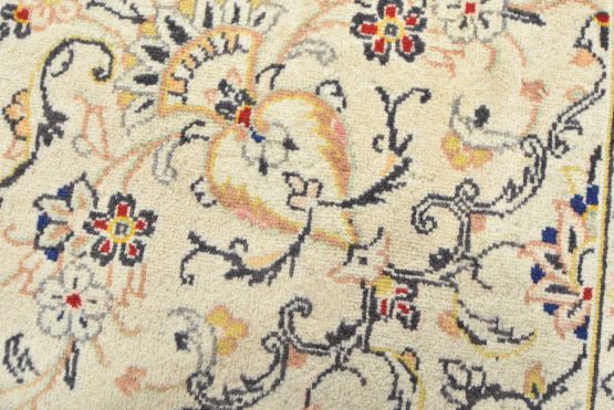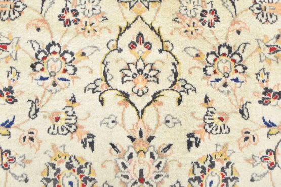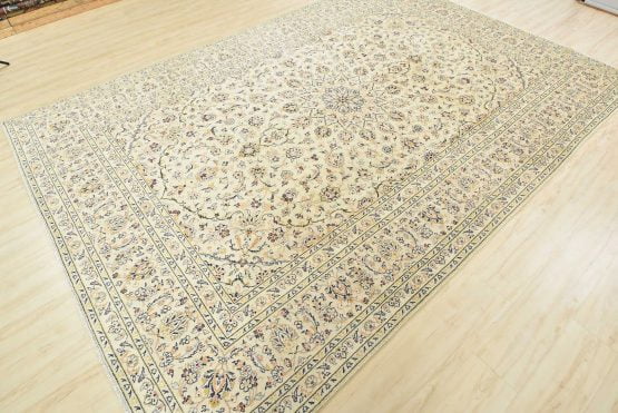 An authentic vintage traditional Kashan rug hand-knotted with fine wool and natural dyes. This oriental rug features a central medallion surrounded by a floral design set against an ivory background. The wool pile does show some minimal wear; please refer to the photos. Otherwise, this rug is in very good condition.