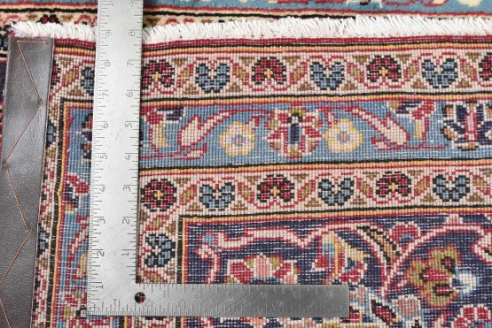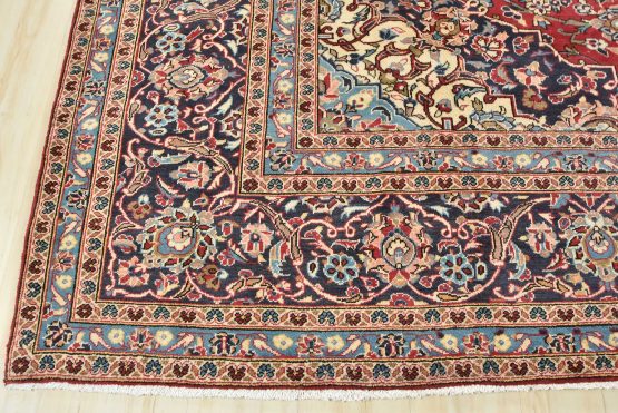 An authentic vintage traditional Kashan rug hand-knotted with fine wool and natural dyes. This oriental rug features a central medallion surrounded by a curvilinear floral pattern set against a red background. The wool pile shows some minor wear; please refer to the photos. Otherwise, the rug is in very good condition.