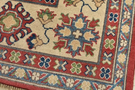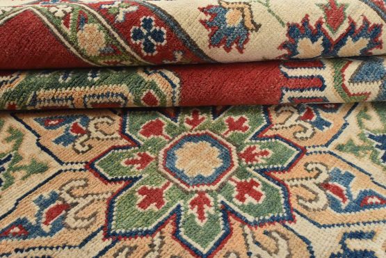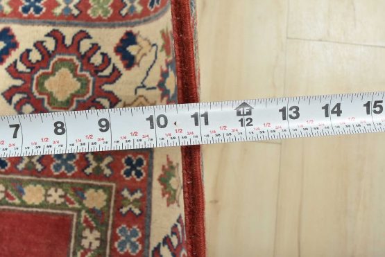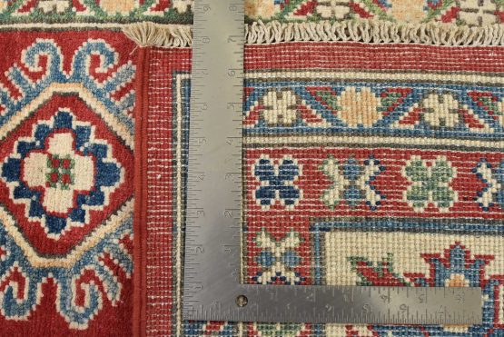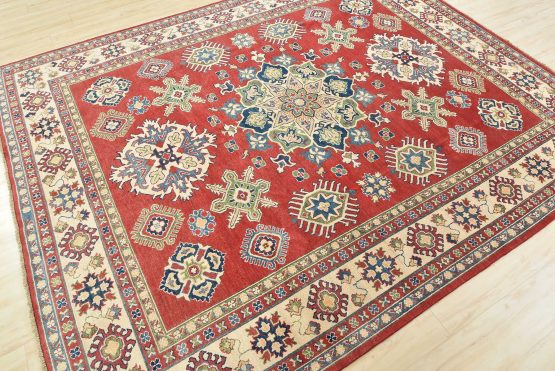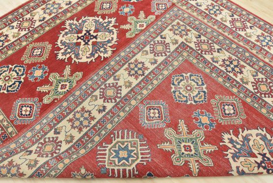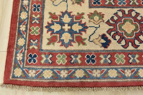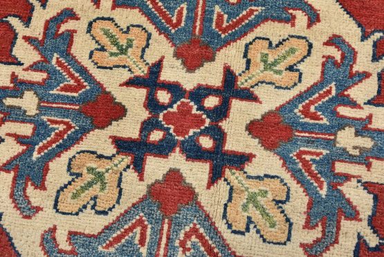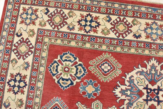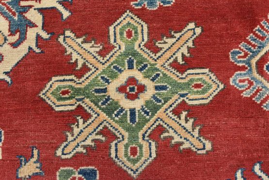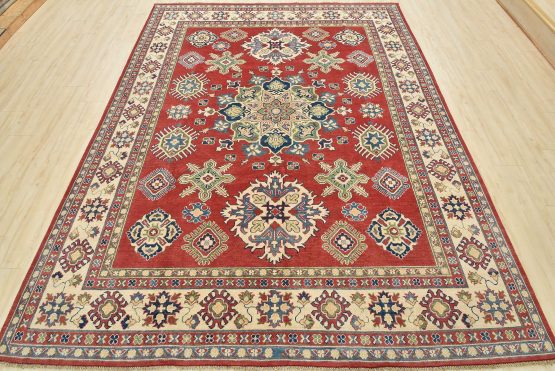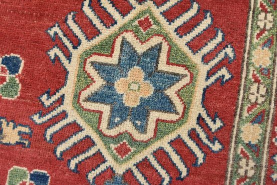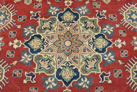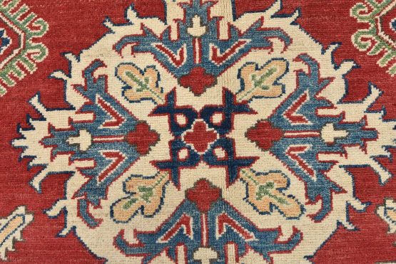 A traditional tribal Caucasian Kazak rug hand-knotted with an all-wool pile on a cotton foundation. This oriental rug features a central medallion surrounded by geometric motifs set against a red background. It is new and in excellent condition.