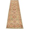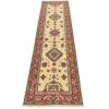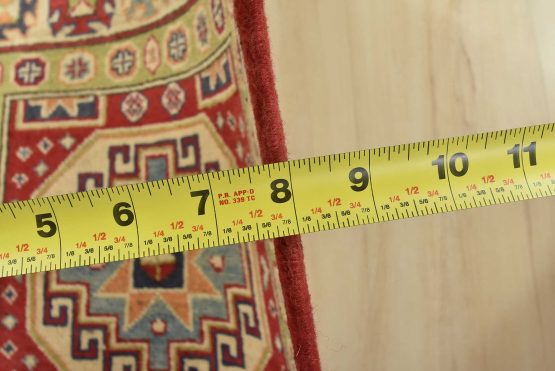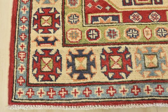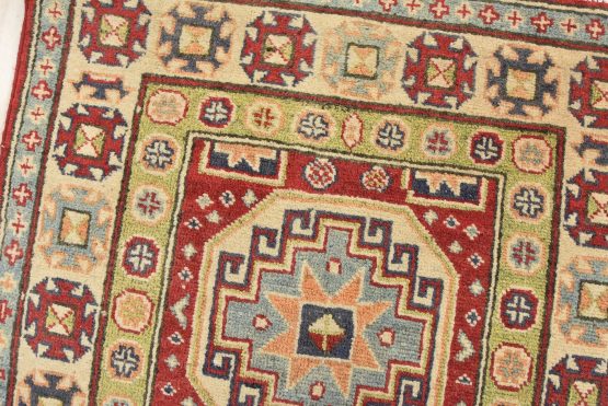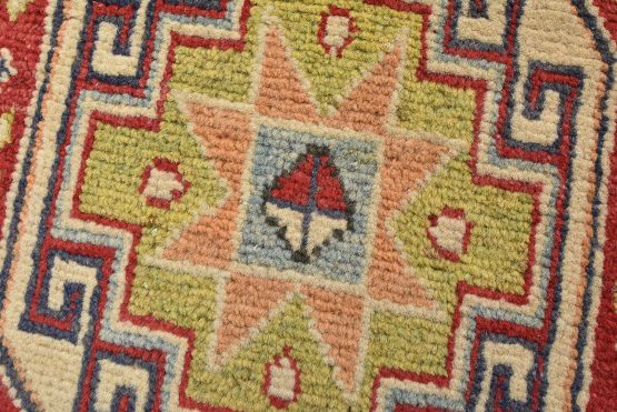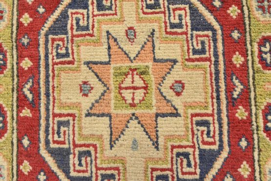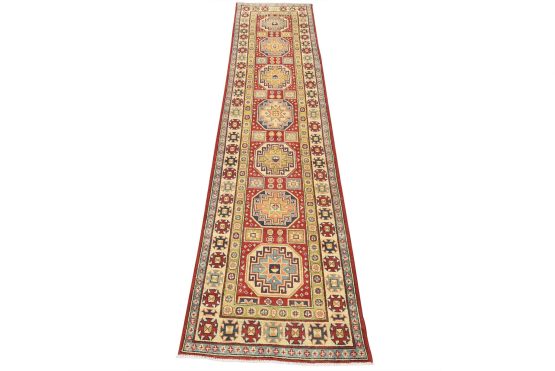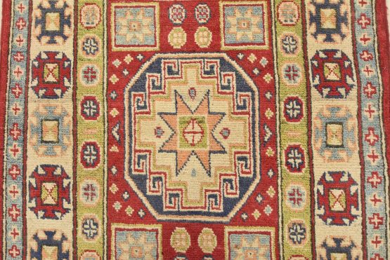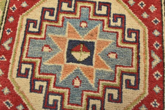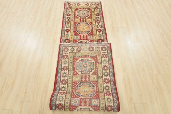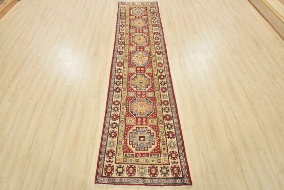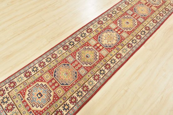 A tribal Caucasian Kazak runner hand-knotted with an all-wool pile on a cotton foundation. This oriental rug features a row of geometric medallions surrounded by small geometric motifs set against a red background. It is new and in excellent condition.