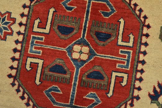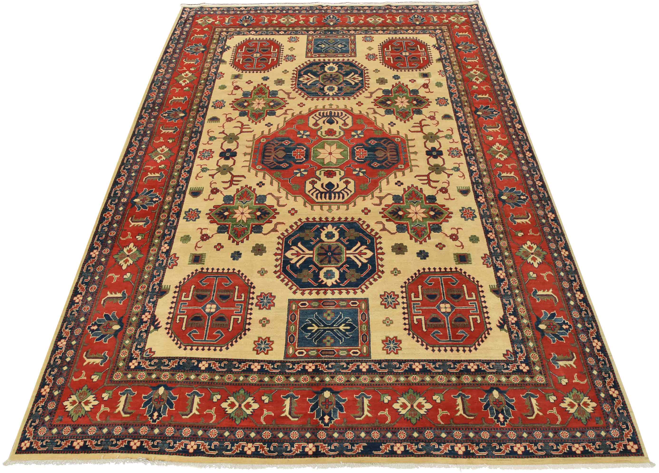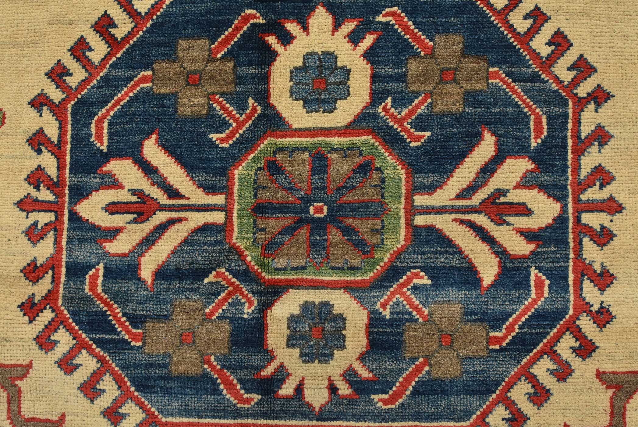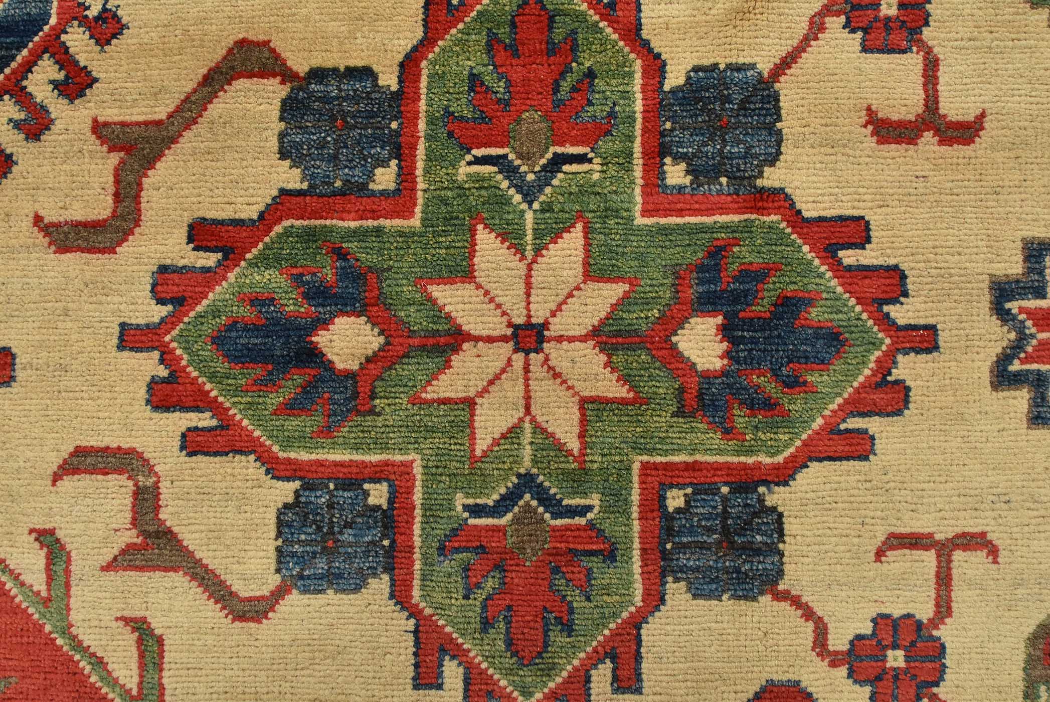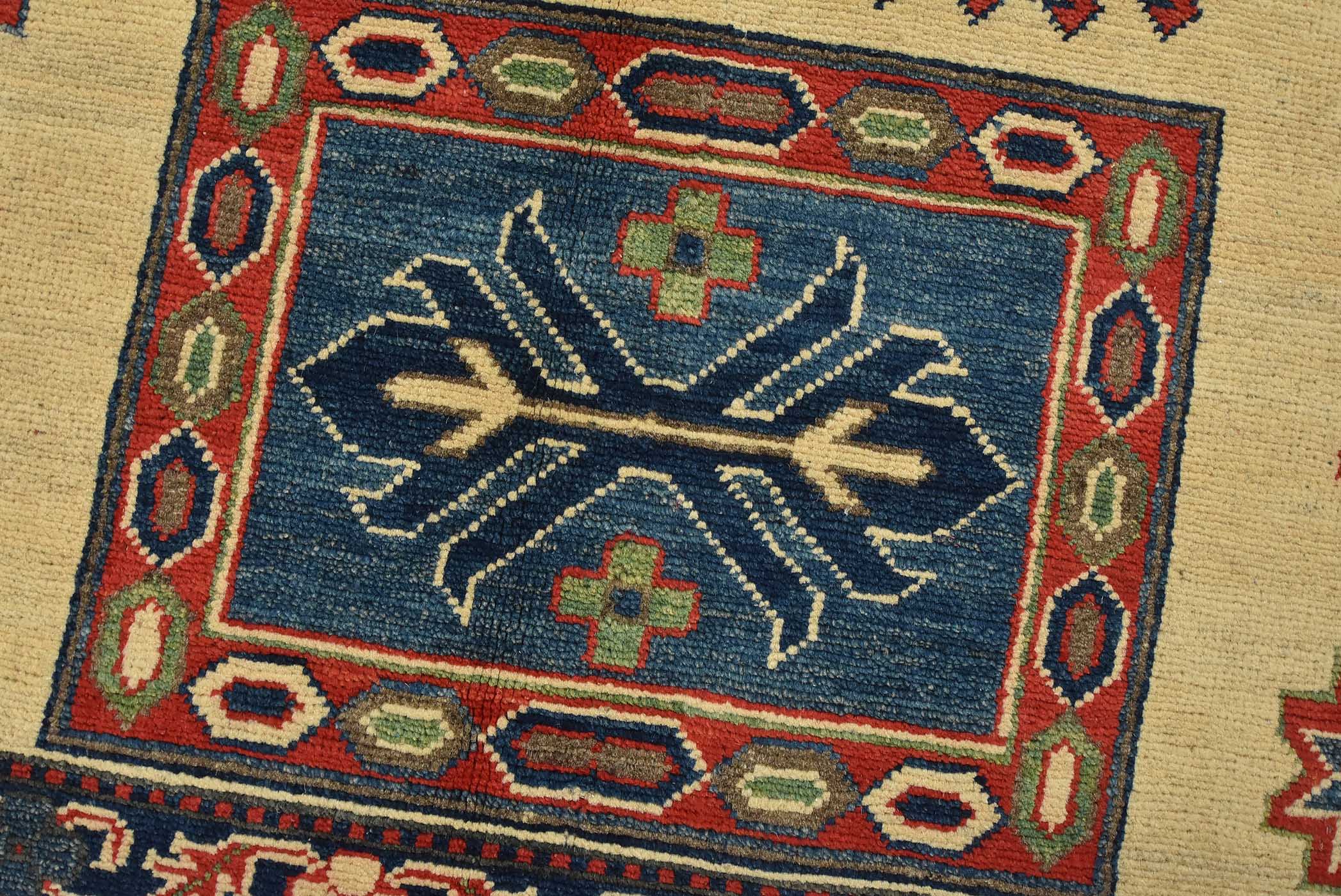 A tribal Kazak rug hand-knotted with fine wool on a cotton foundation. This oriental rug features a large central medallion surrounded by smaller geometric medallions set against a beige background. It is new and in excellent condition.