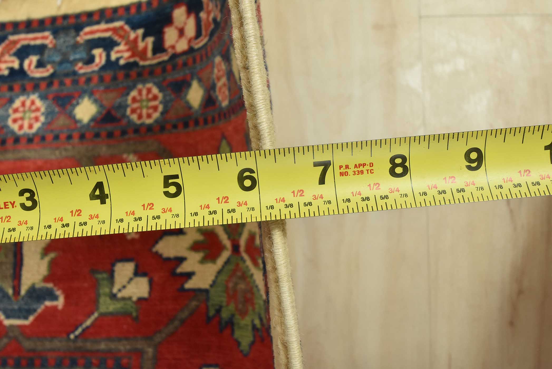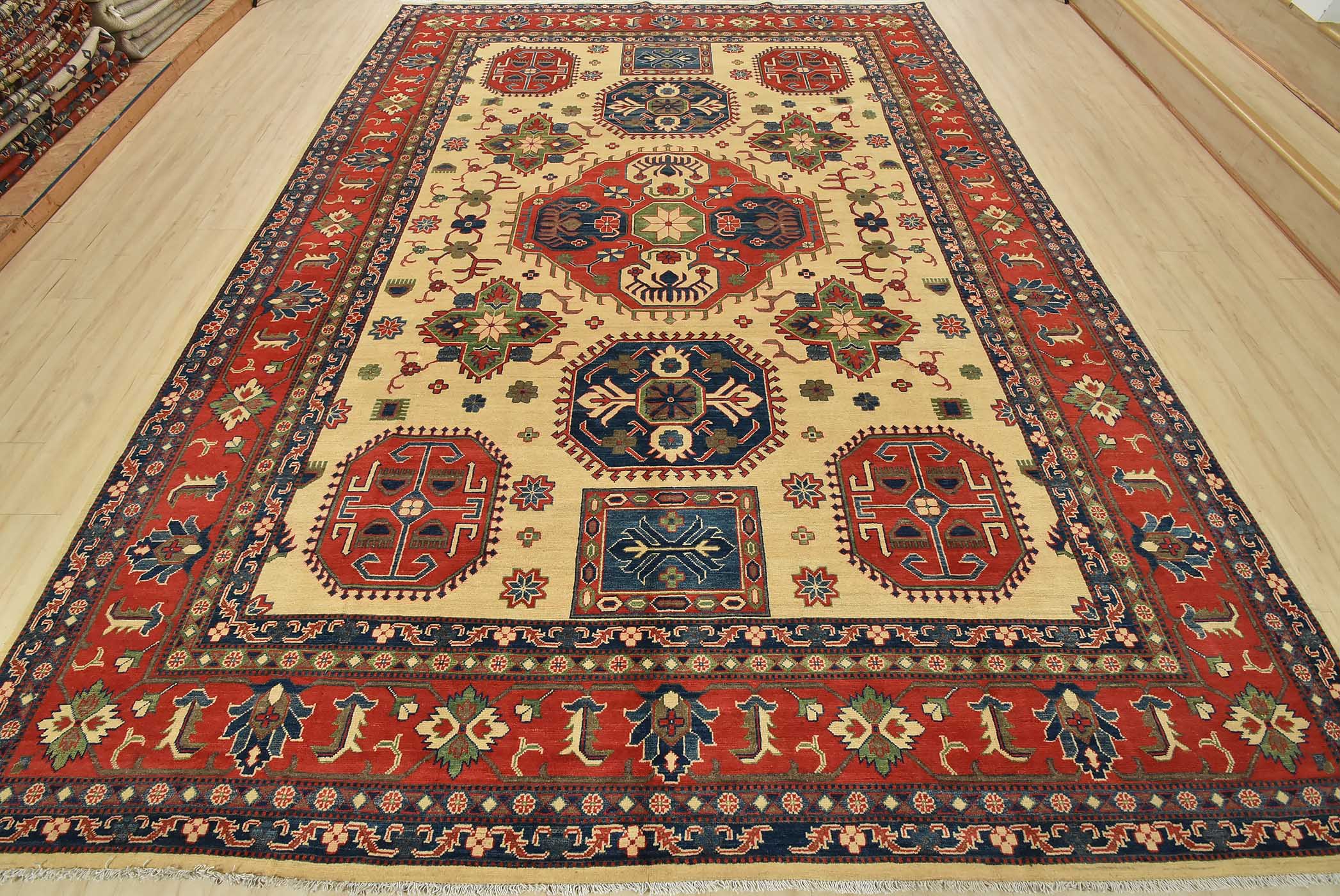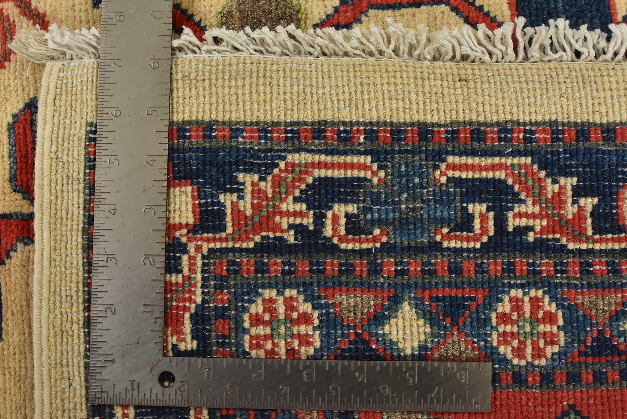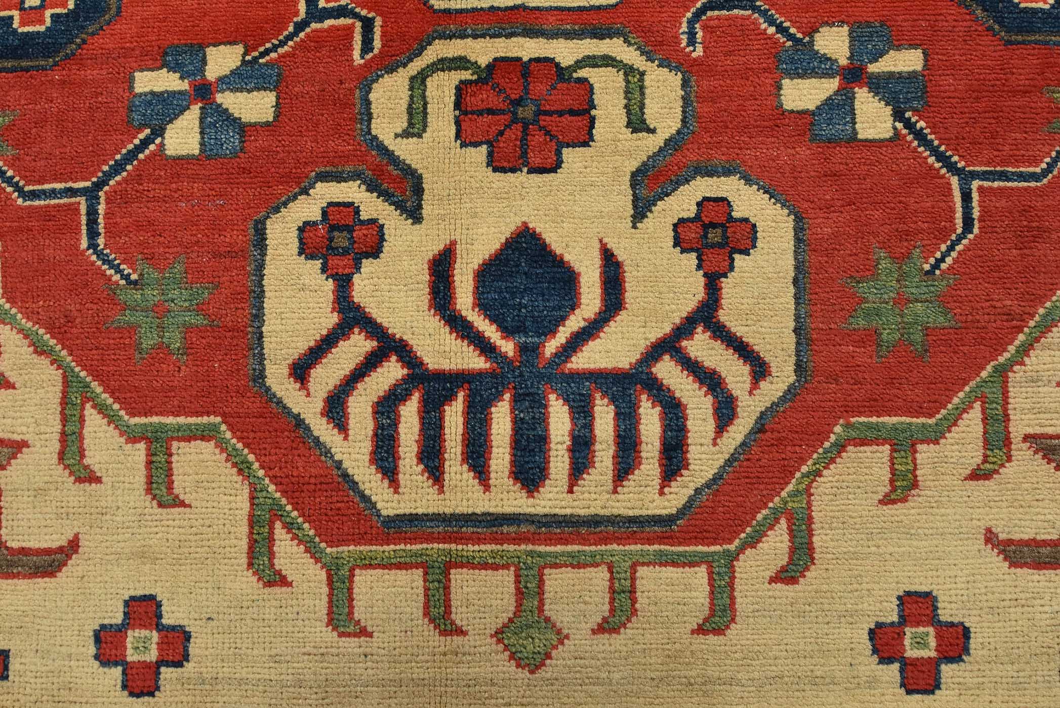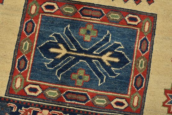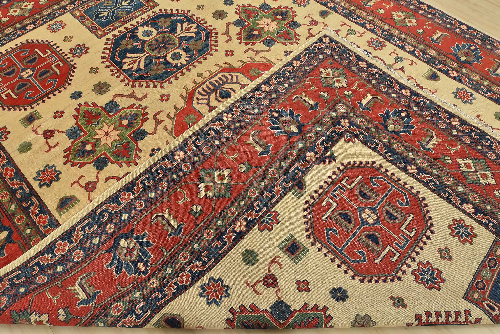 A tribal Kazak rug hand-knotted with fine wool on a cotton foundation. This oriental rug features a large central medallion surrounded by smaller geometric medallions set against a beige background. It is new and in excellent condition.