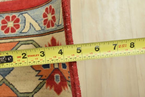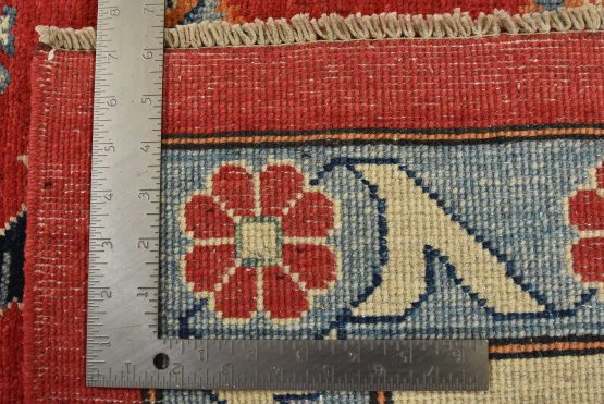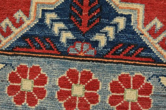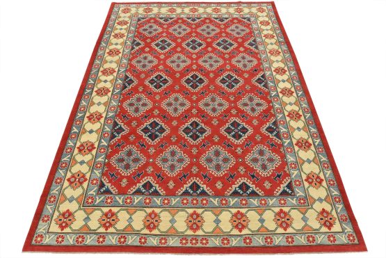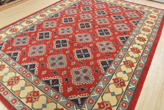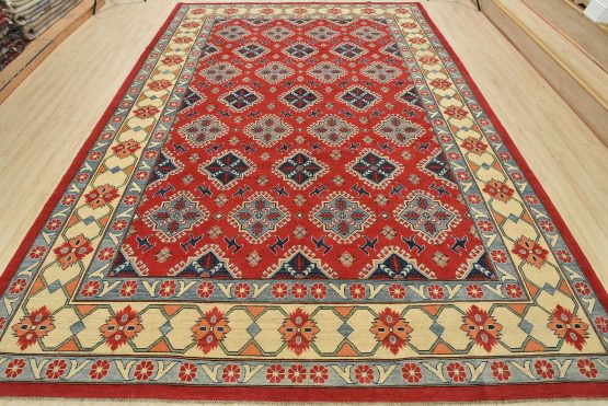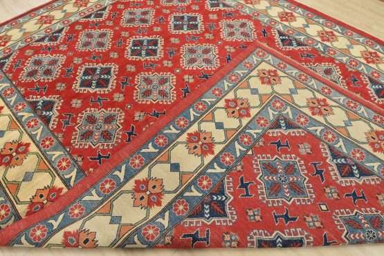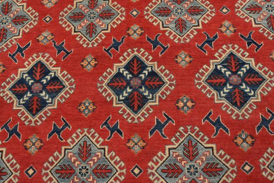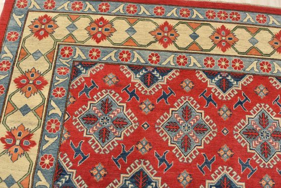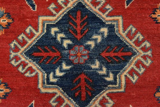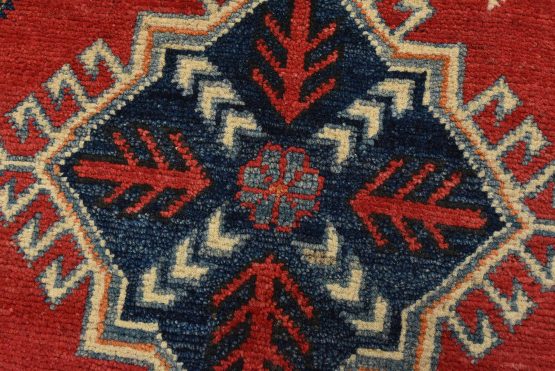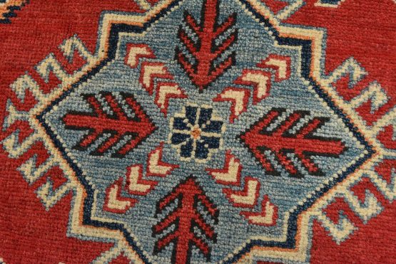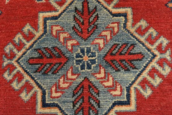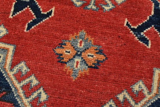 A tribal Caucasian Kazak rug hand-knotted with an all-wool pile on a cotton foundation. This oriental rug features an all-over pattern of geometric medallions set against a red background. It is new and in excellent condition.