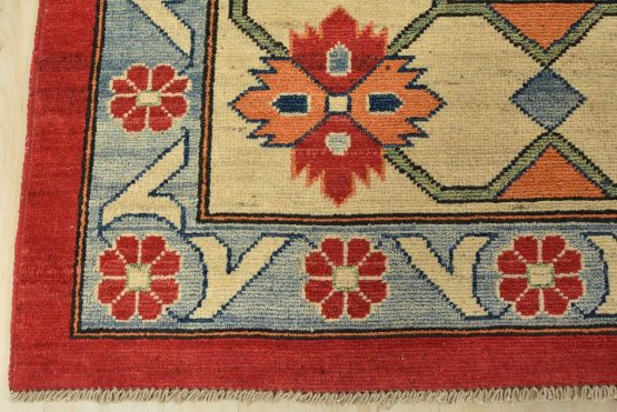 Original antique Kazak rugs from the Caucasus region inspire the creation of new Kazak rugs. These rugs are woven with fine wool using traditional Kazak patterns and finished with a low-cut pile to give them an authentic vintage look.