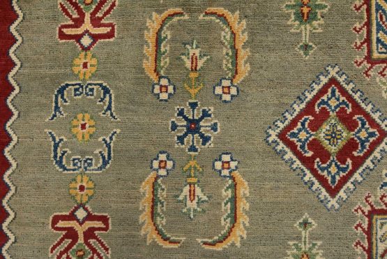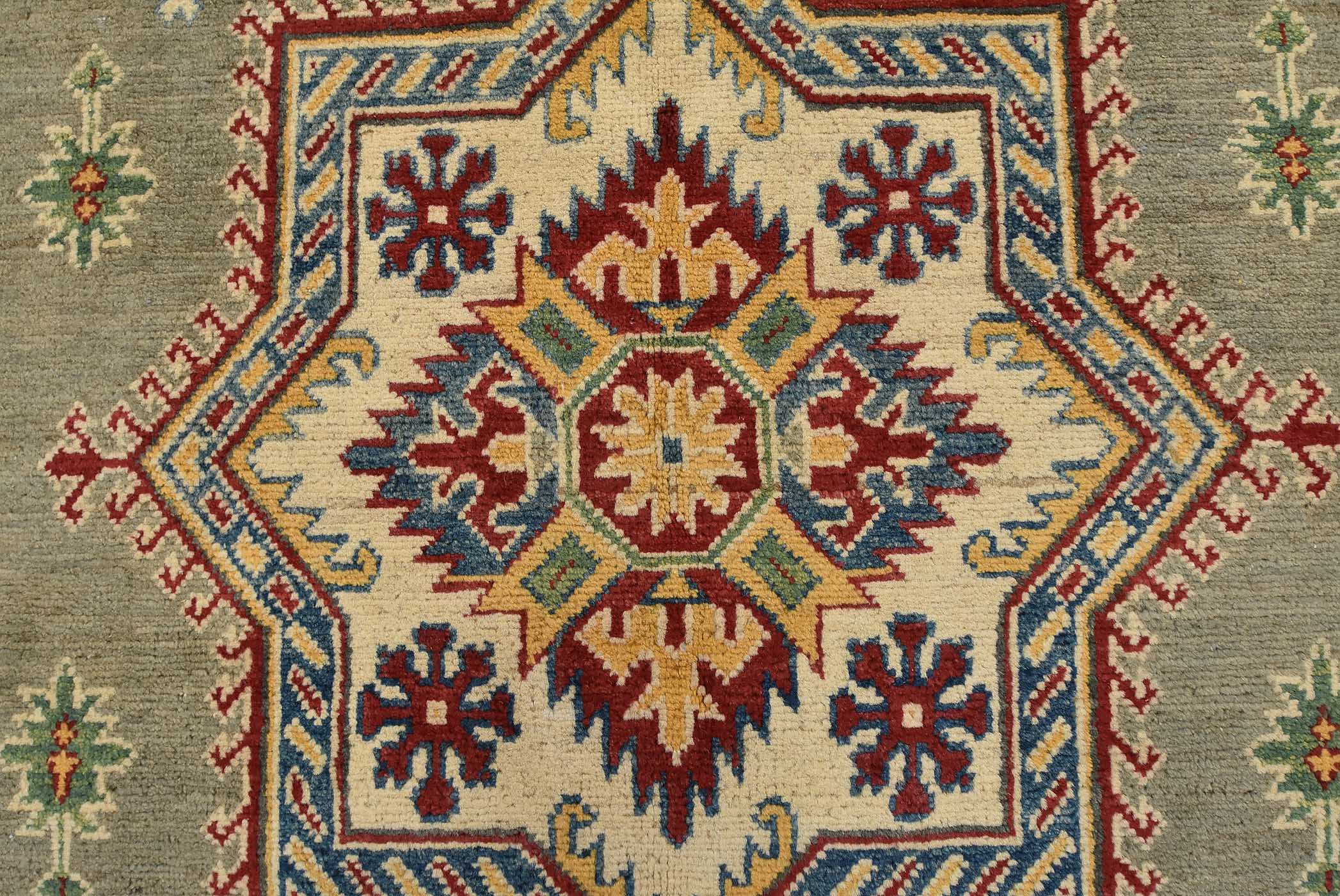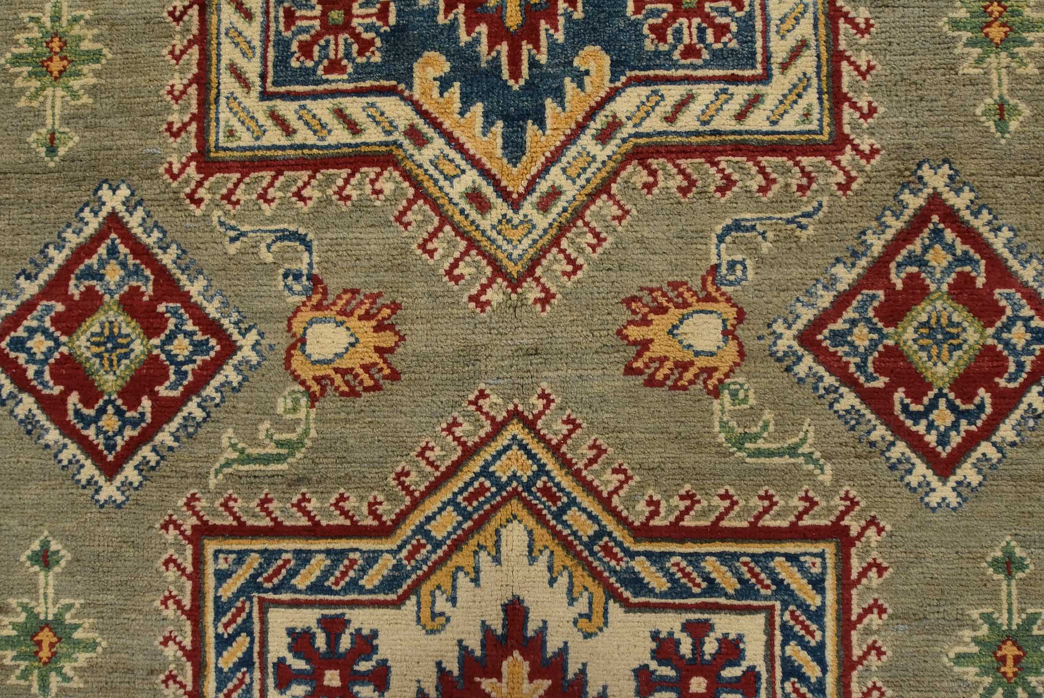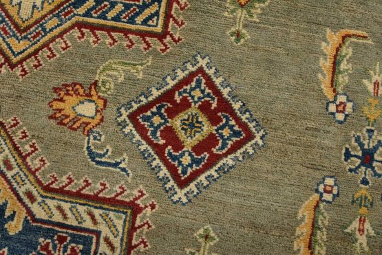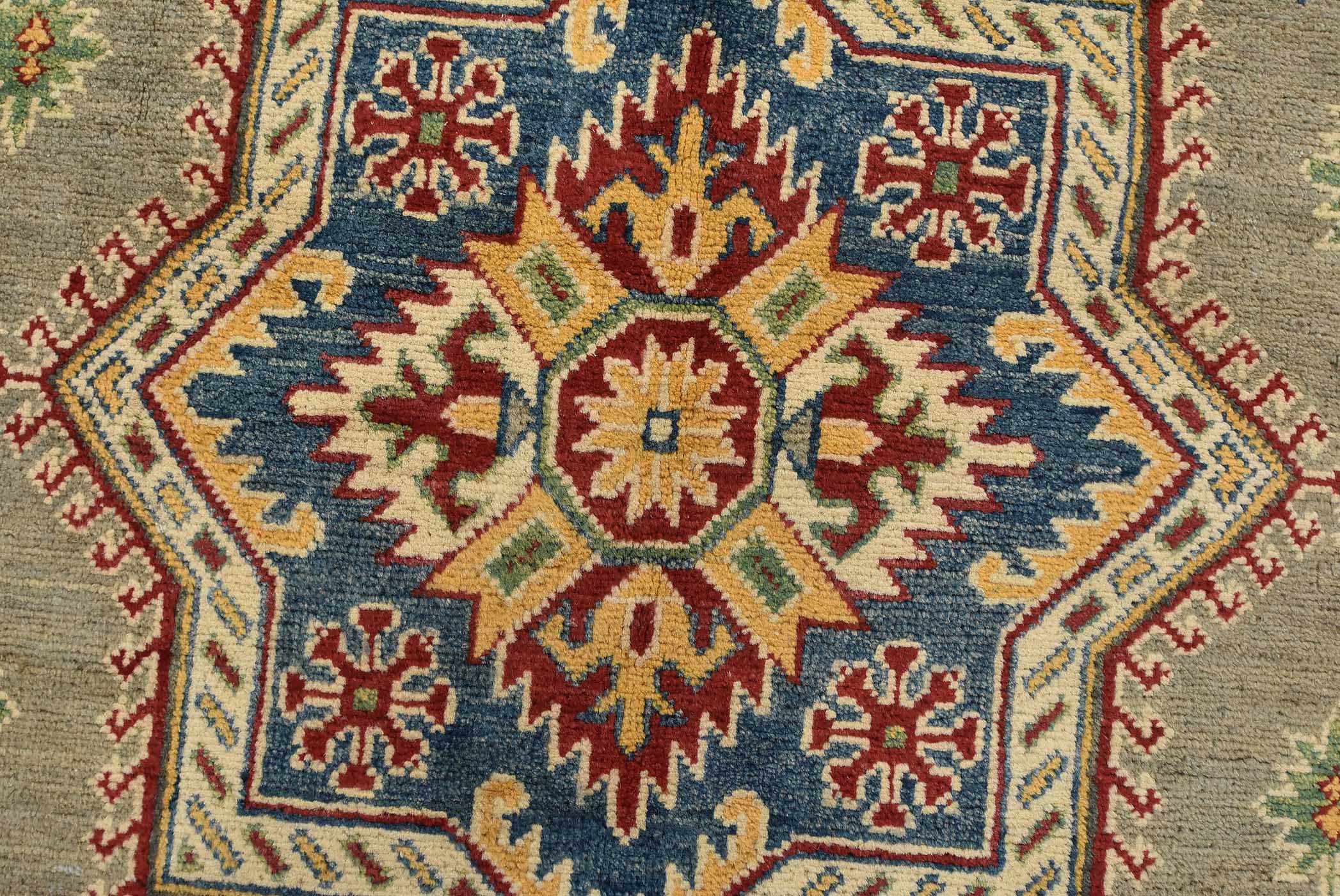 A tribal Caucasian Kazak rug hand-knotted with fine wool on a cotton foundation. This oriental rug features a row of geometric medallions surrounded by botanical motifs set against a gray background. It is new and in excellent condition.