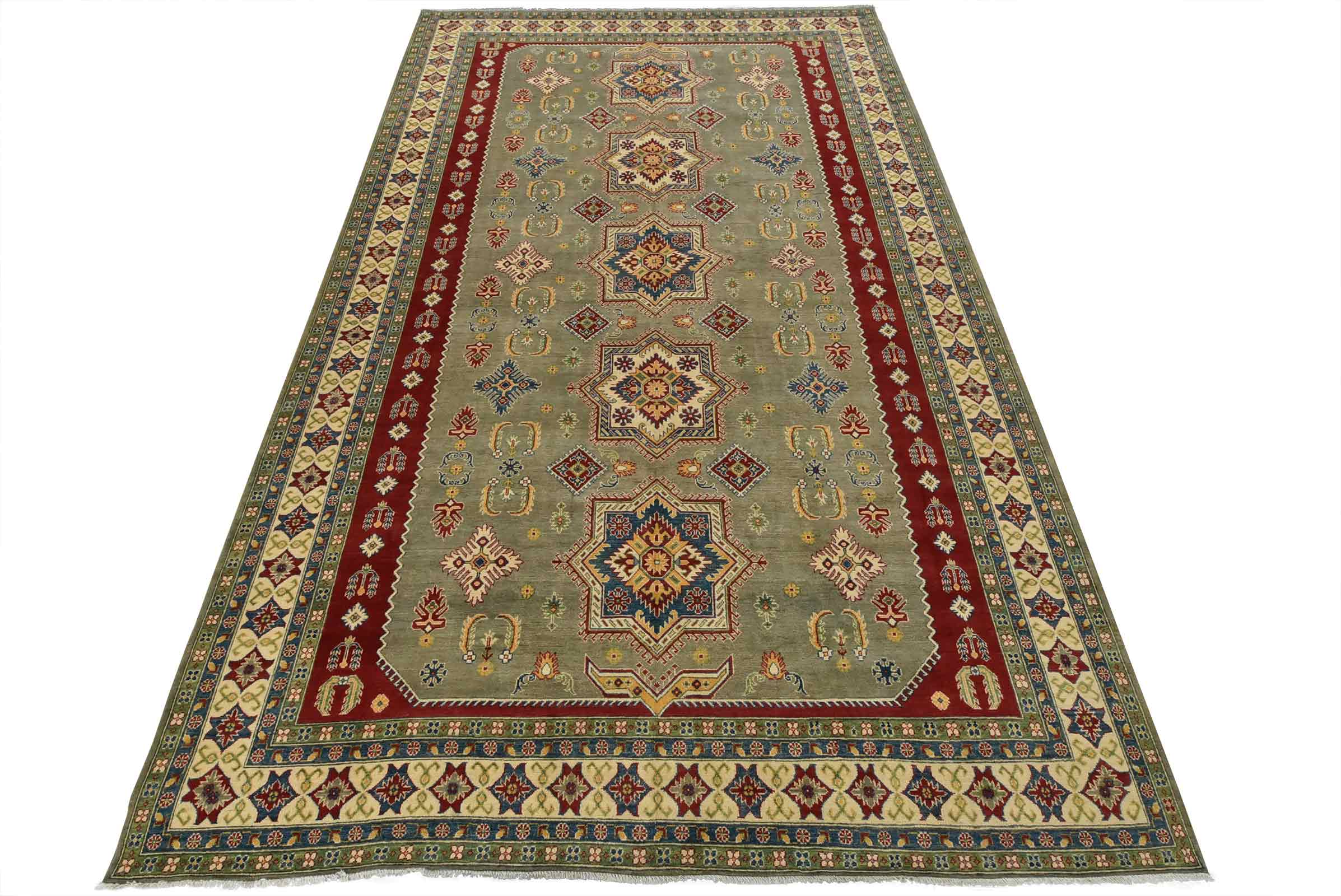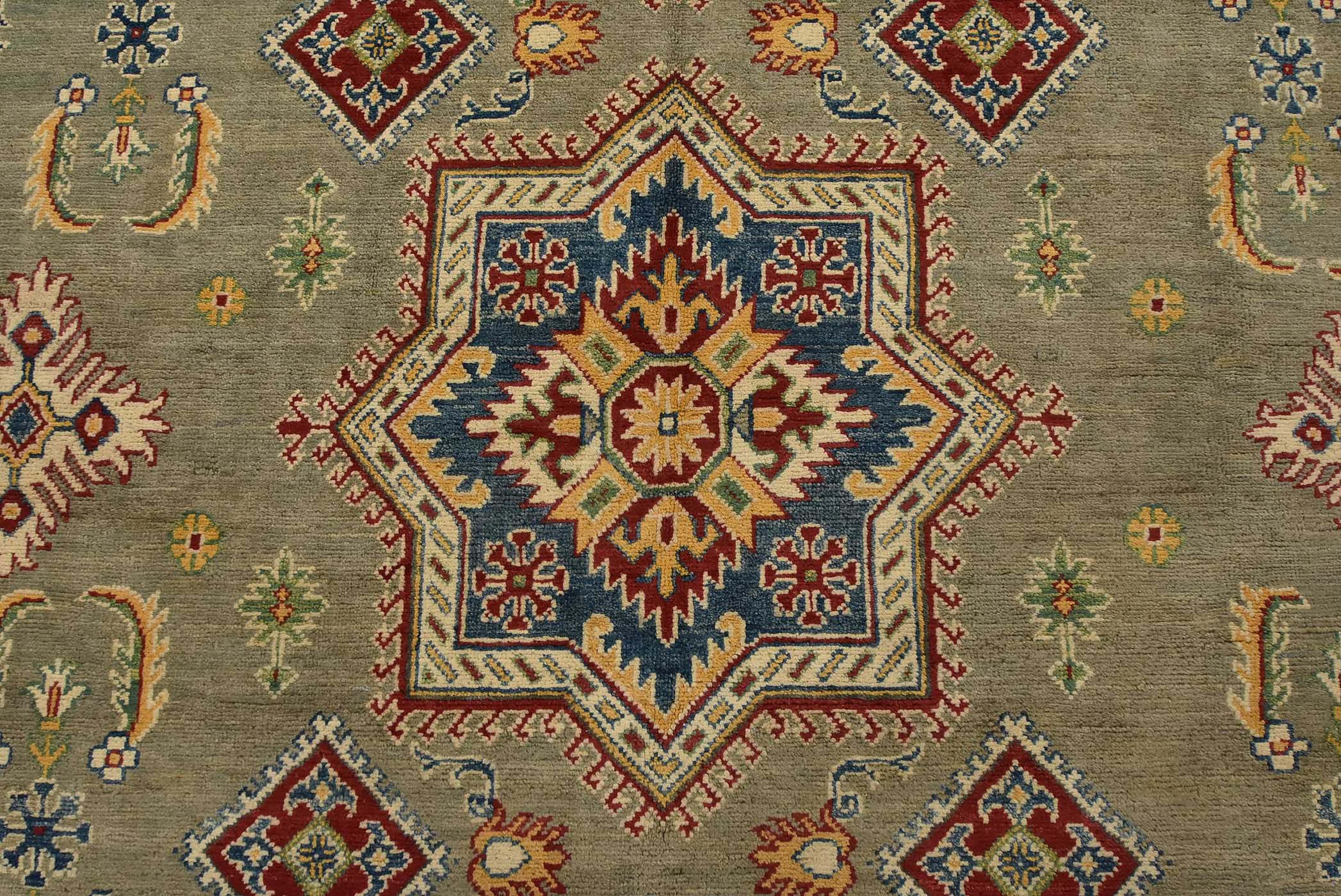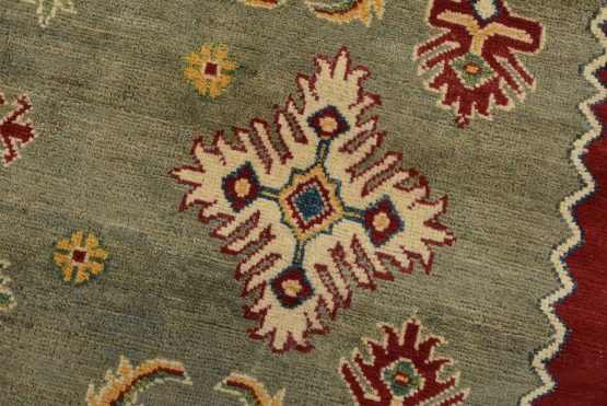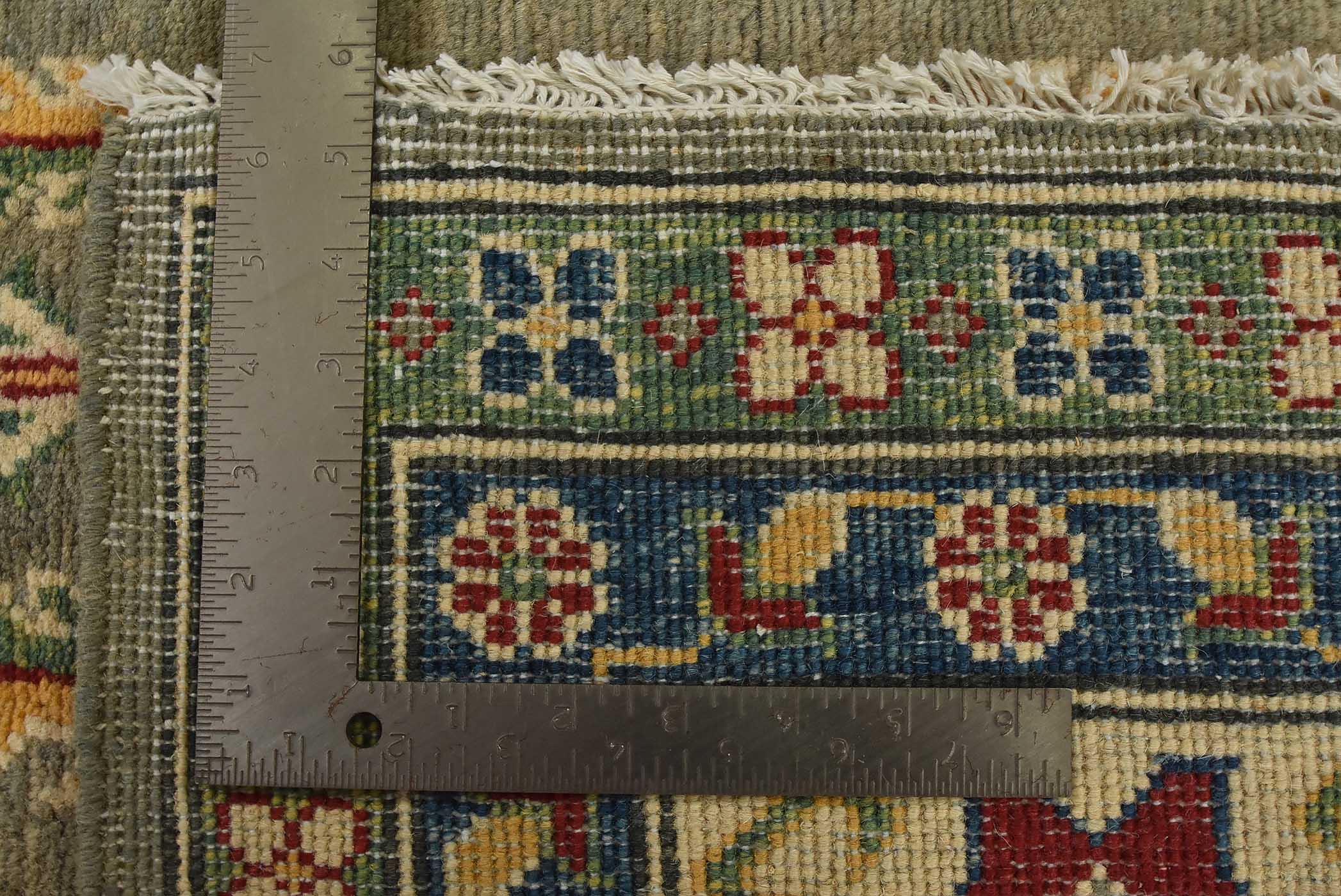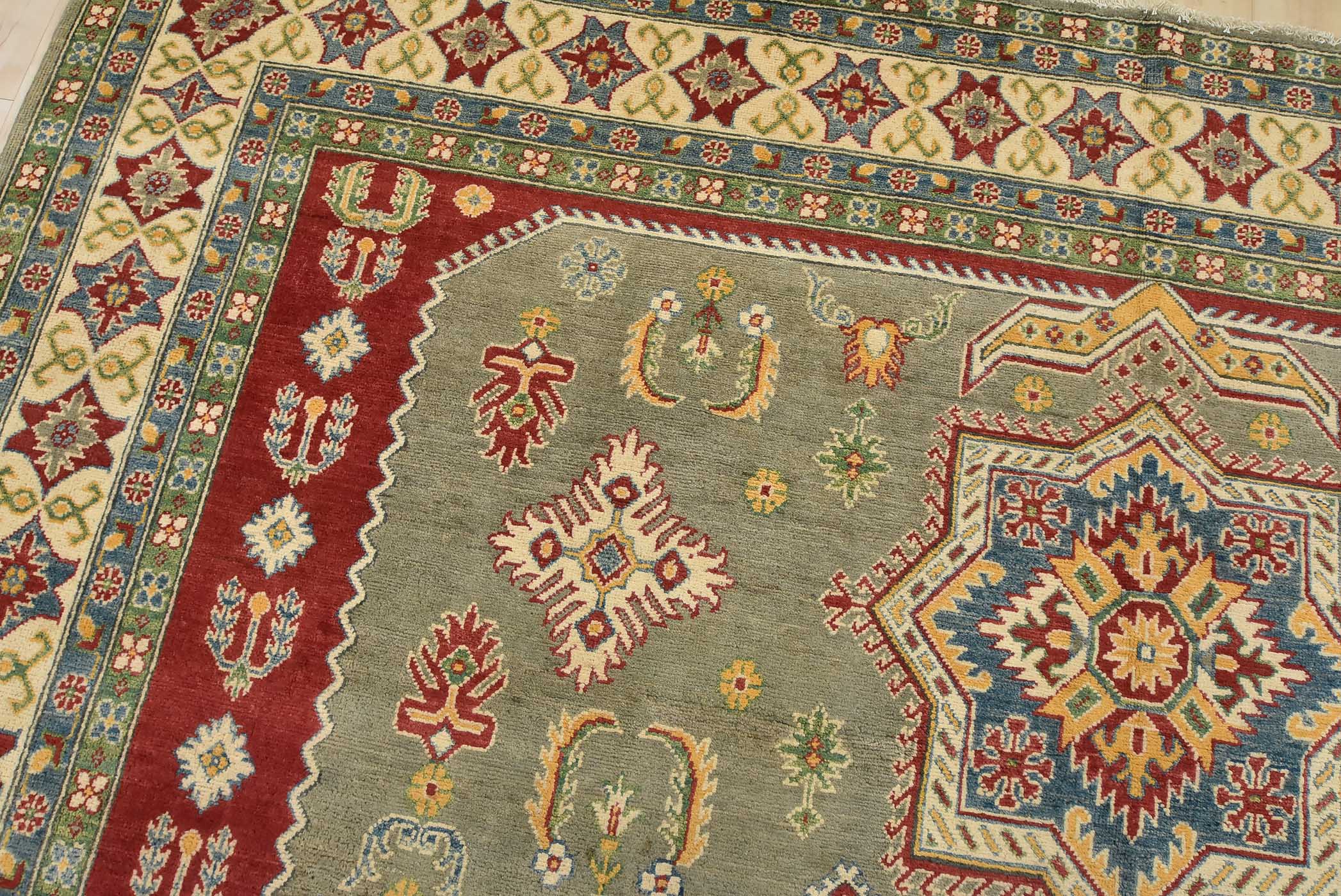 A tribal Caucasian Kazak rug hand-knotted with fine wool on a cotton foundation. This oriental rug features a row of geometric medallions surrounded by botanical motifs set against a gray background. It is new and in excellent condition.