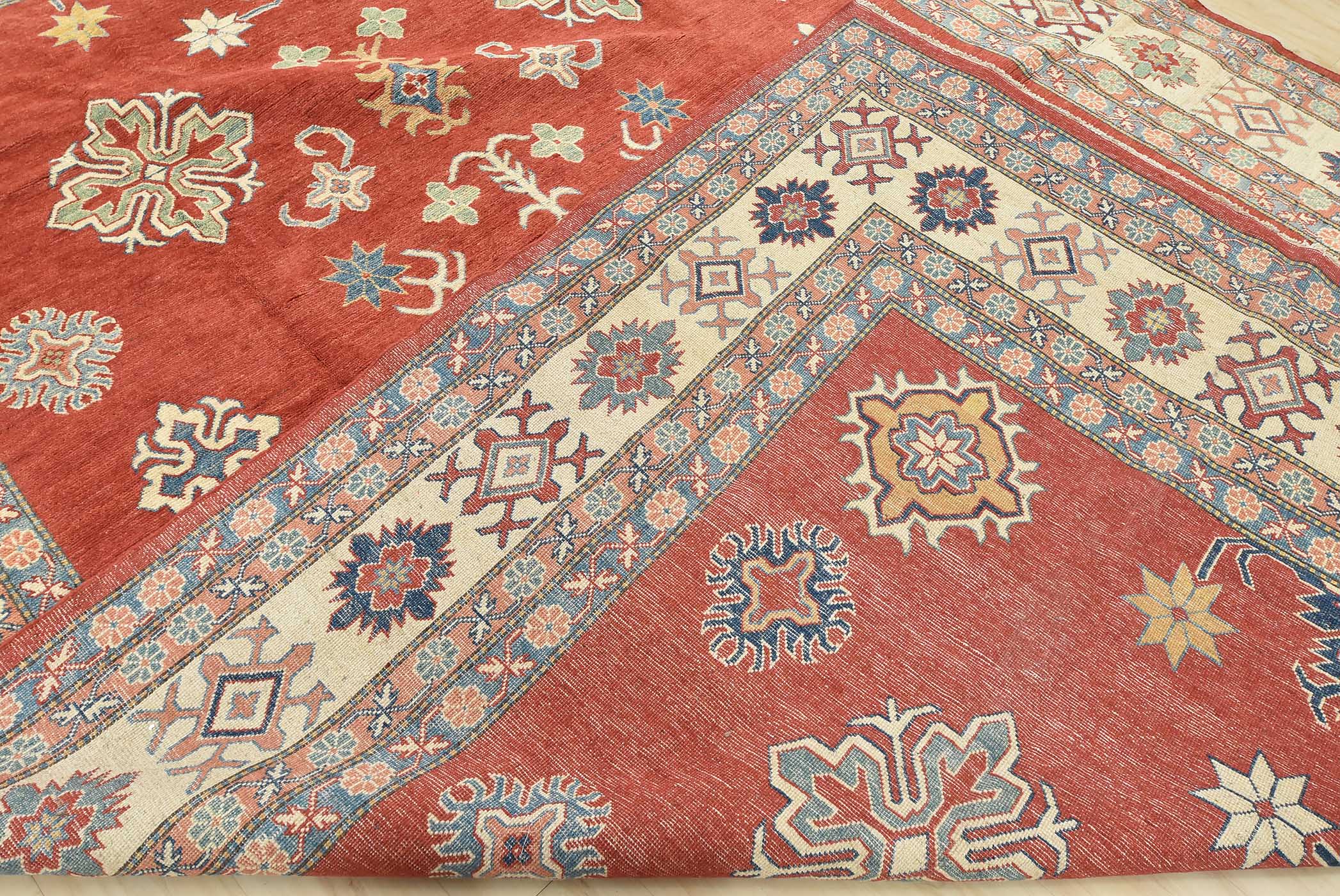A traditional tribal Caucasian Kazak rug hand-knotted with an all-wool pile on a cotton foundation. This oriental rug features a central geometric medallion surrounded by geometric motifs set against a red background. It is new and in excellent condition.