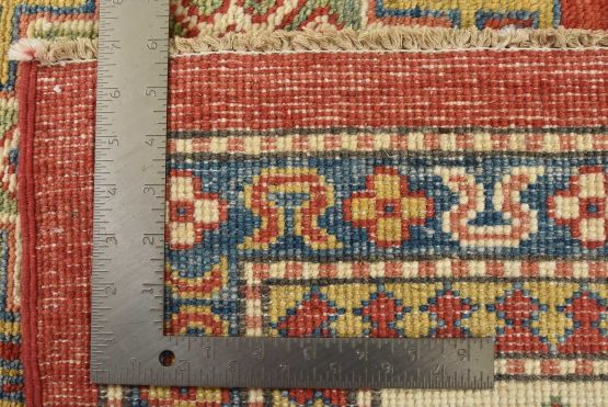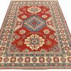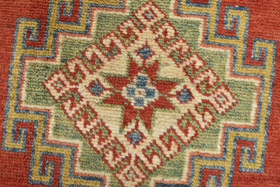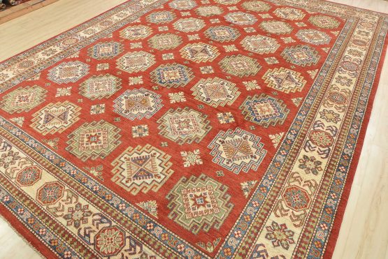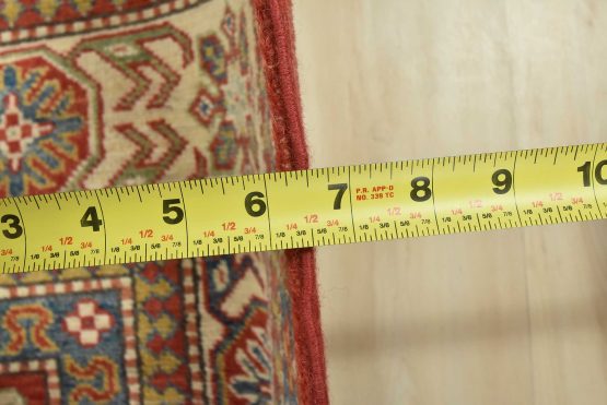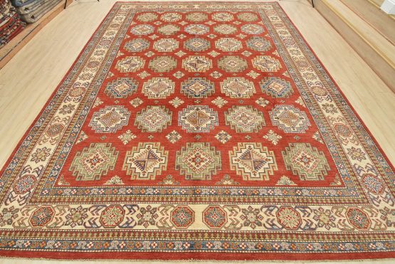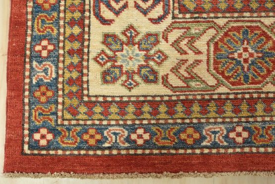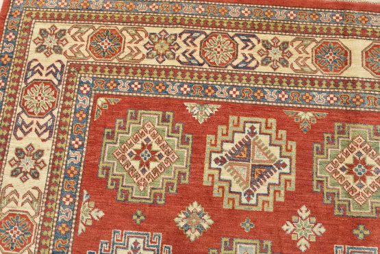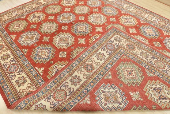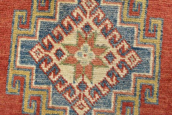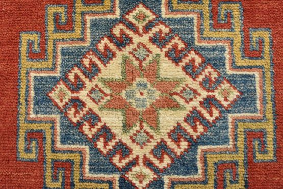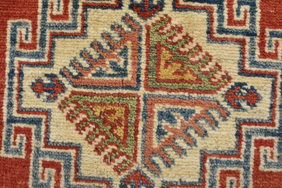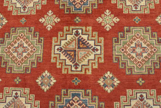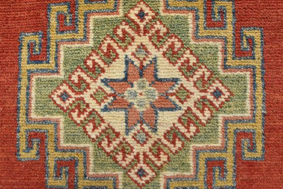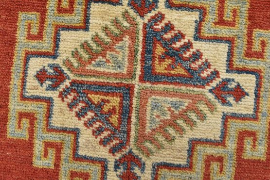 A tribal Caucasian Kazak rug hand-knotted with an all-wool pile on a cotton foundation. This oriental rug features rows of geometric medallions set against a red background. It is new and in excellent condition.