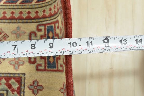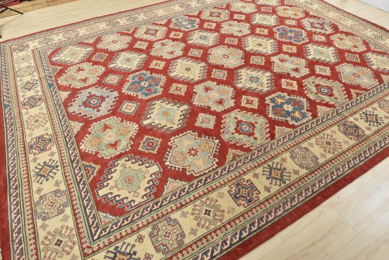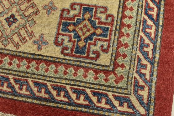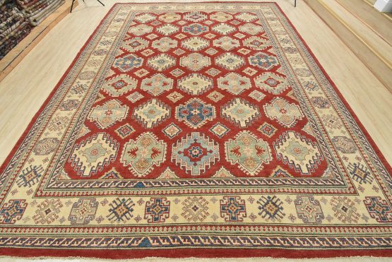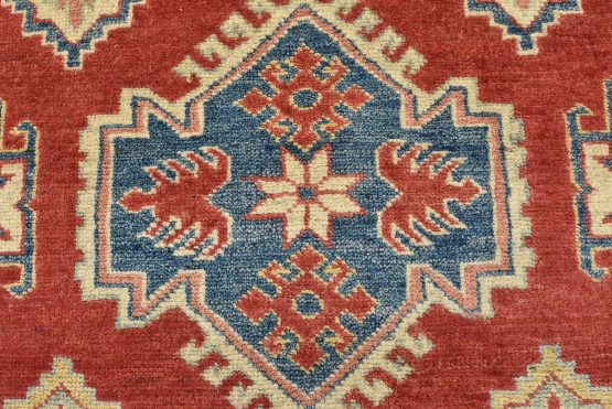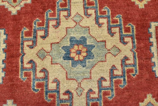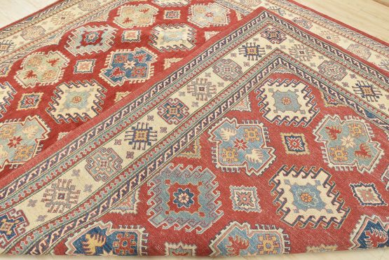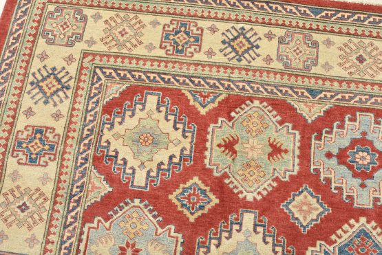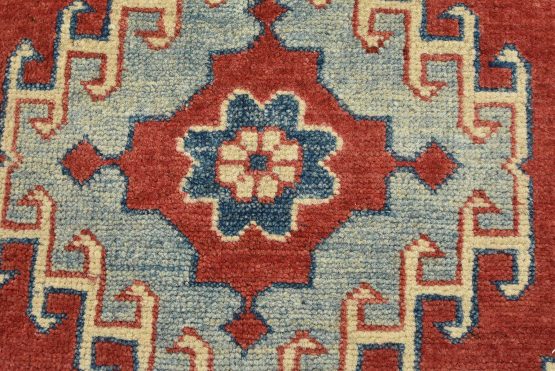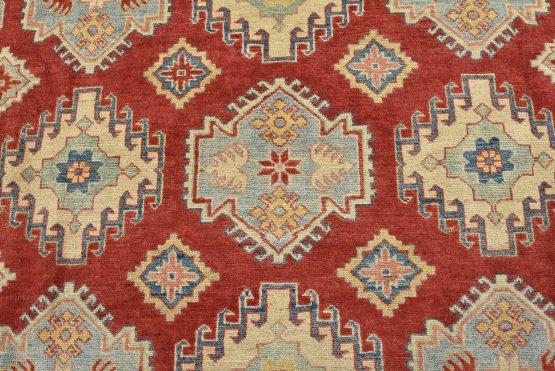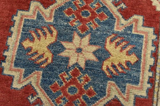 A tribal Caucasian Kazak rug hand-knotted with an all-wool pile on a cotton foundation. This oriental rug features rows of geometric medallions set against a red background. It is new and in excellent condition.