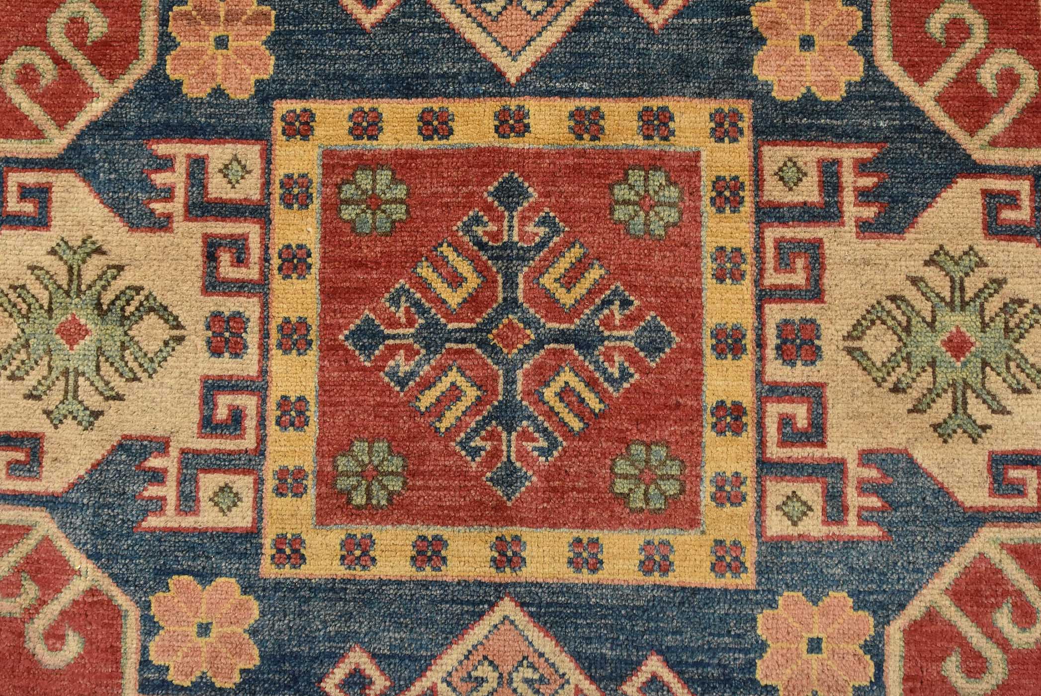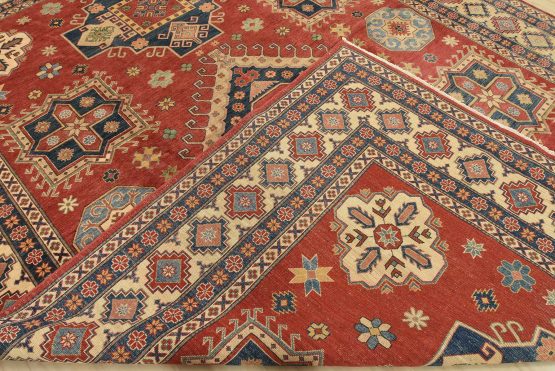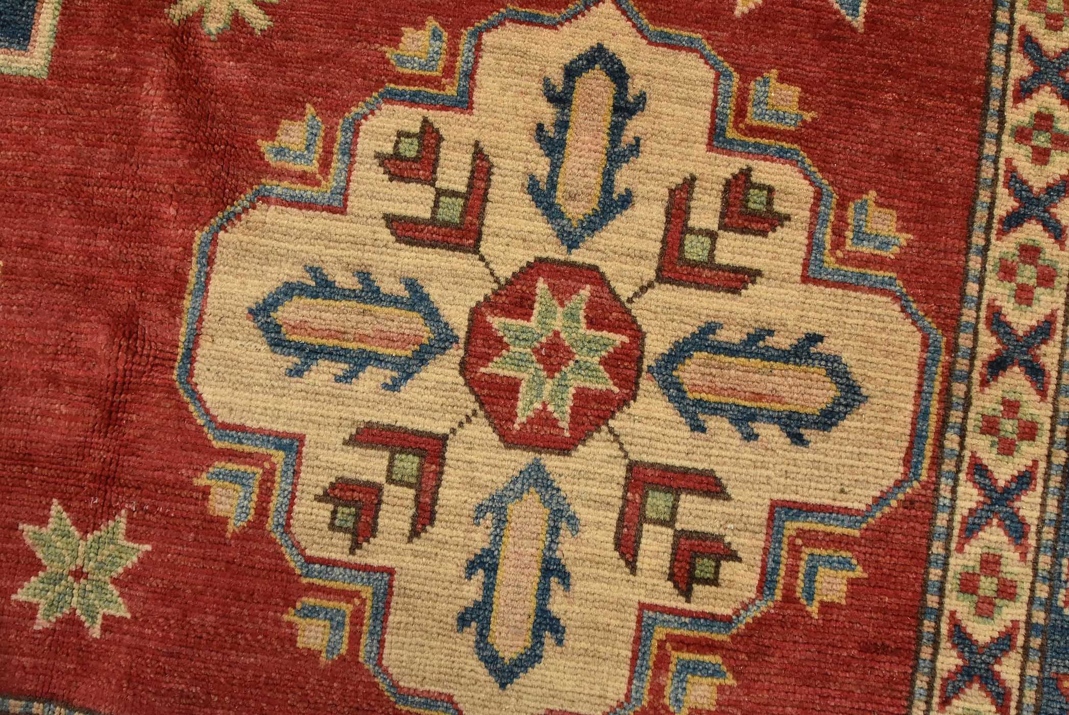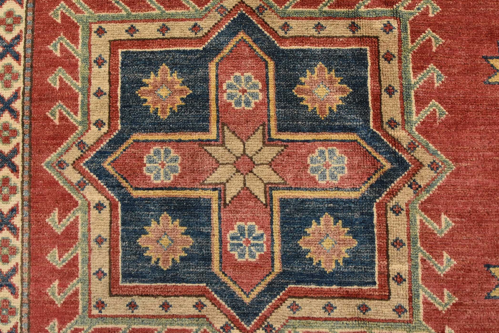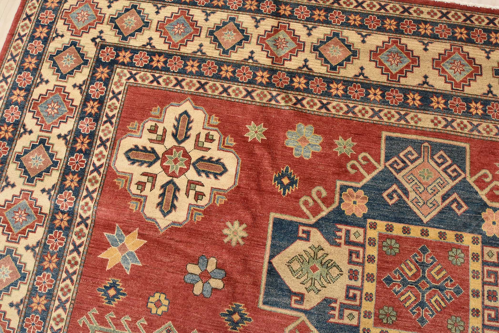 A tribal Caucasian Kazak rug hand-knotted with fine wool on a cotton foundation. This oriental rug features geometric medallions surrounded by small geometric motifs set against a red background. It is new and in excellent condition.