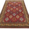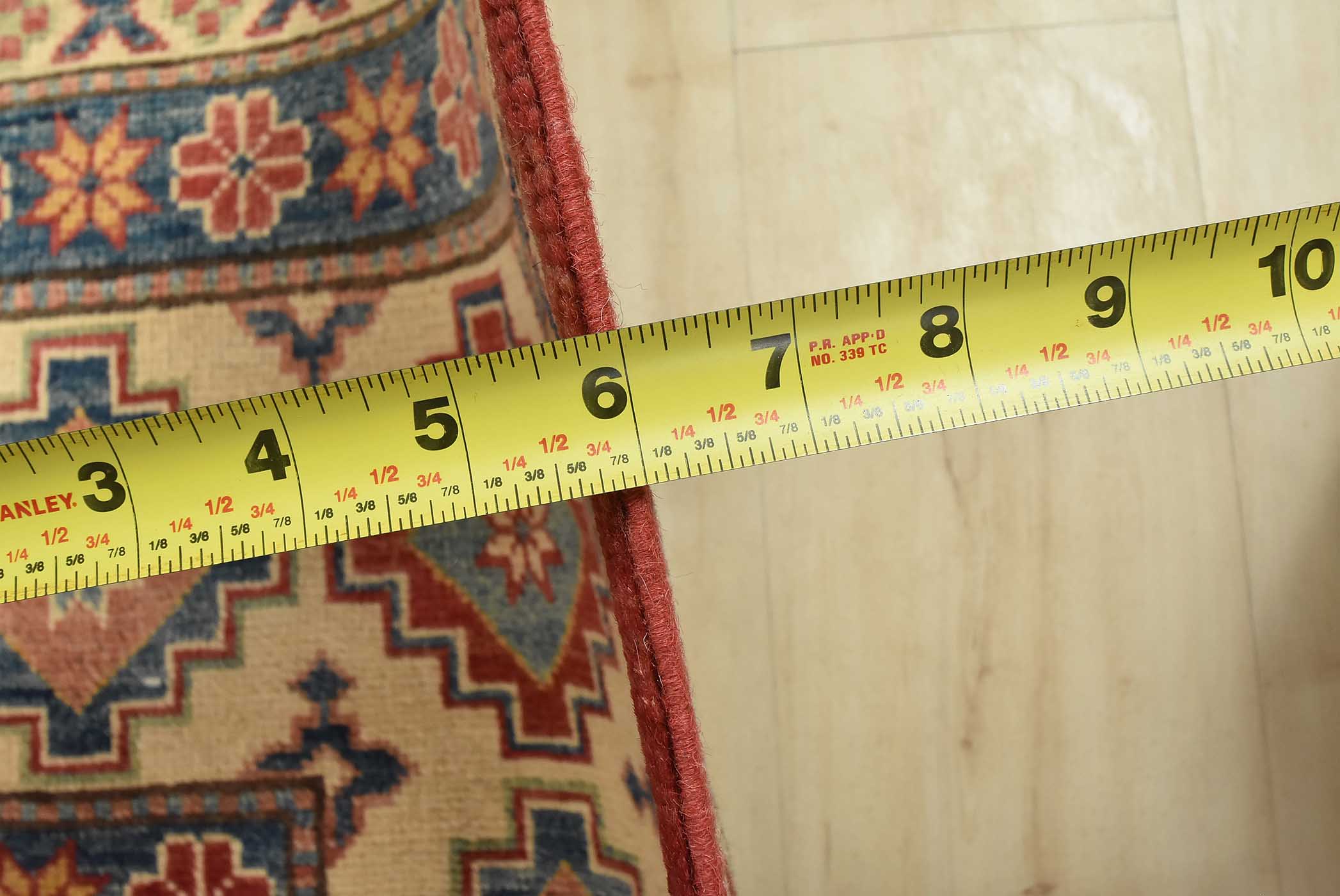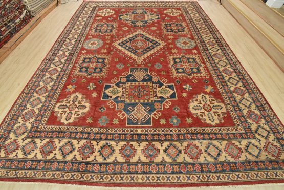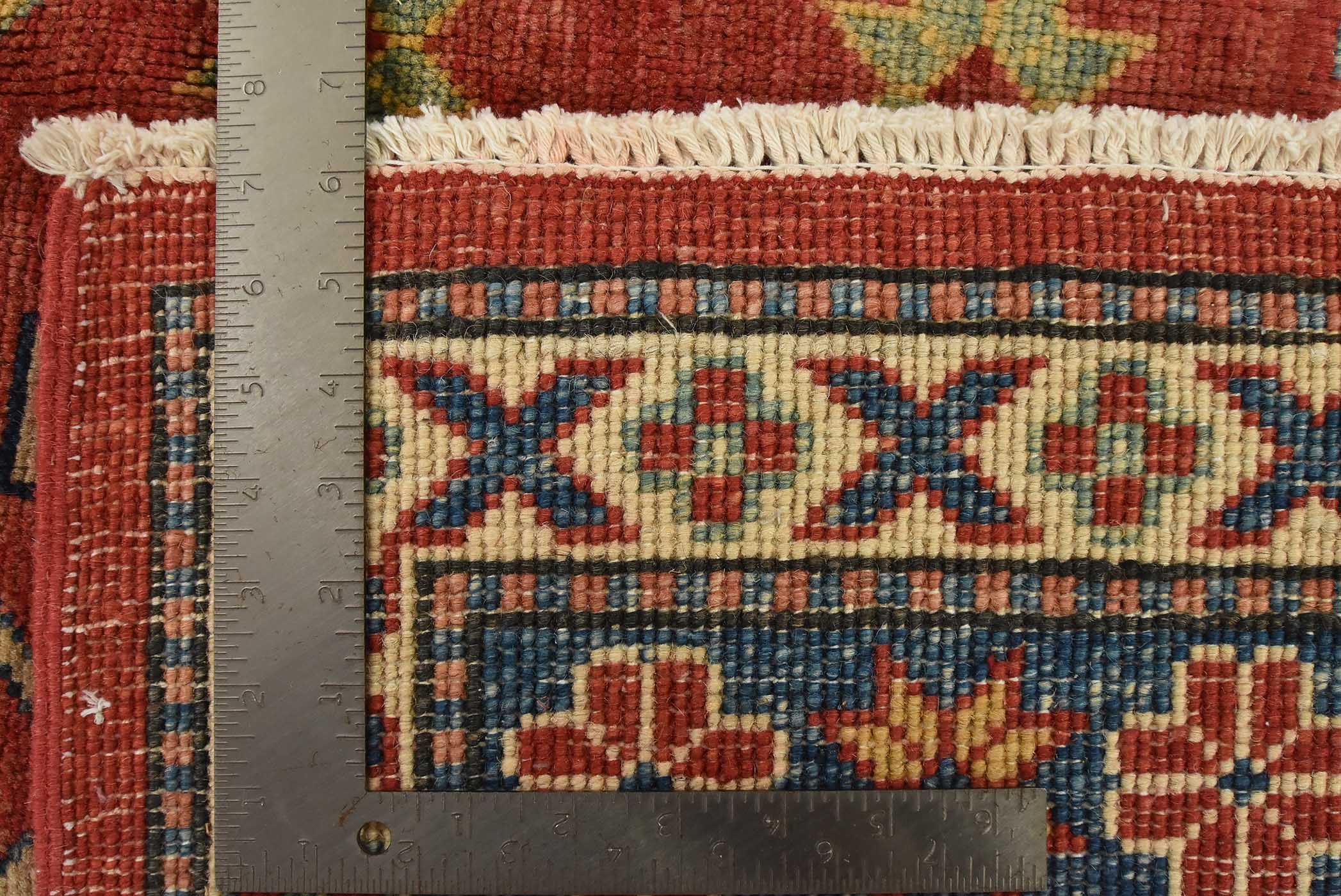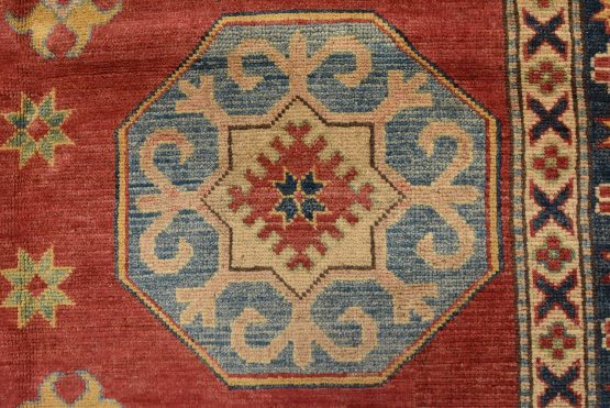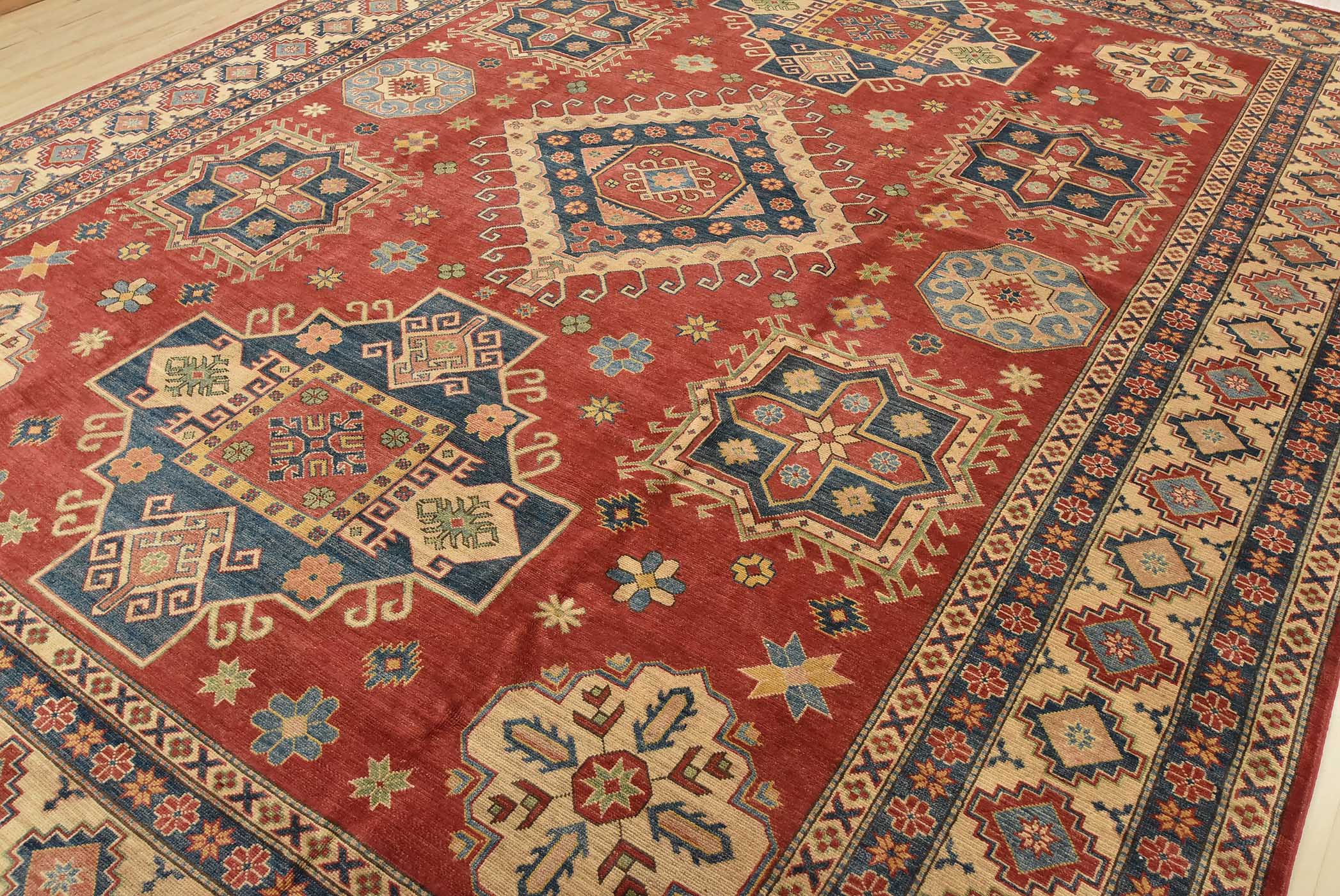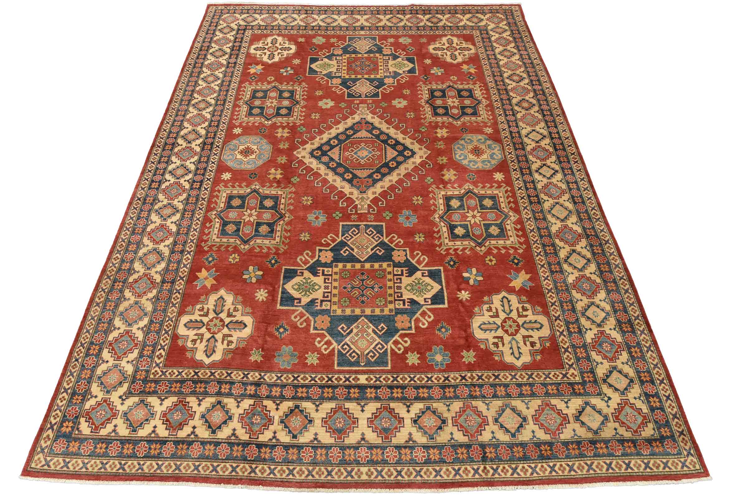 A tribal Caucasian Kazak rug hand-knotted with fine wool on a cotton foundation. This oriental rug features geometric medallions surrounded by small geometric motifs set against a red background. It is new and in excellent condition.