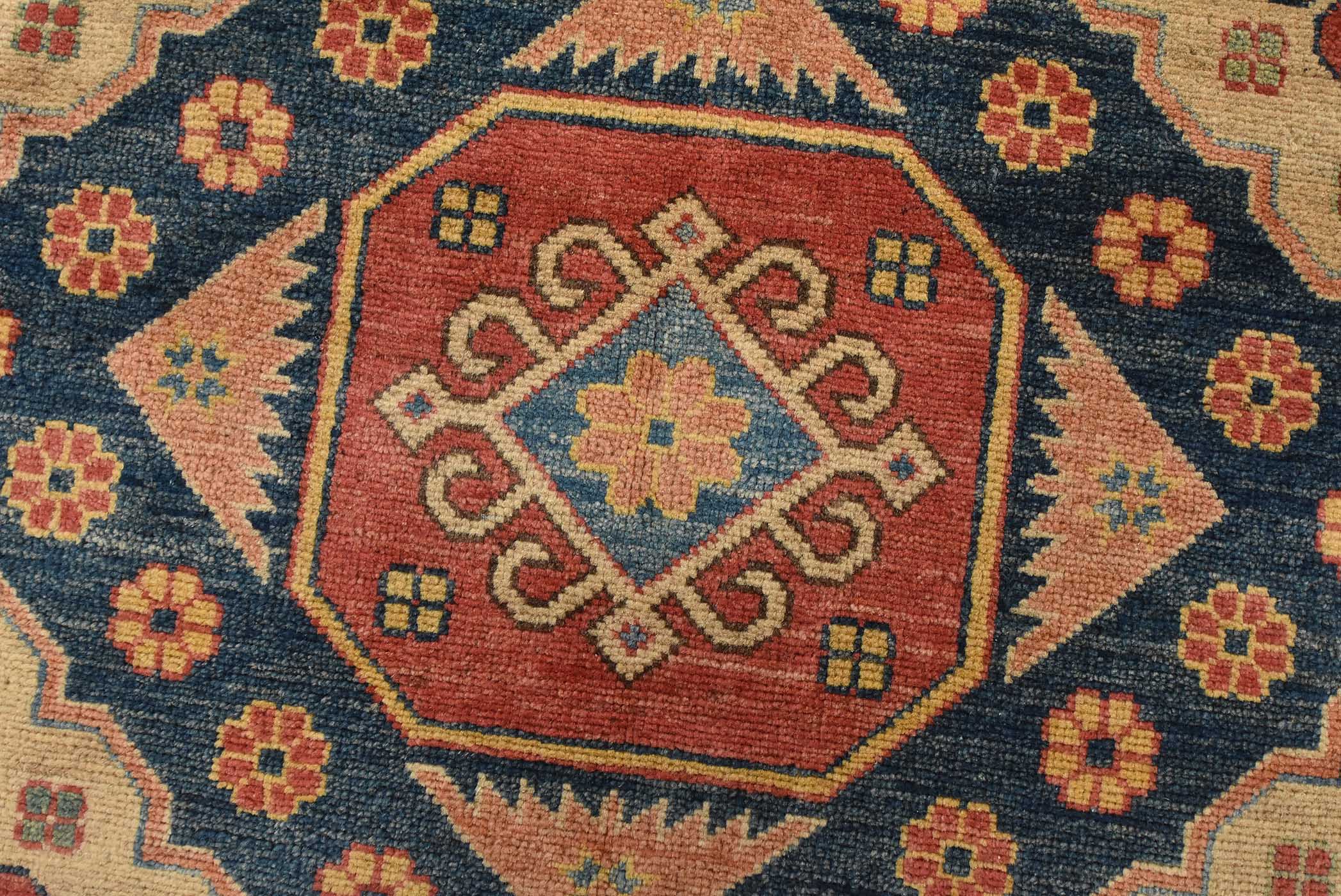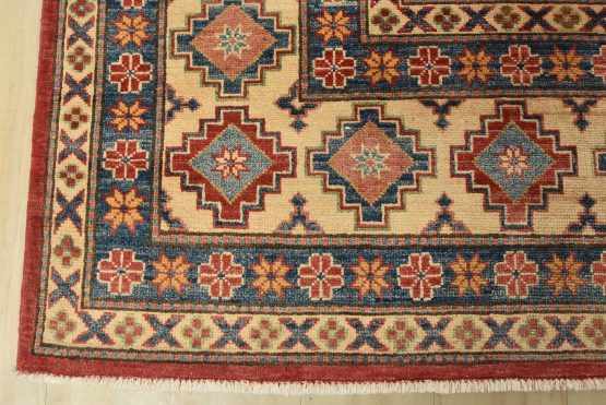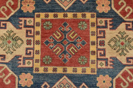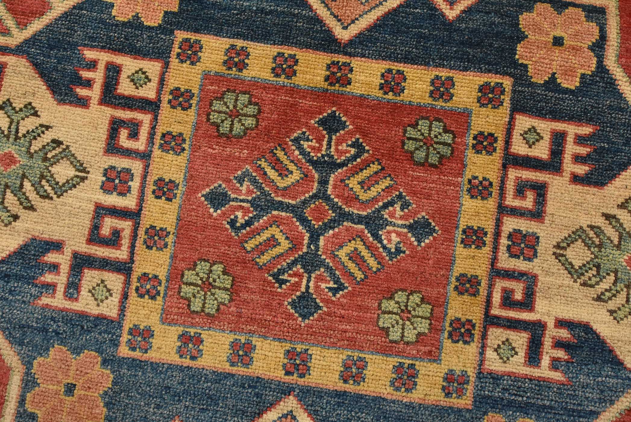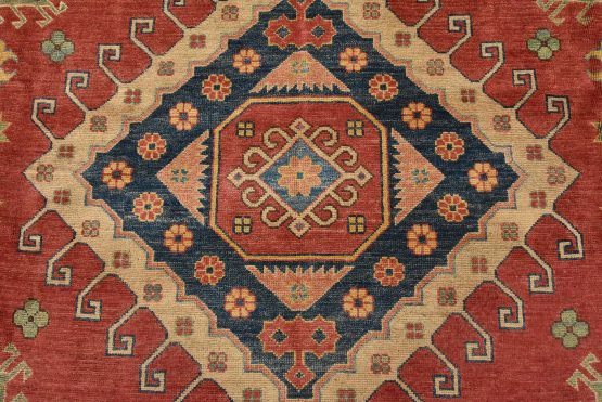 Original antique Kazak rugs from the Caucasus region inspire the creation of new Kazak rugs. These rugs are woven with fine wool using traditional Kazak patterns and finished with a low-cut pile to give them an authentic vintage look.