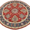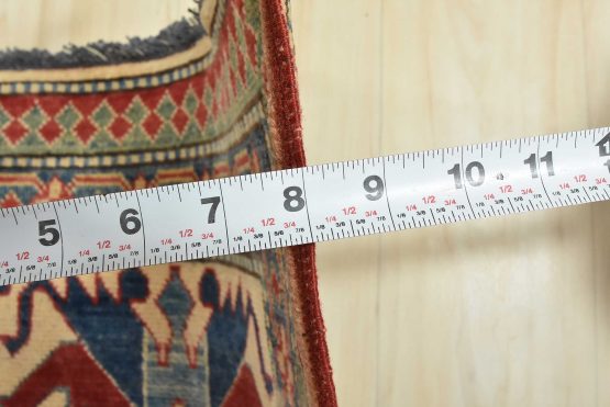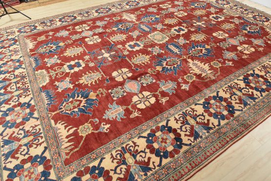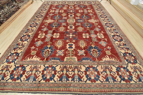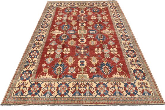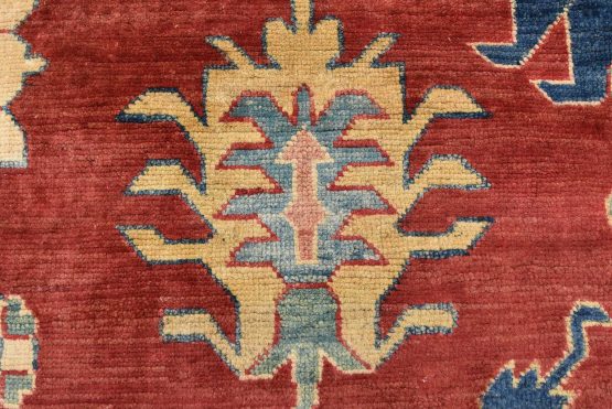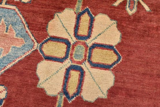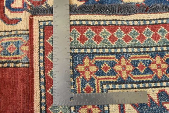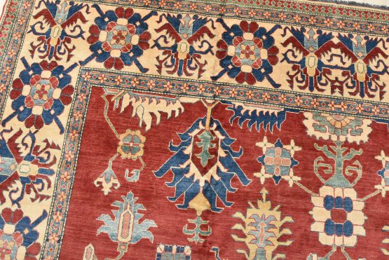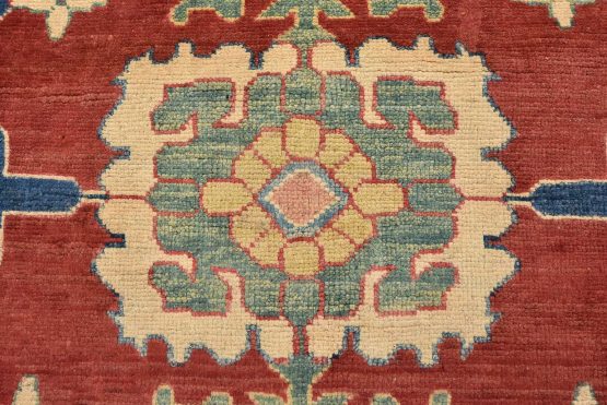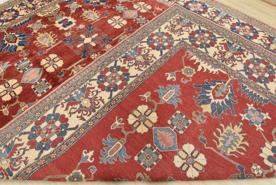 A traditional tribal Caucasian Kazak rug hand-knotted with an all-wool pile on a cotton foundation. This oriental rug features an all-over geometric botanical pattern set against a red background. It is new and in excellent condition.
