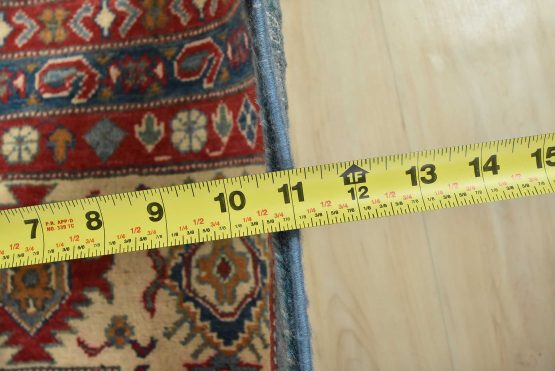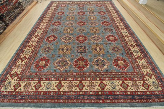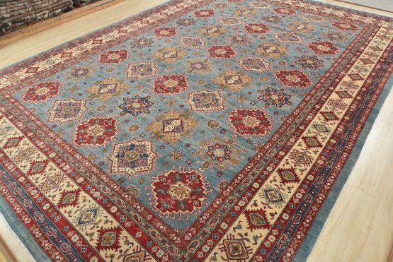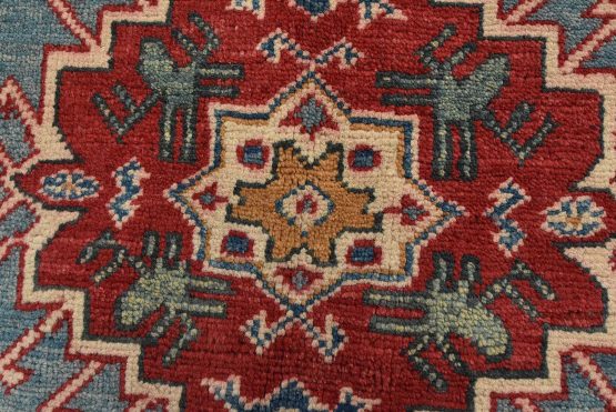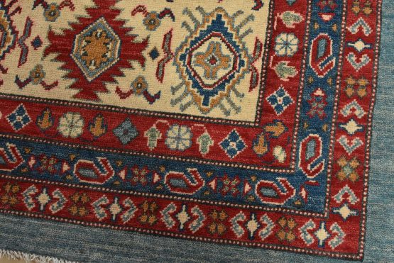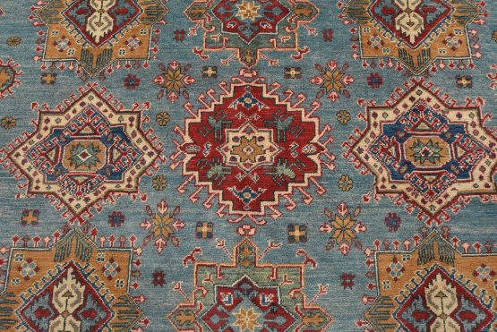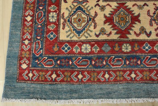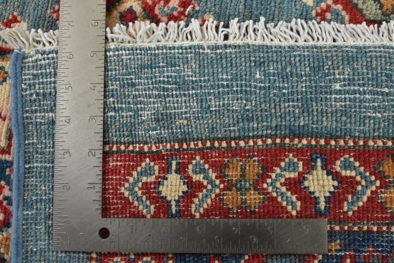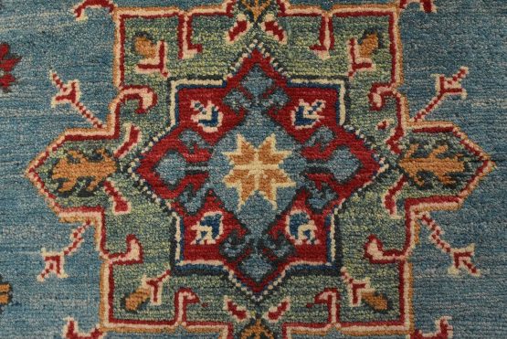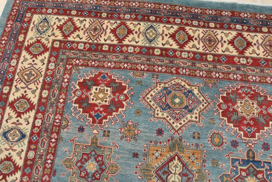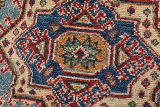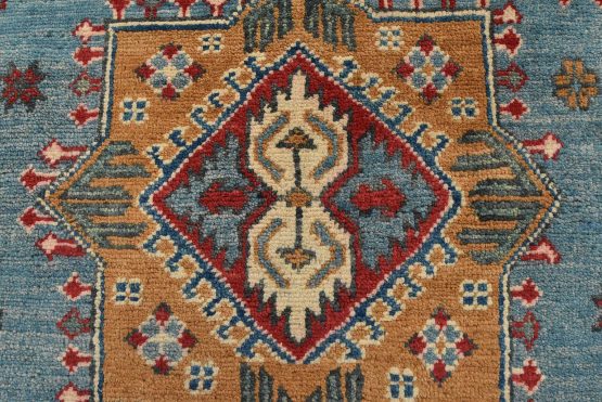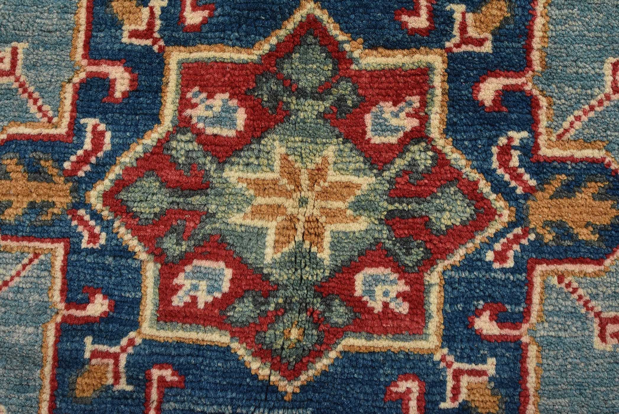 A tribal Caucasian Kazak rug hand-knotted with an all-wool pile on a cotton foundation. This oriental rug features rows of geometric medallions set against a blue background. It is new and in excellent condition.
