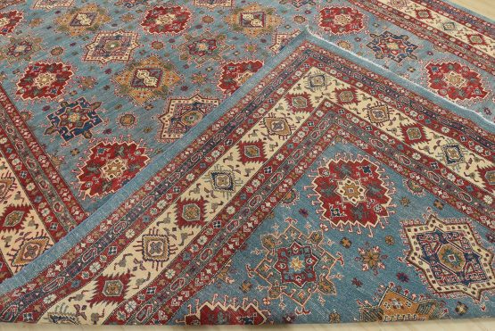 Original antique Kazak rugs from the Caucasus region inspire the creation of new Kazak rugs. These rugs are woven with fine wool using traditional Kazak patterns and finished with a low-cut pile, giving them an authentic vintage look.