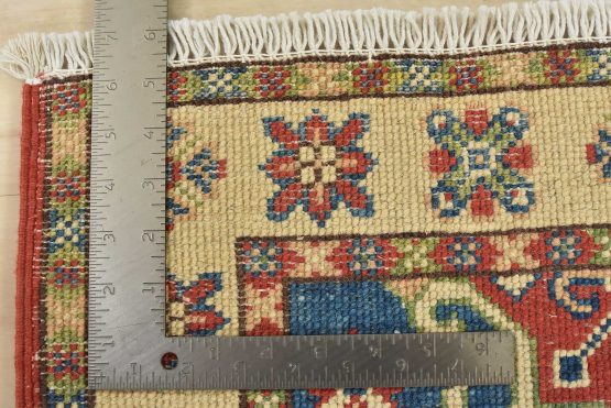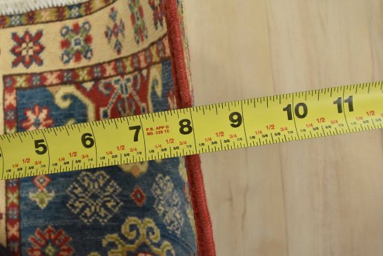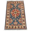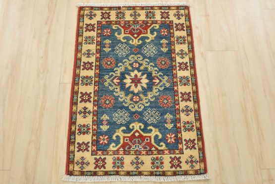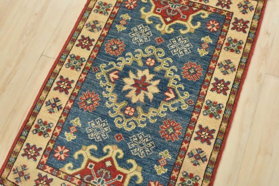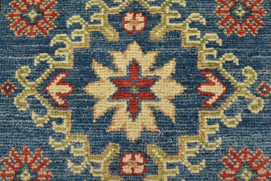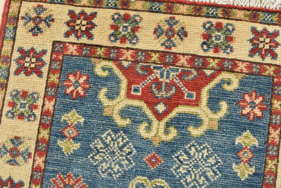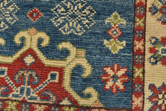 A traditional tribal Caucasian Kazak rug hand-knotted with an all-wool pile on a cotton foundation. This oriental rug features a central medallion surrounded by geometric motifs set against a blue background. It is new and in excellent condition.
