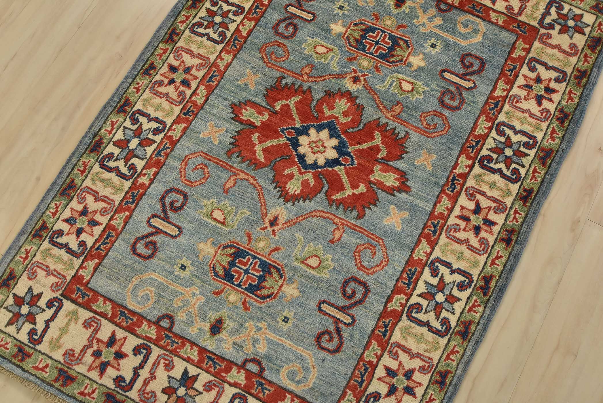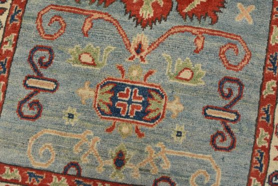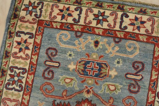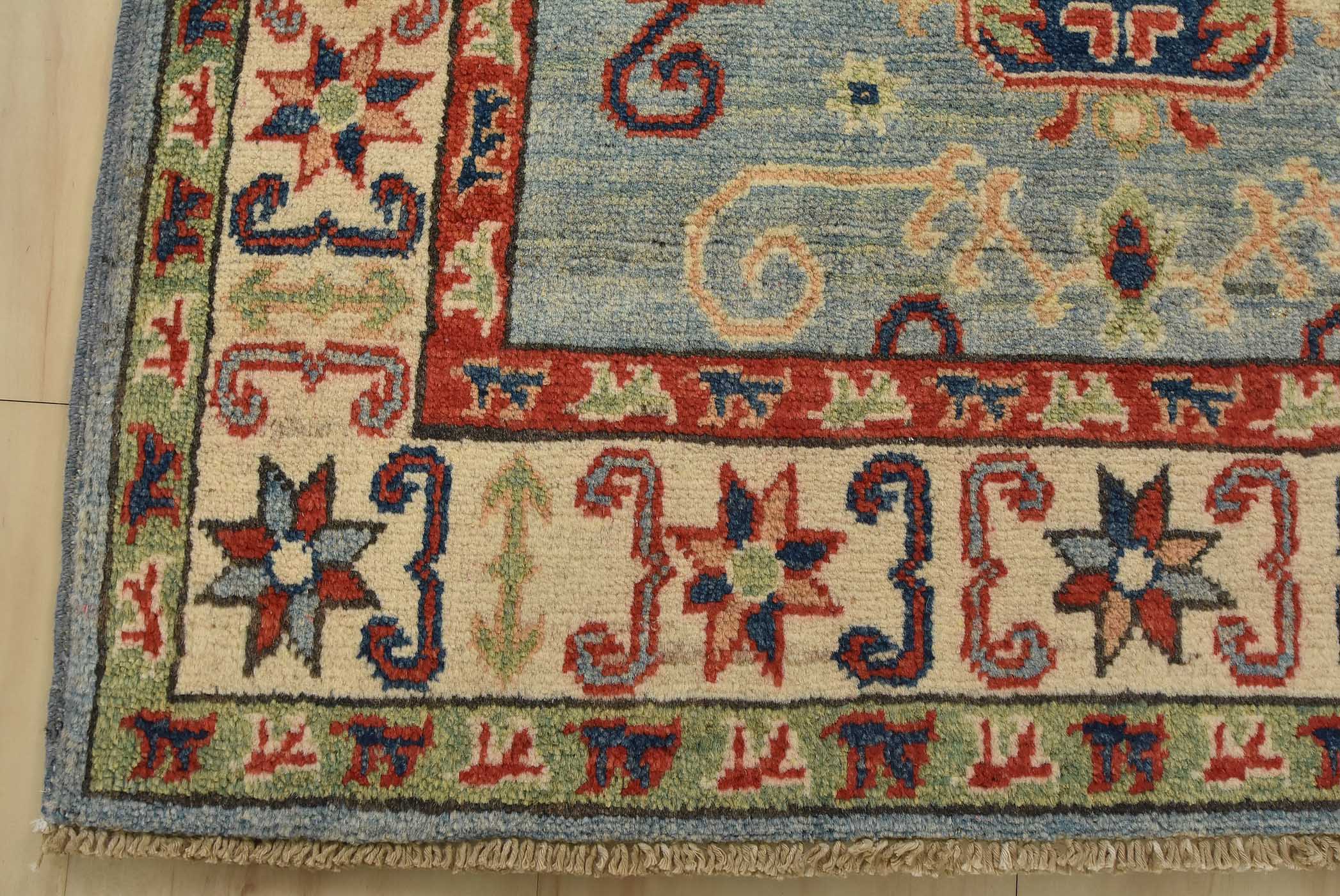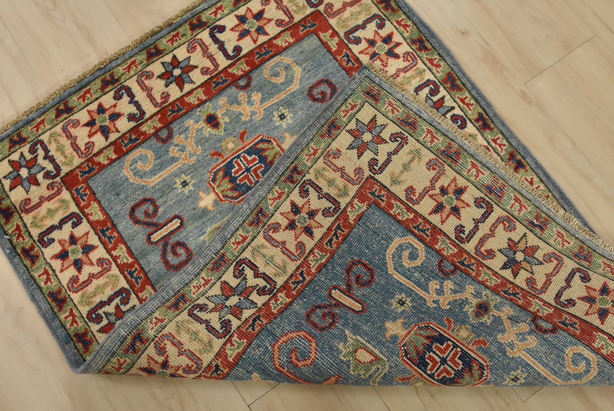 A tribal Caucasian Kazak rug hand-knotted with fine wool on a cotton foundation. This rug features a central medallion surrounded by botanical motifs set against a blue background. It is new and in excellent condition.