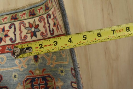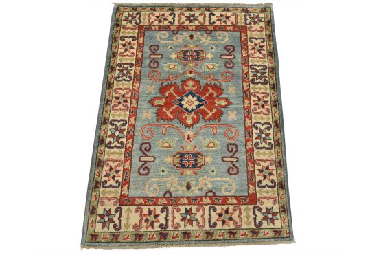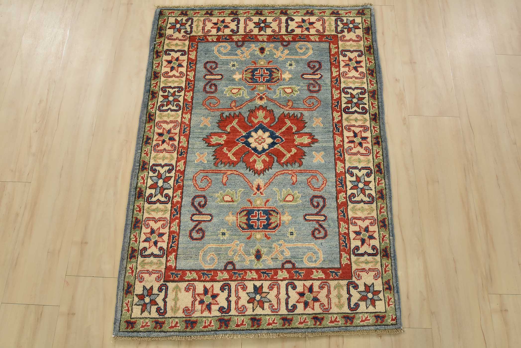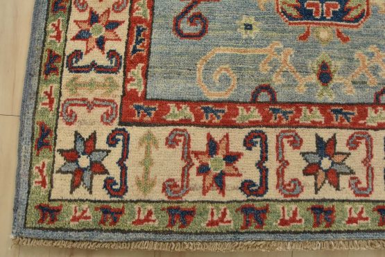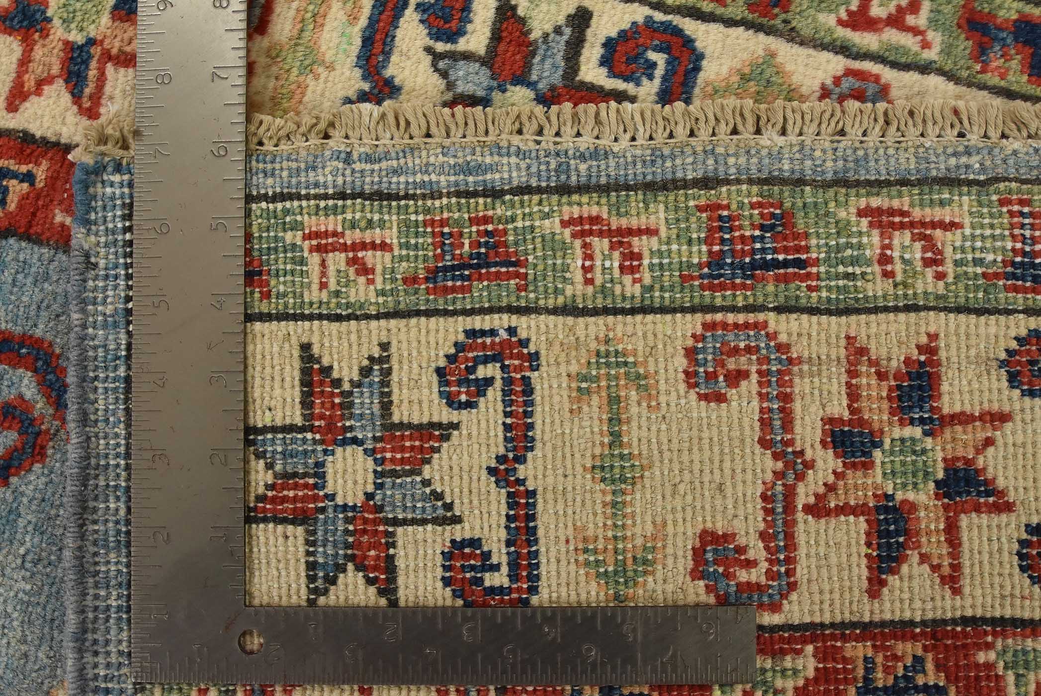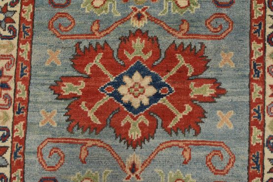 A tribal Caucasian Kazak rug hand-knotted with fine wool on a cotton foundation. This rug features a central medallion surrounded by botanical motifs set against a blue background. It is new and in excellent condition.
