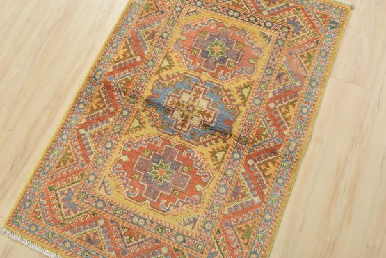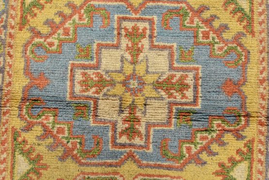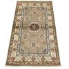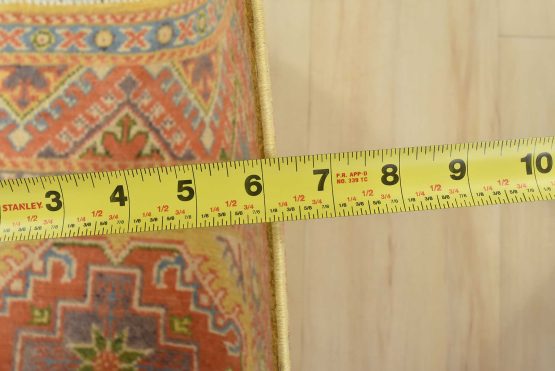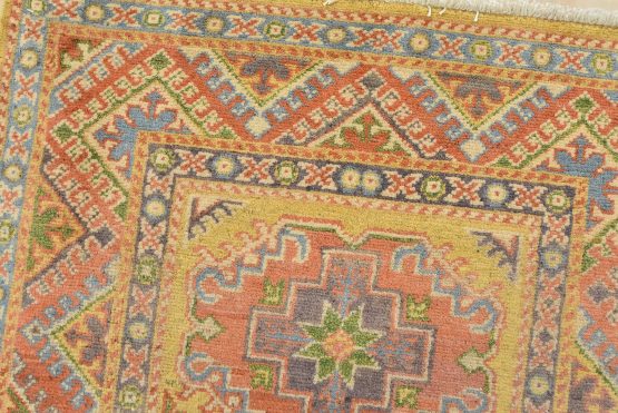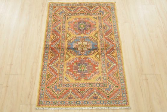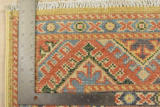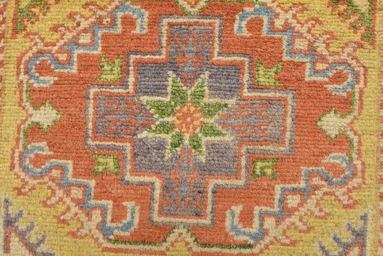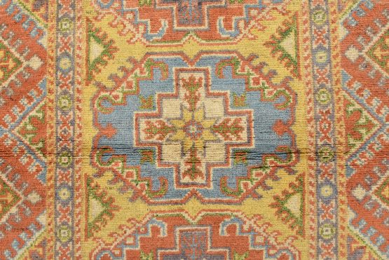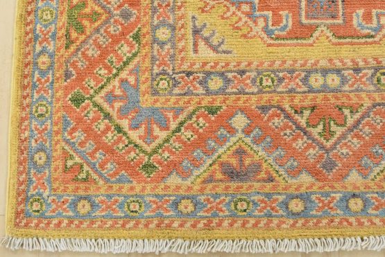 A tribal Caucasian Kazak rug hand-knotted with an all-wool pile on a cotton foundation. This oriental rug features geometric medallions set against a gold background. It is new and in excellent condition.