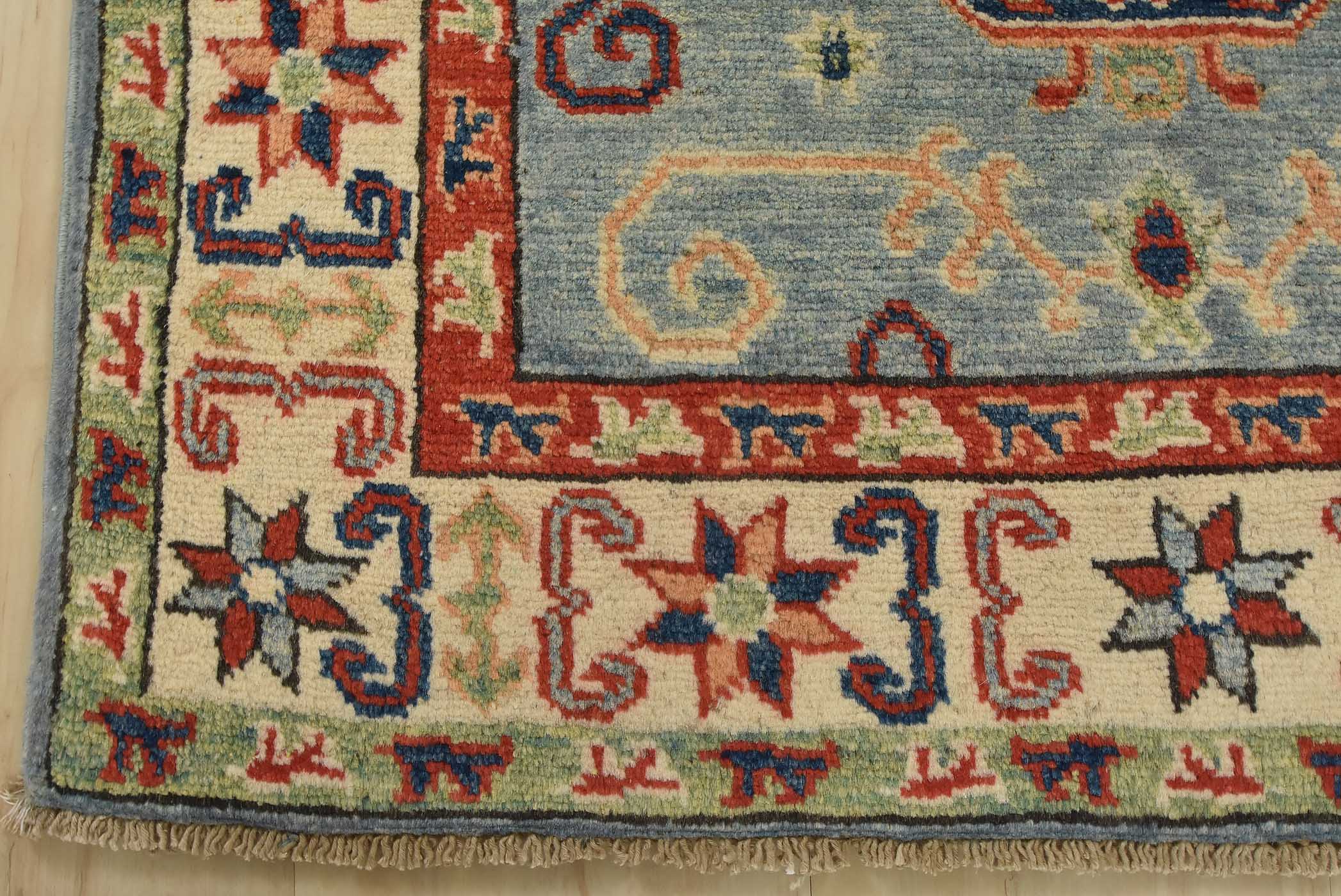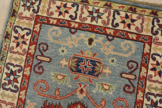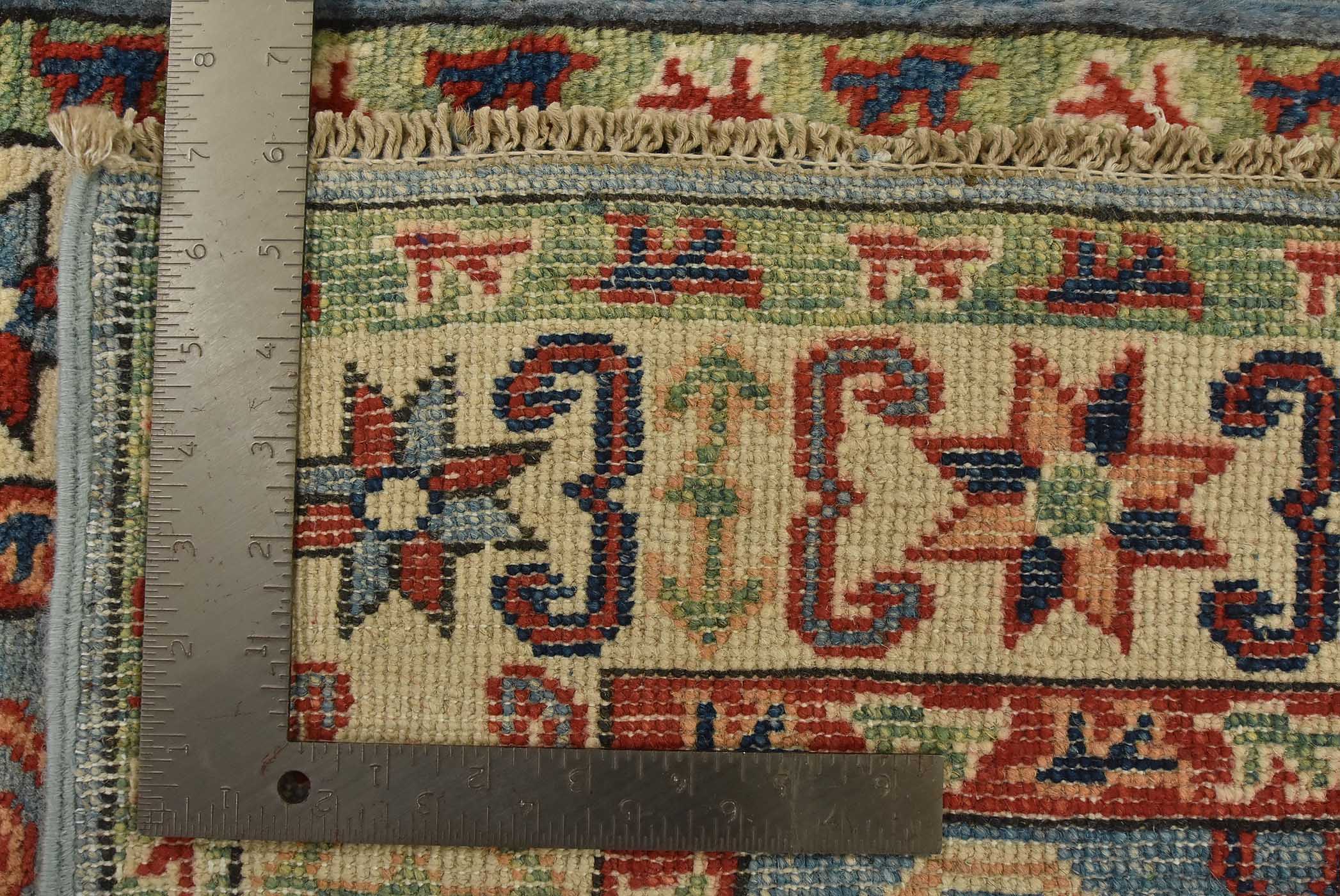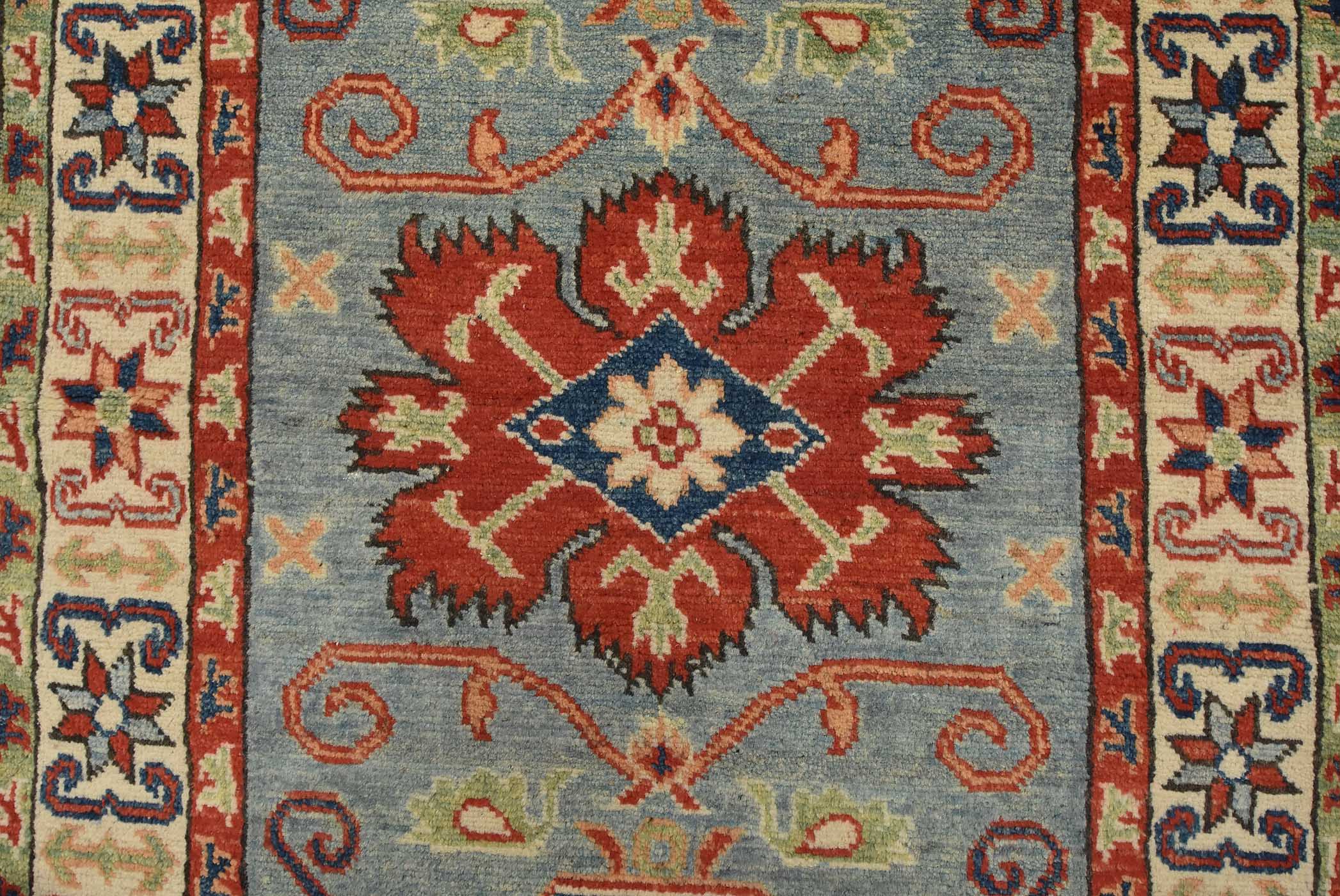 A tribal Caucasian Kazak rug hand-knotted with fine wool on a cotton foundation. This rug features a central medallion surrounded by botanical motifs set against a blue background. It is new and in excellent condition.