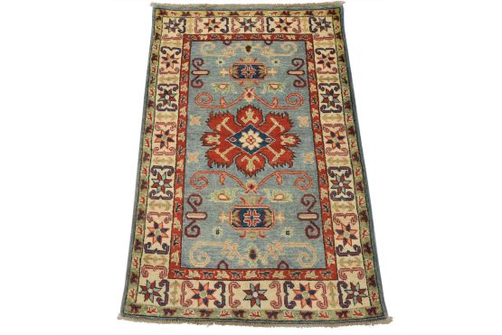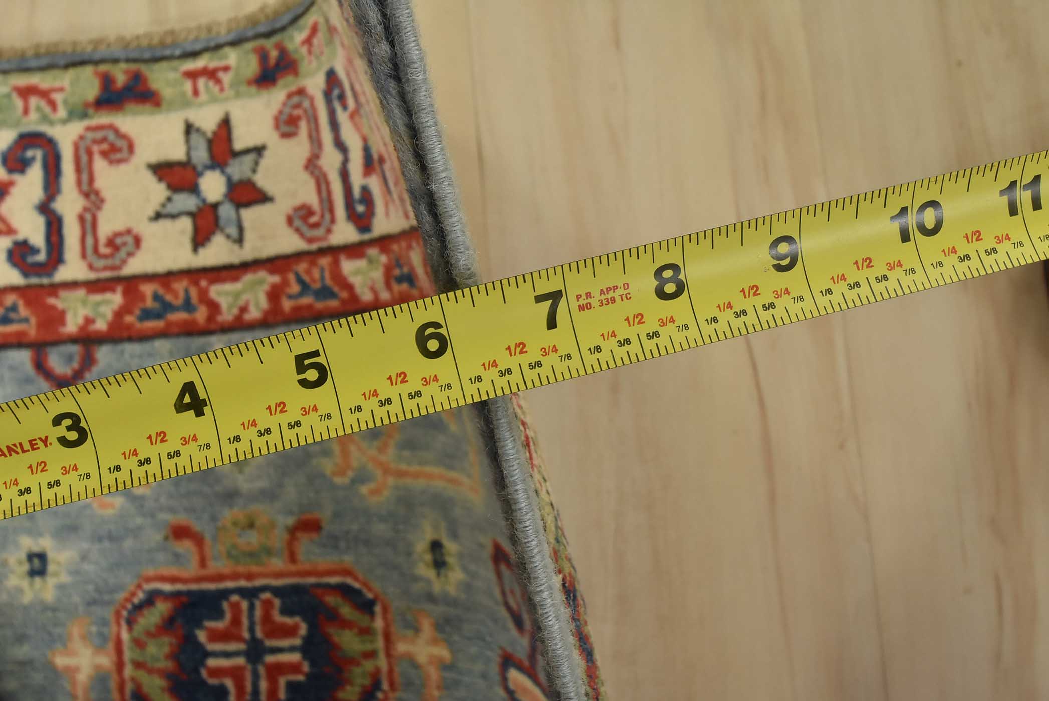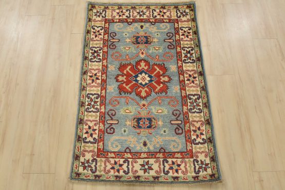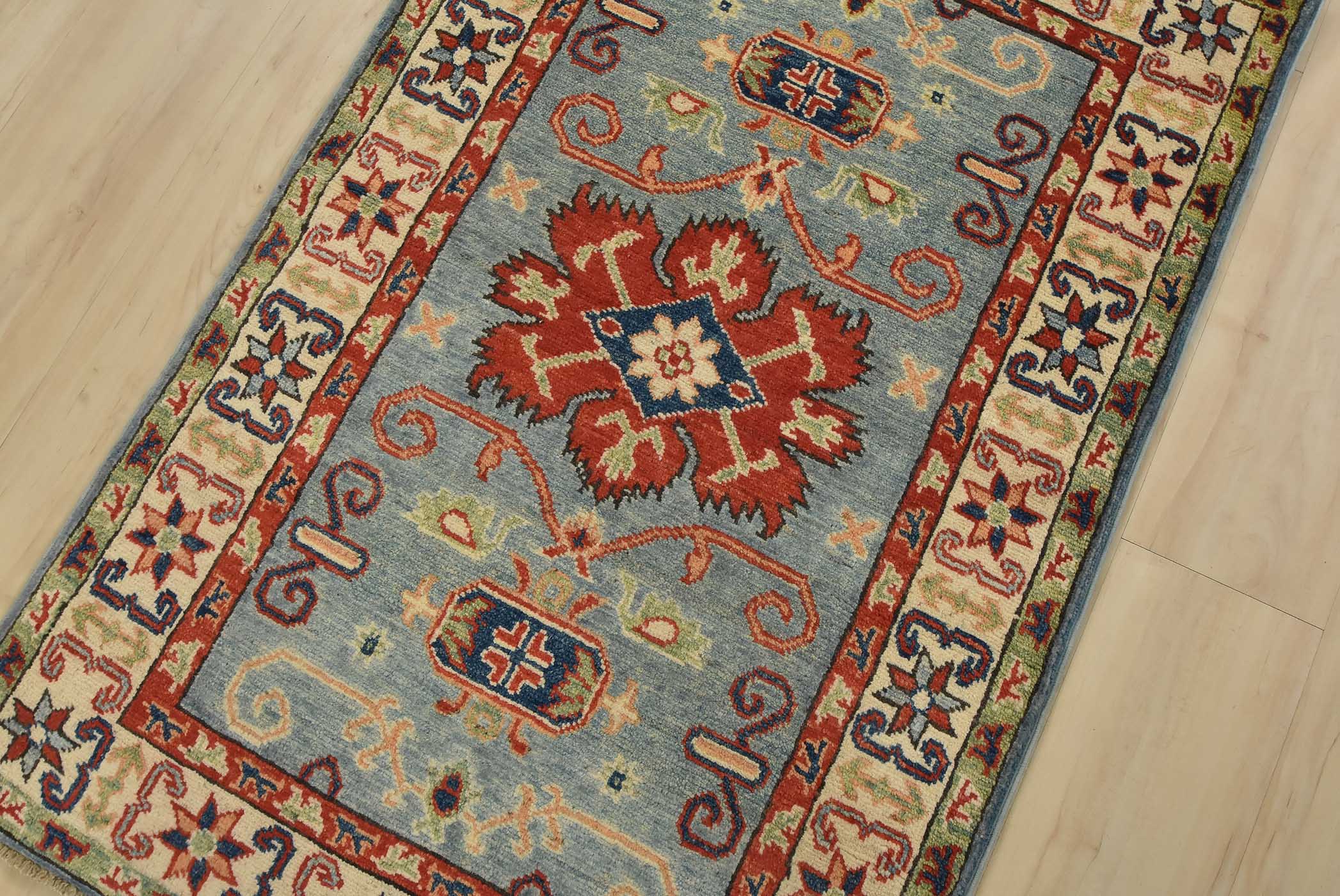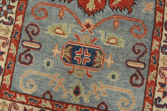 A tribal Caucasian Kazak rug hand-knotted with fine wool on a cotton foundation. This rug features a central medallion surrounded by botanical motifs set against a blue background. It is new and in excellent condition.