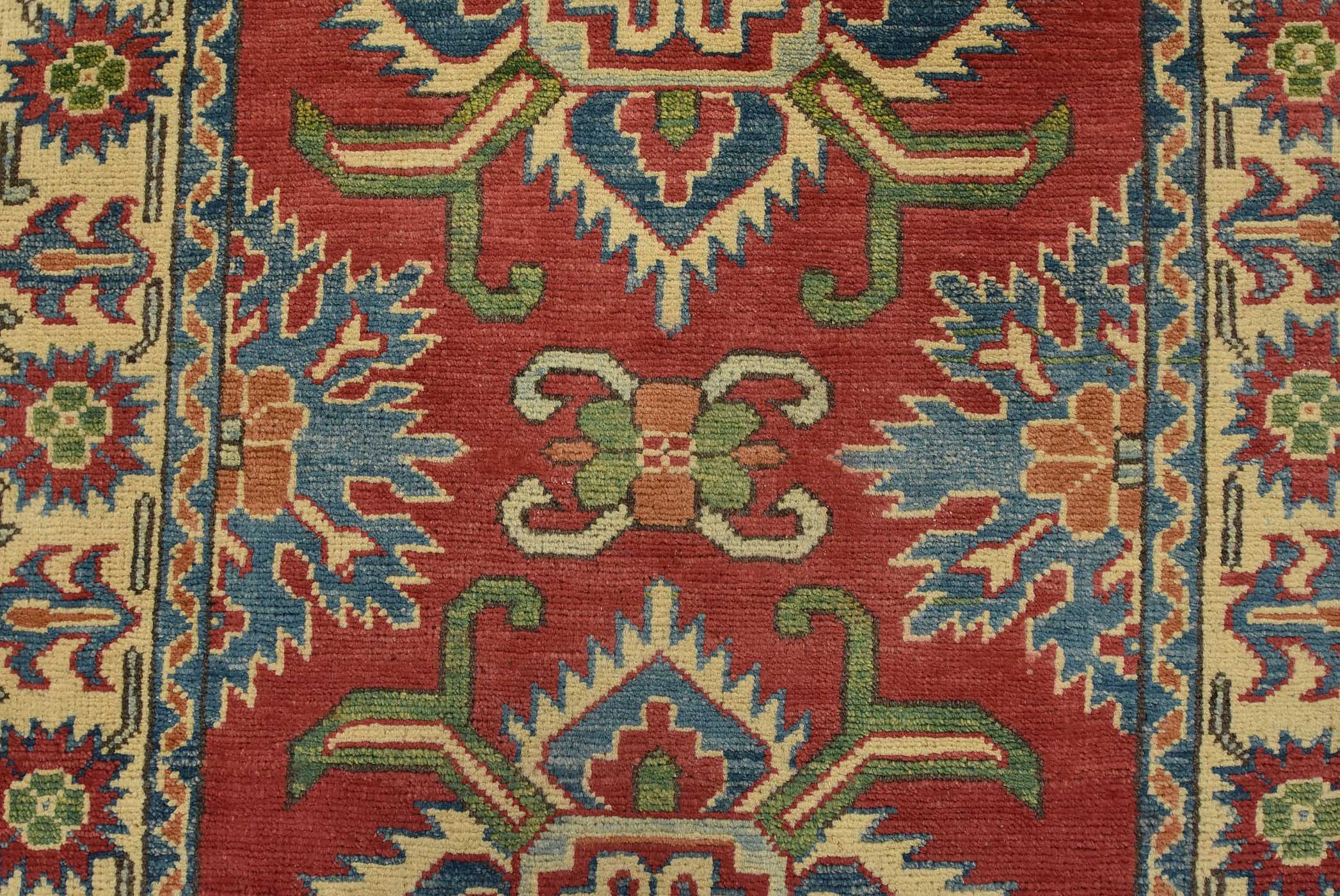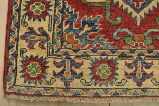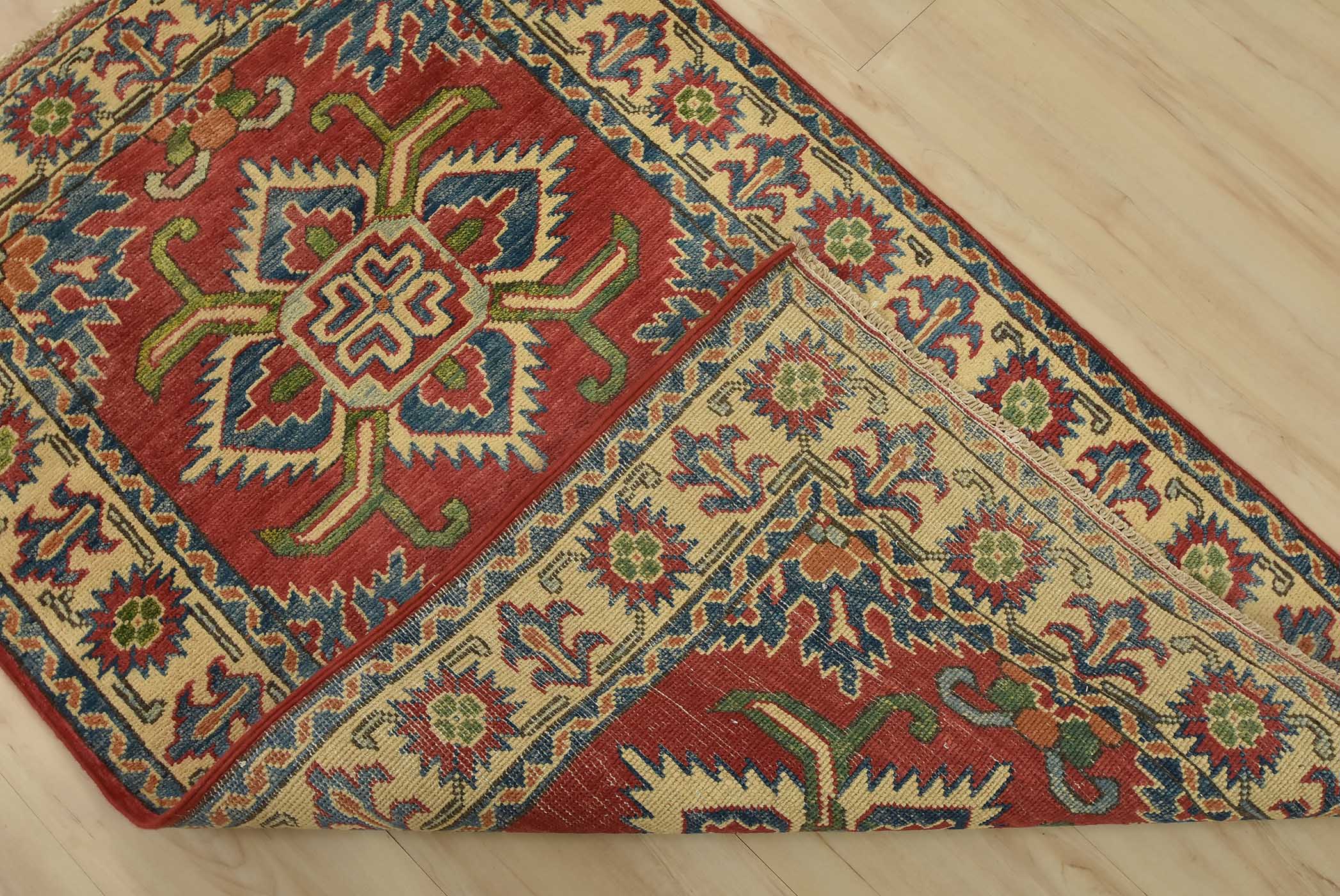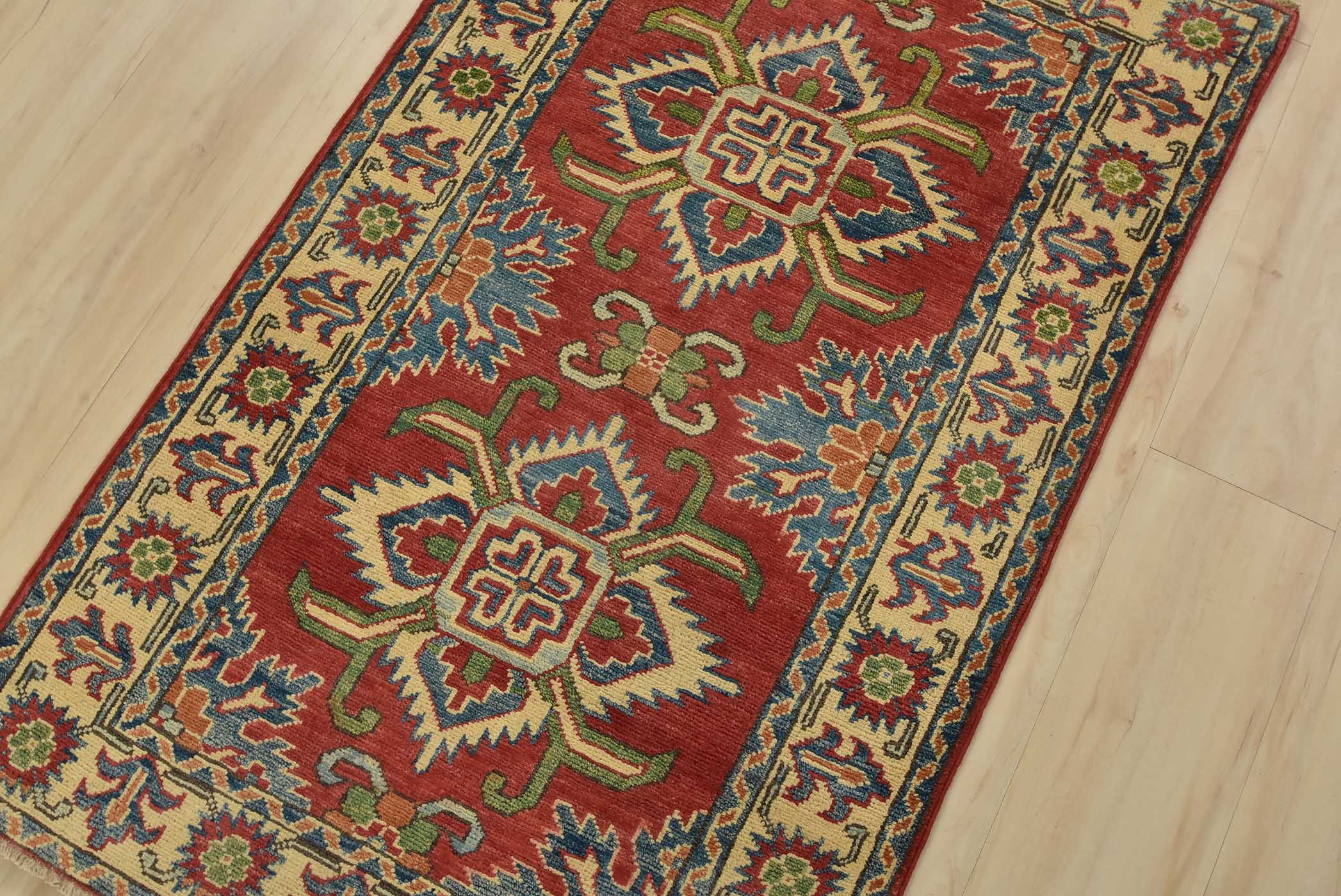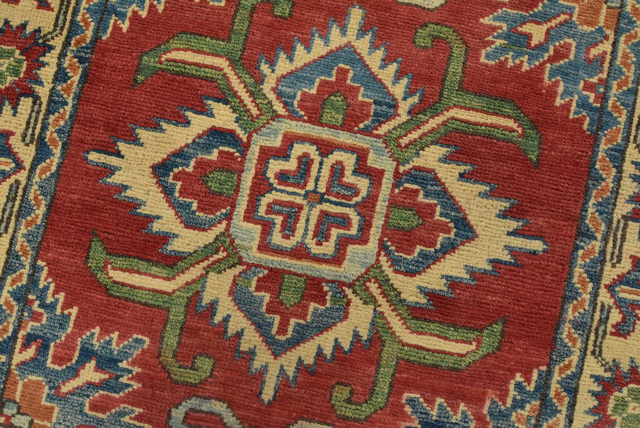 A tribal Caucasian Kazak rug hand-knotted with fine wool on a cotton foundation. This rug features geometric medallions set against a red background. It is new and in excellent condition.
