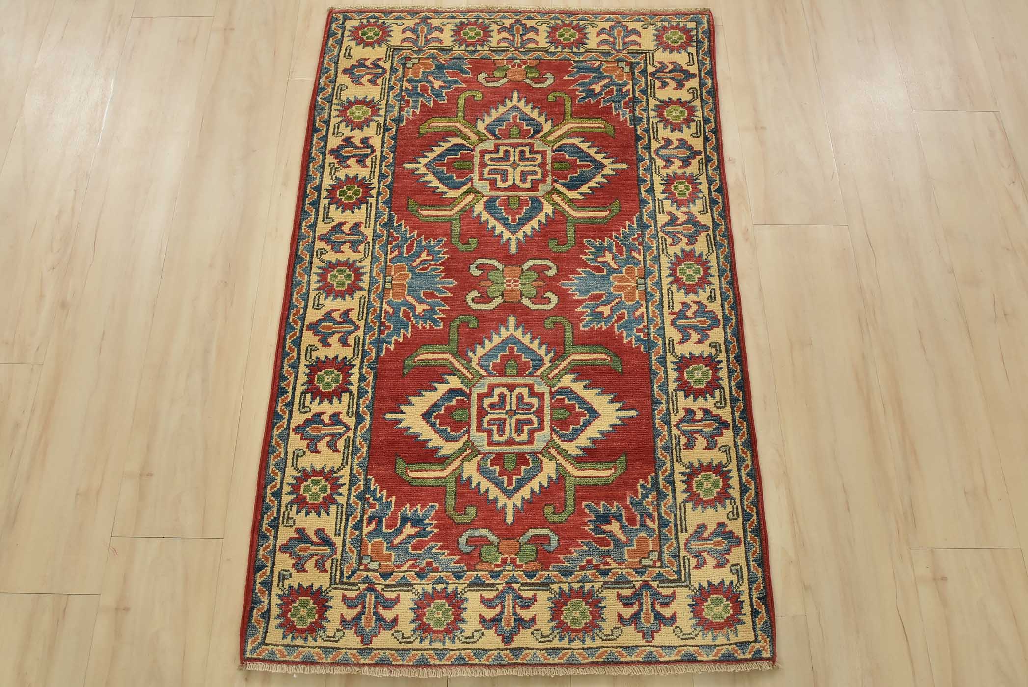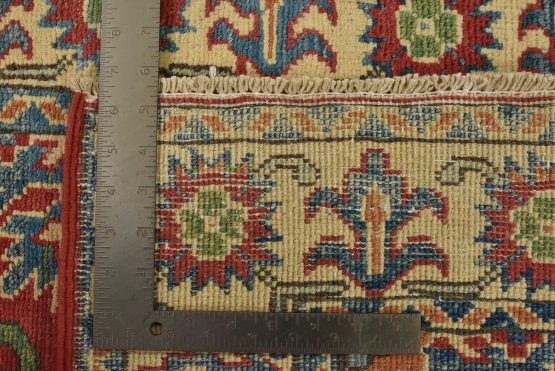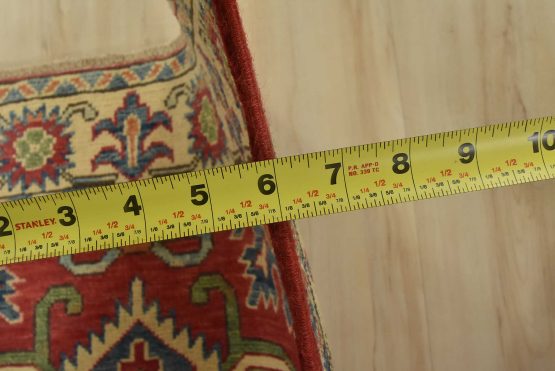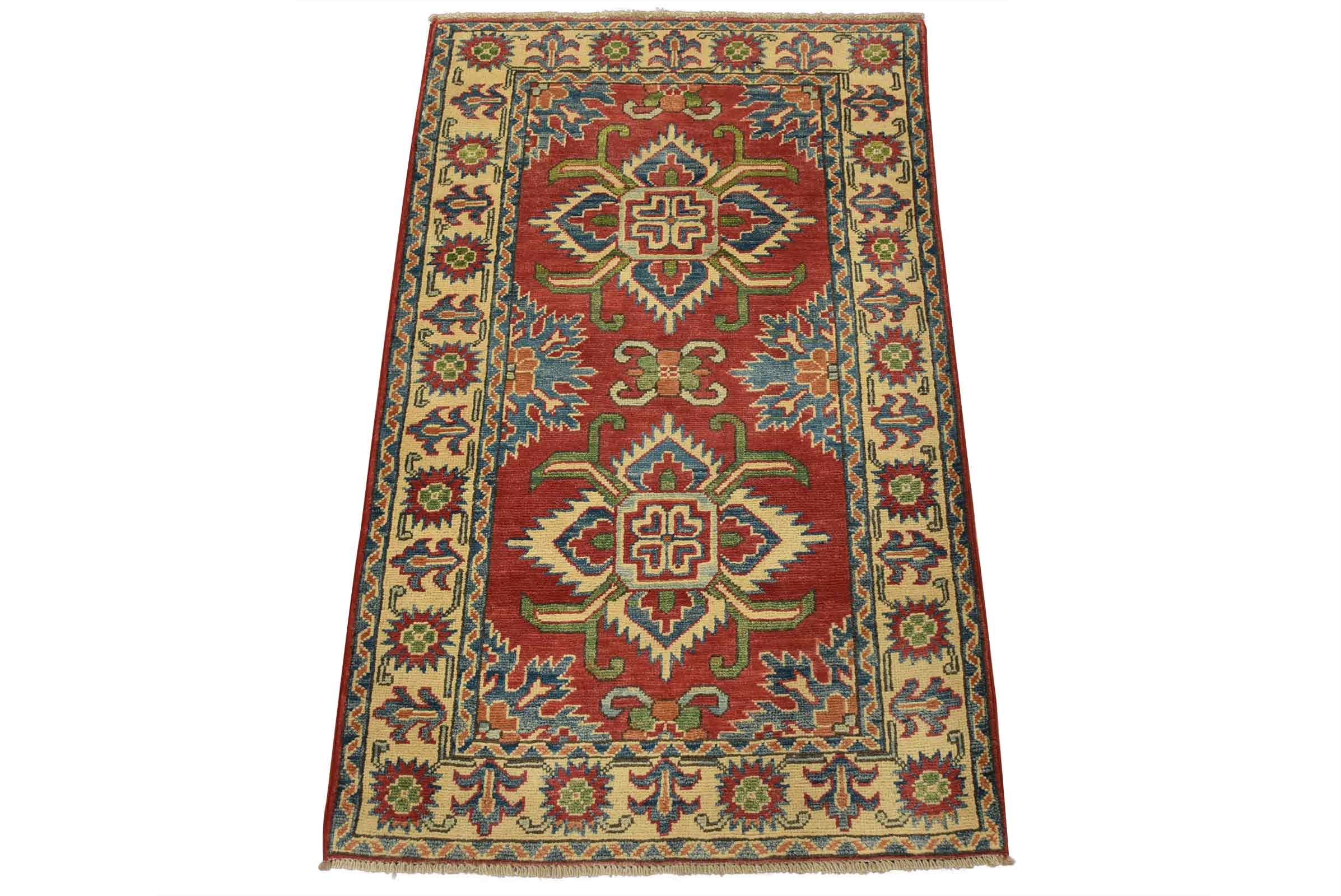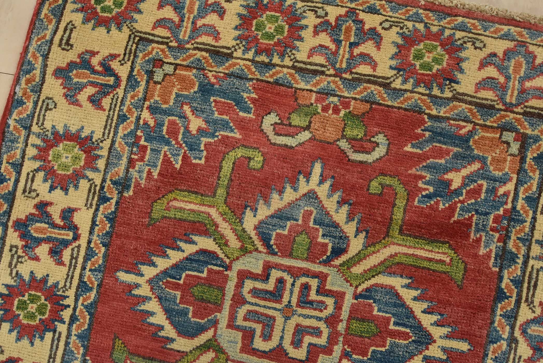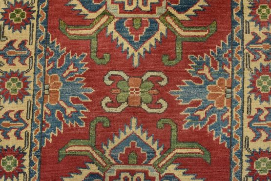 A tribal Caucasian Kazak rug hand-knotted with fine wool on a cotton foundation. This rug features geometric medallions set against a red background. It is new and in excellent condition.