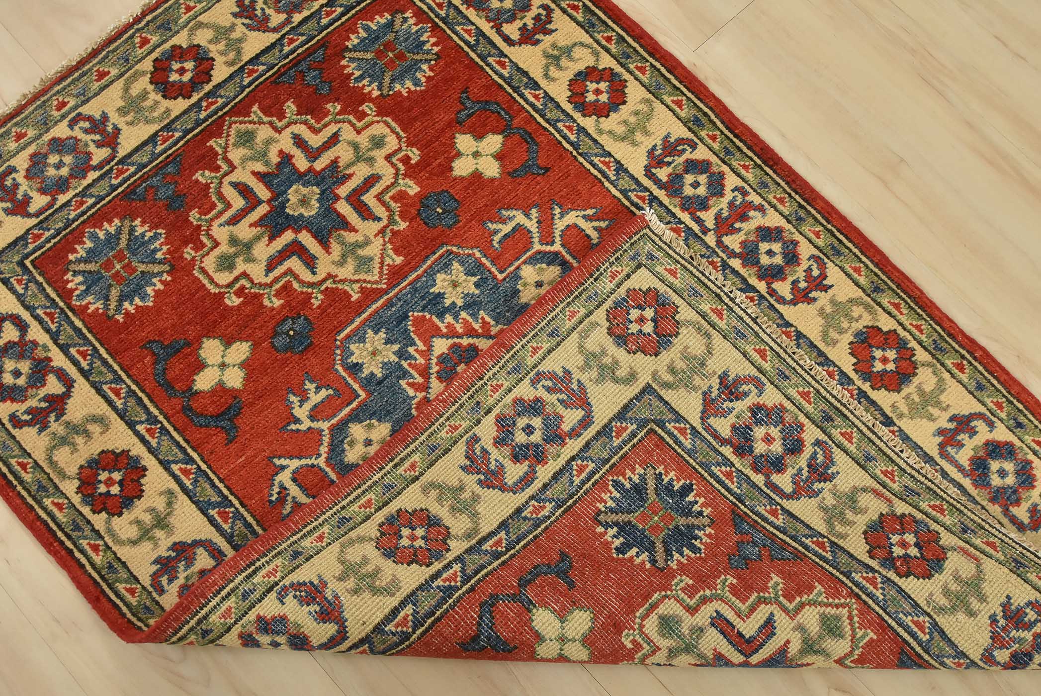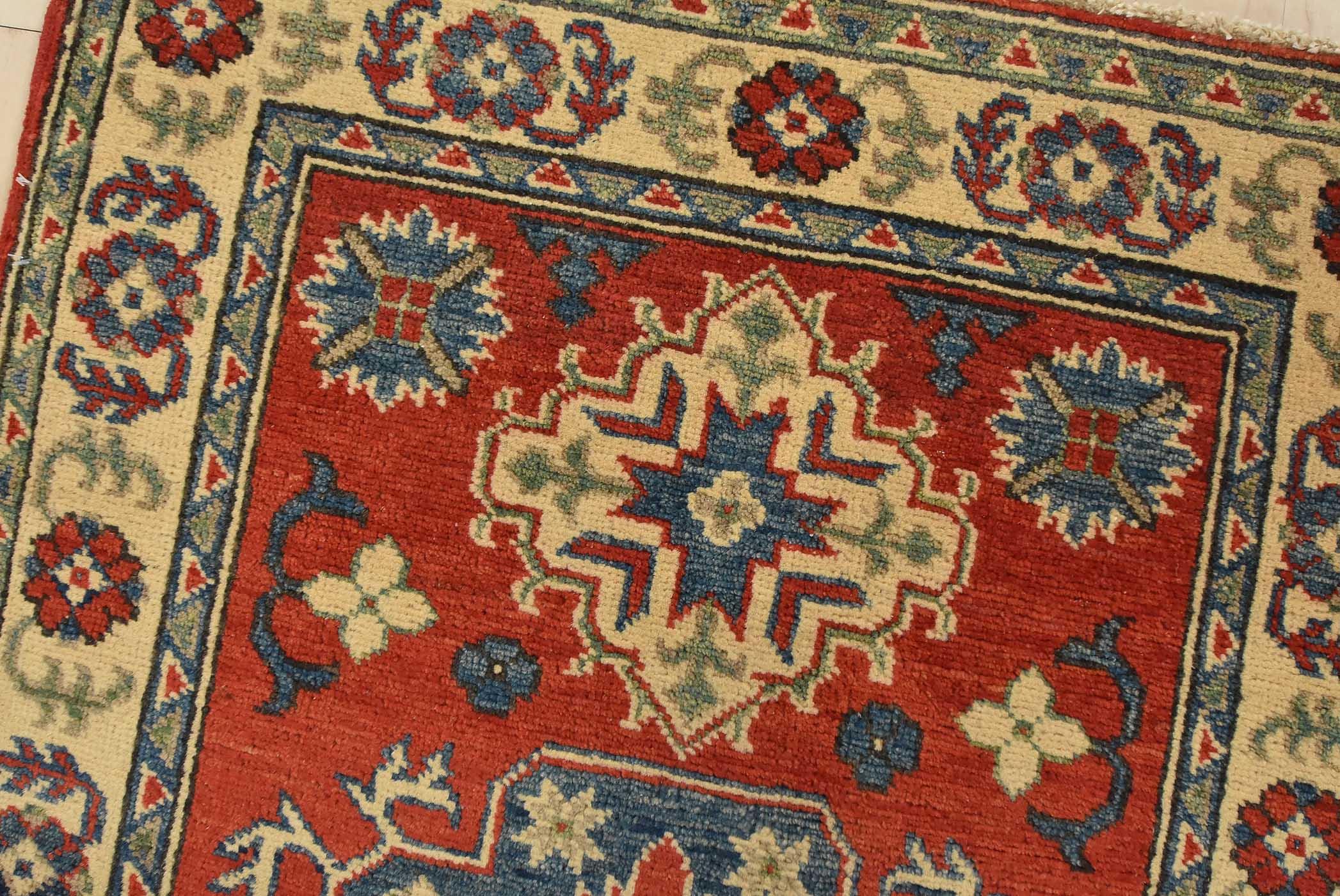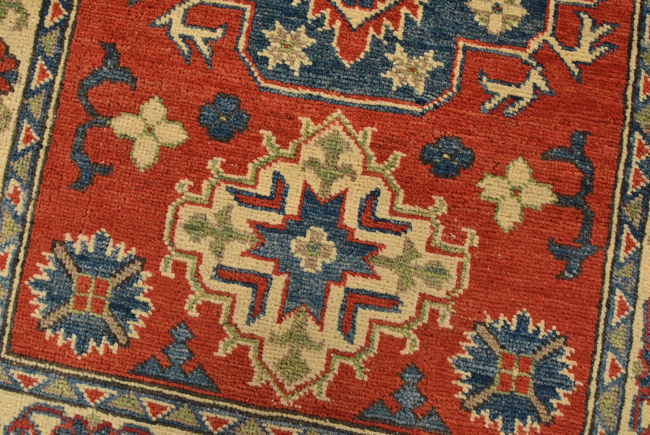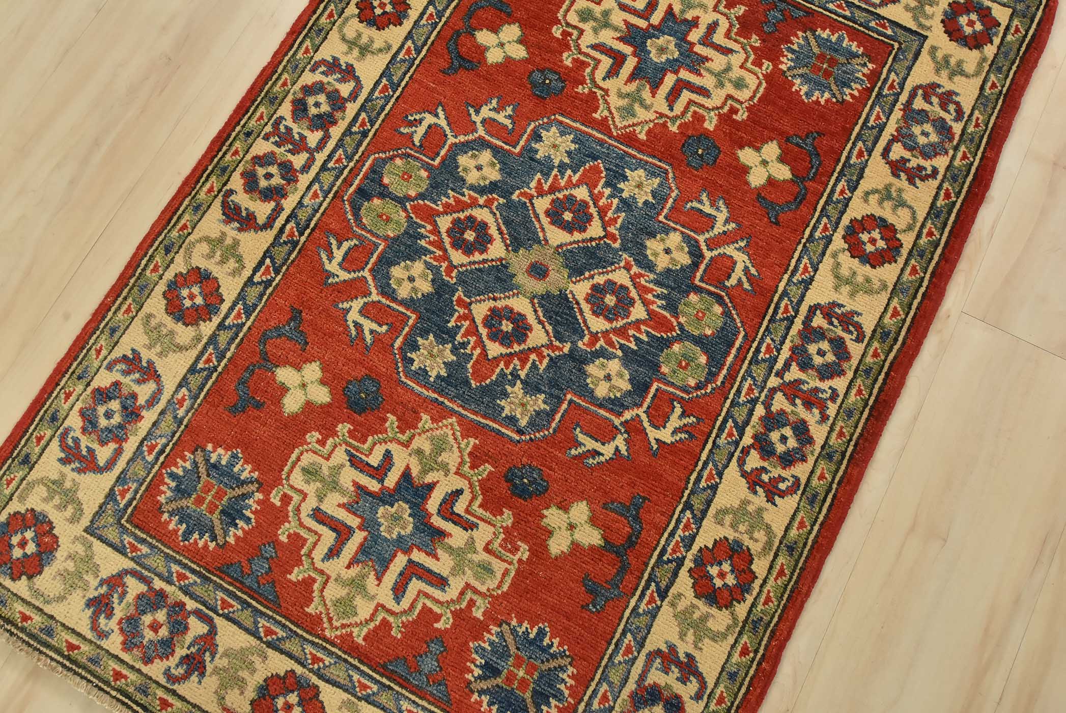 A tribal Caucasian Kazak rug hand-knotted with fine wool on a cotton foundation. This rug features a central medallion surrounded by smaller geometric motifs set against a red background. It is new and in excellent condition.