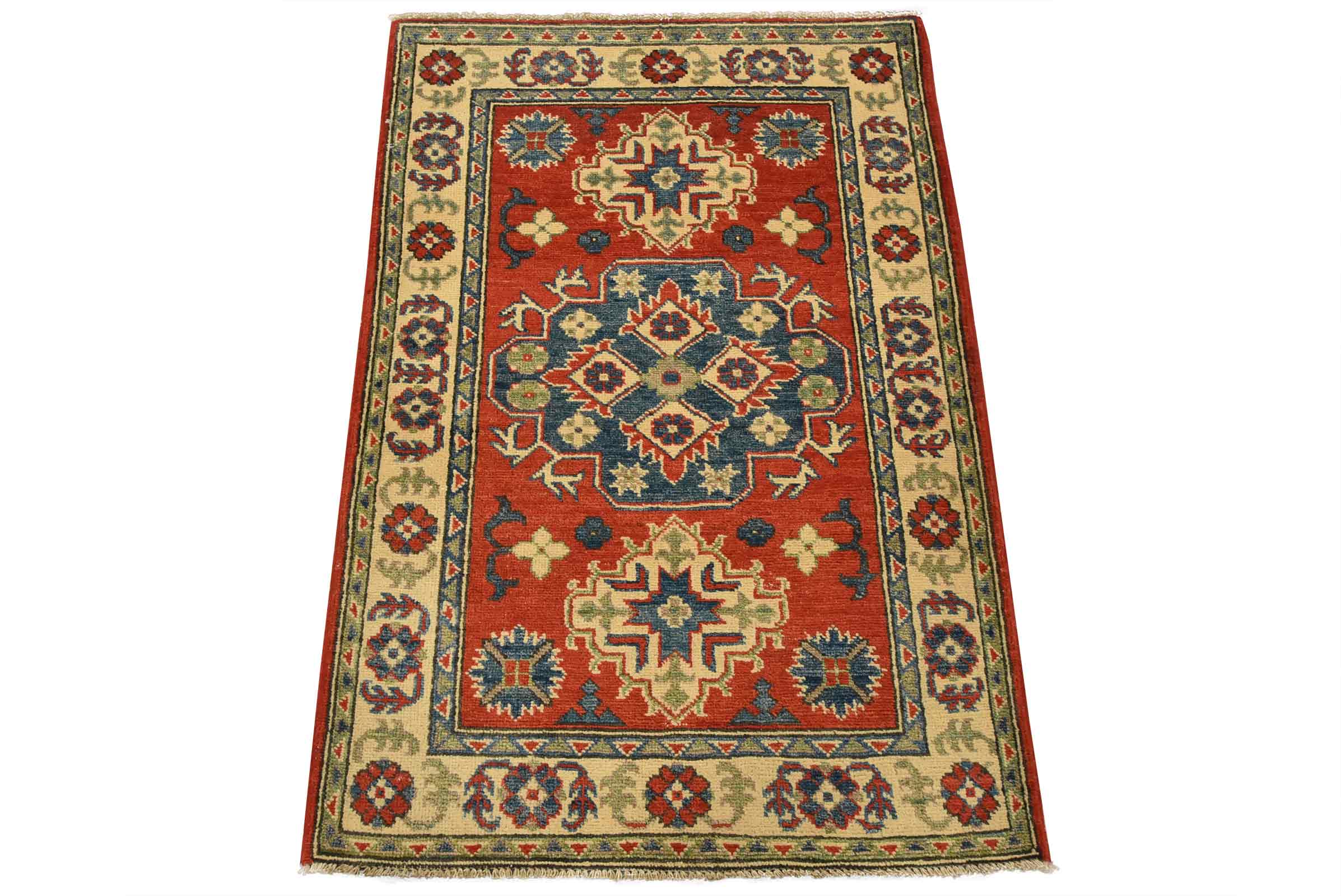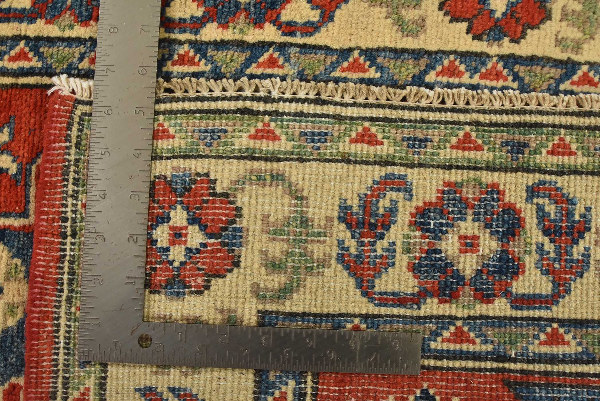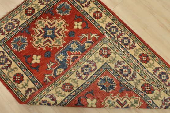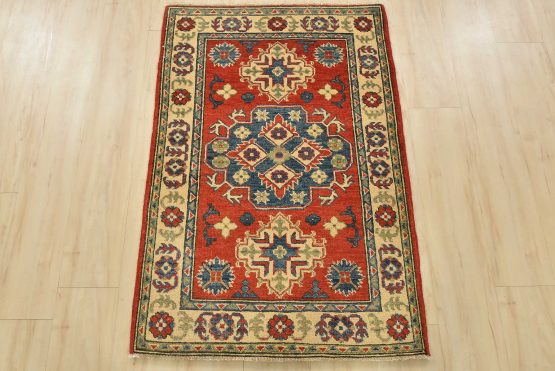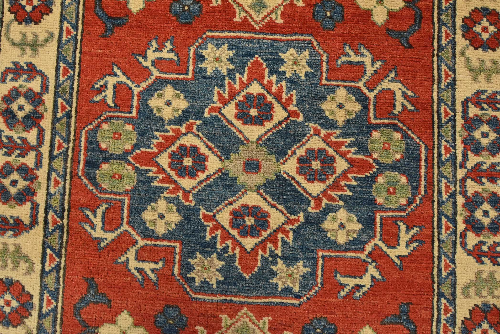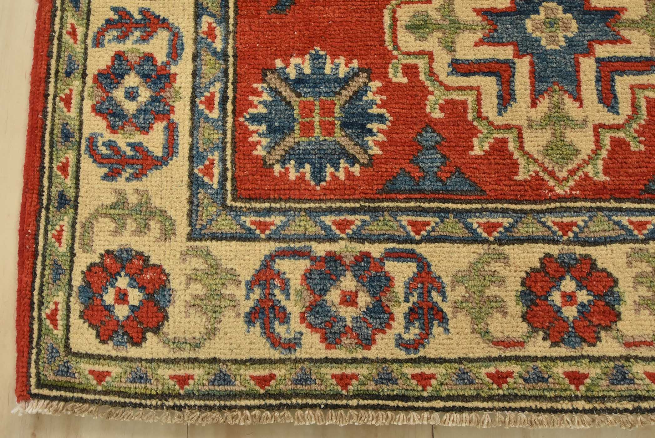 A tribal Caucasian Kazak rug hand-knotted with fine wool on a cotton foundation. This rug features a central medallion surrounded by smaller geometric motifs set against a red background. It is new and in excellent condition.