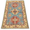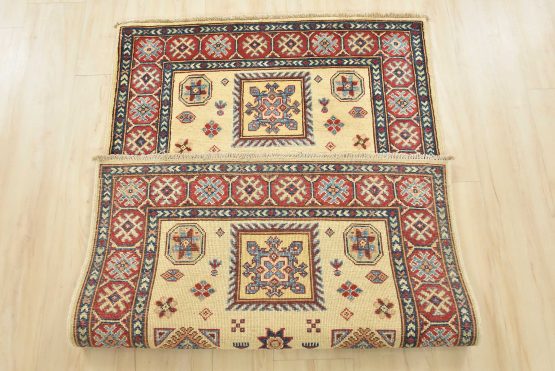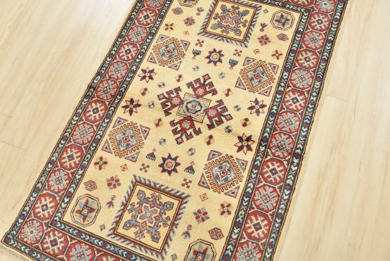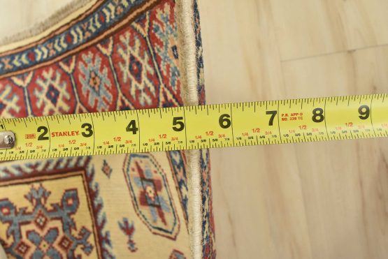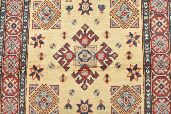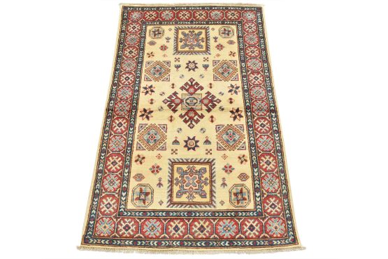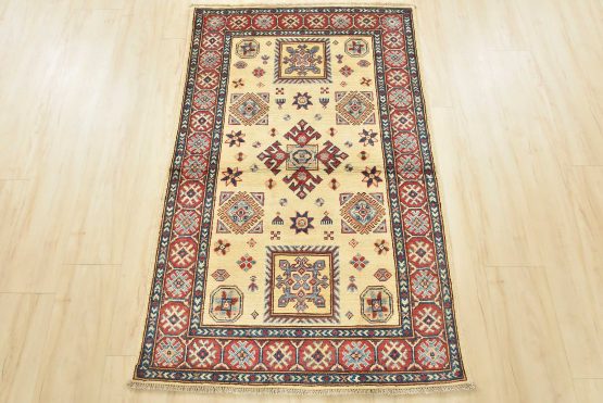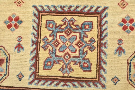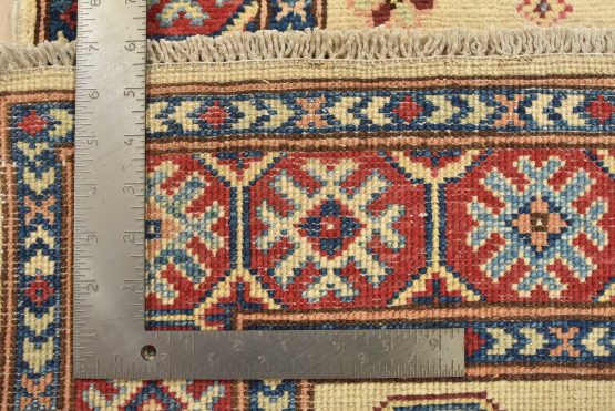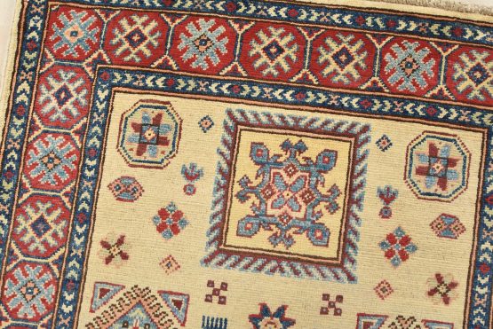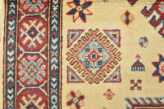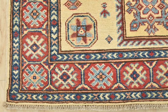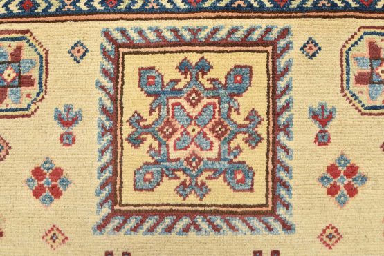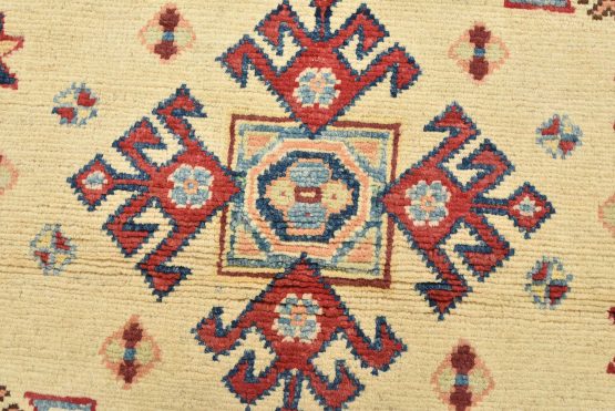 A tribal Caucasian Kazak rug hand-knotted with an all-wool pile on a cotton foundation. This oriental rug features a central geometric medallion surrounded by geometric motifs set against a beige background. It is new and in excellent condition.