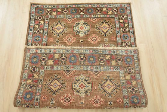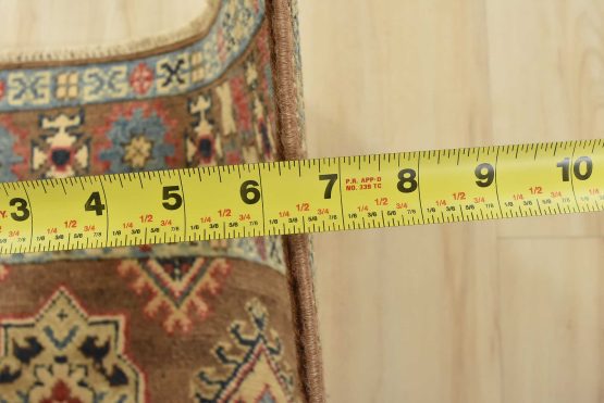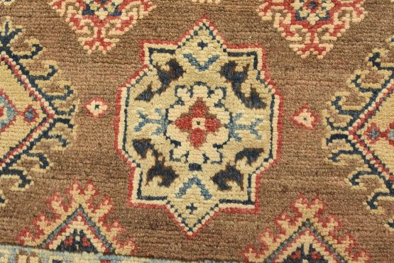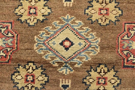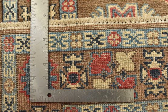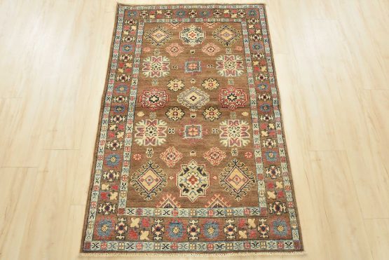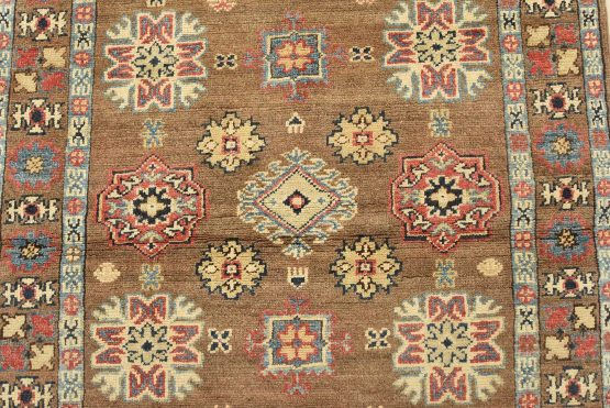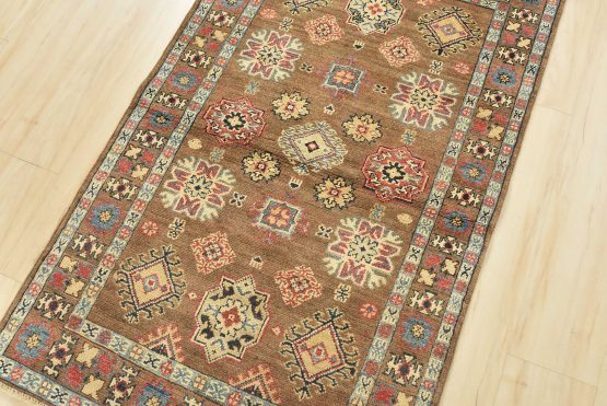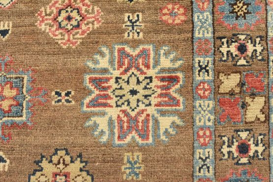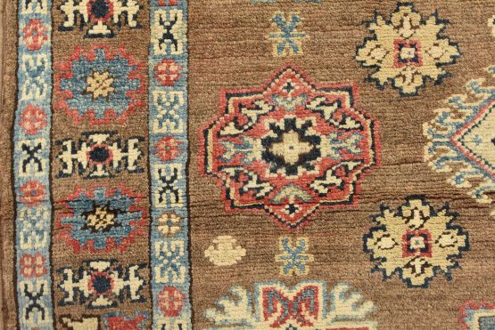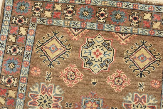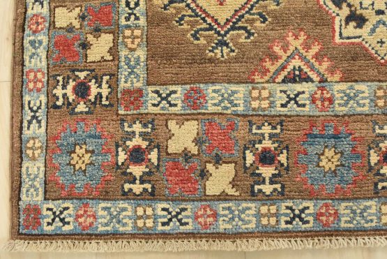 A tribal Caucasian Kazak rug hand-knotted with an all-wool pile on a cotton foundation. This oriental rug features geometric motifs set against a brown background. It is new and in excellent condition.