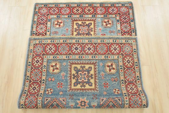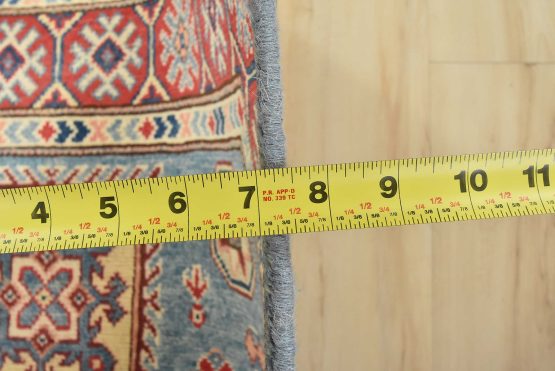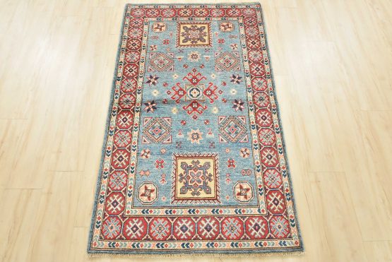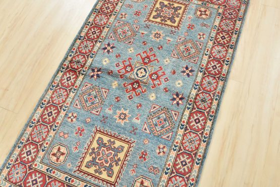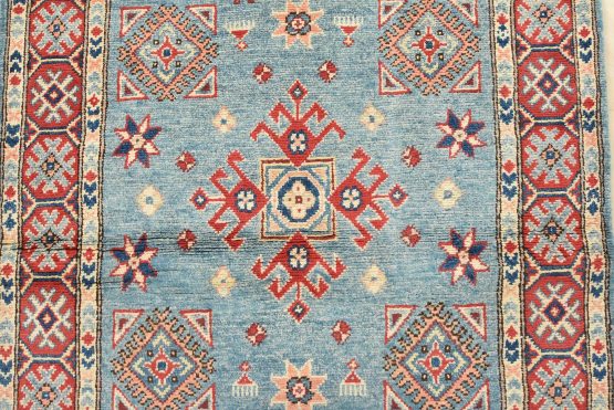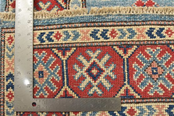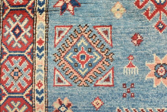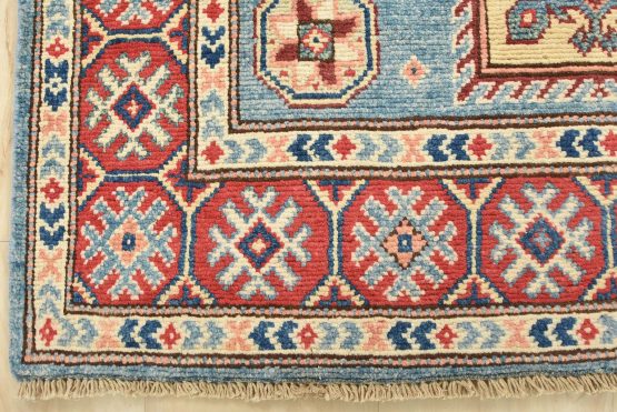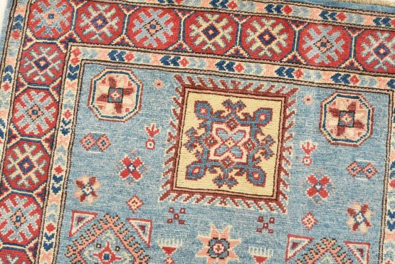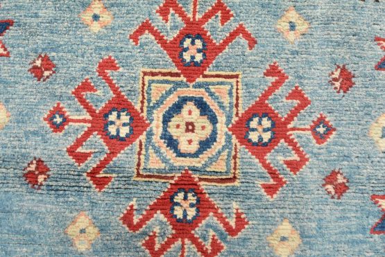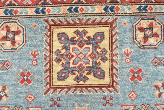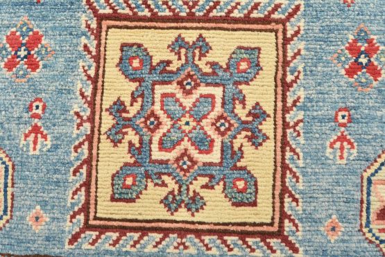 A tribal Caucasian Kazak rug hand-knotted with an all-wool pile on a cotton foundation. This oriental rug features a central geometric medallion surrounded by geometric motifs set against a blue background. It is new and in excellent condition.
