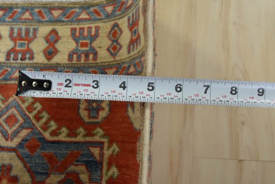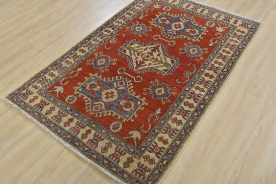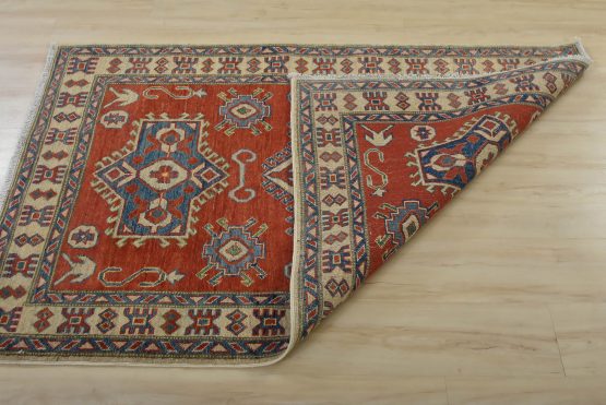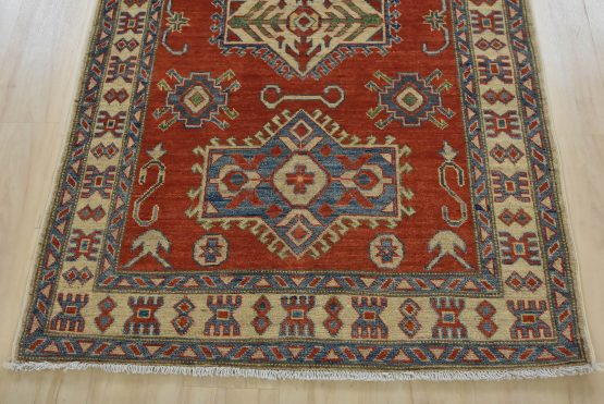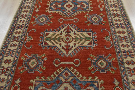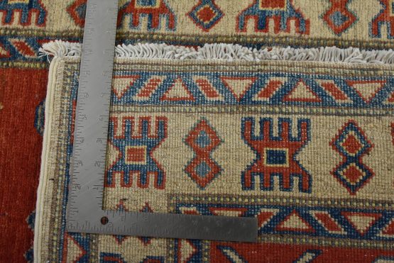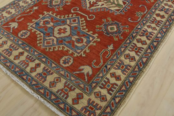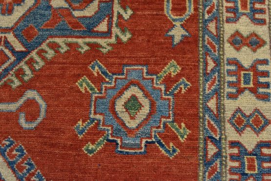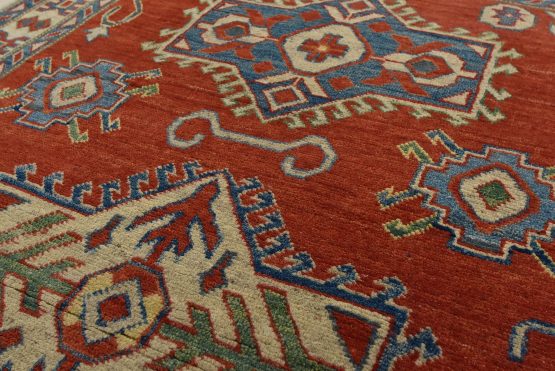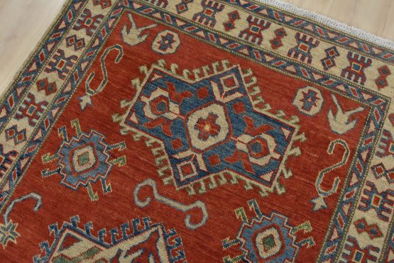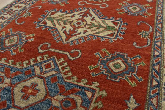 A tribal Caucasian Kazak rug hand-knotted with an all-wool pile on a cotton foundation. This oriental rug features geometric medallions surrounded by geometric motifs set against a red background. It is new and in excellent condition.