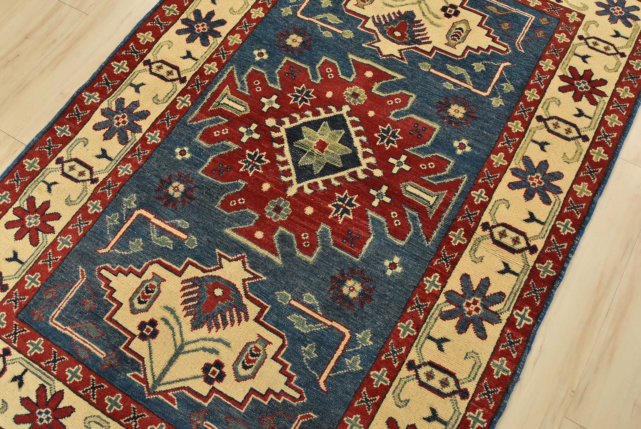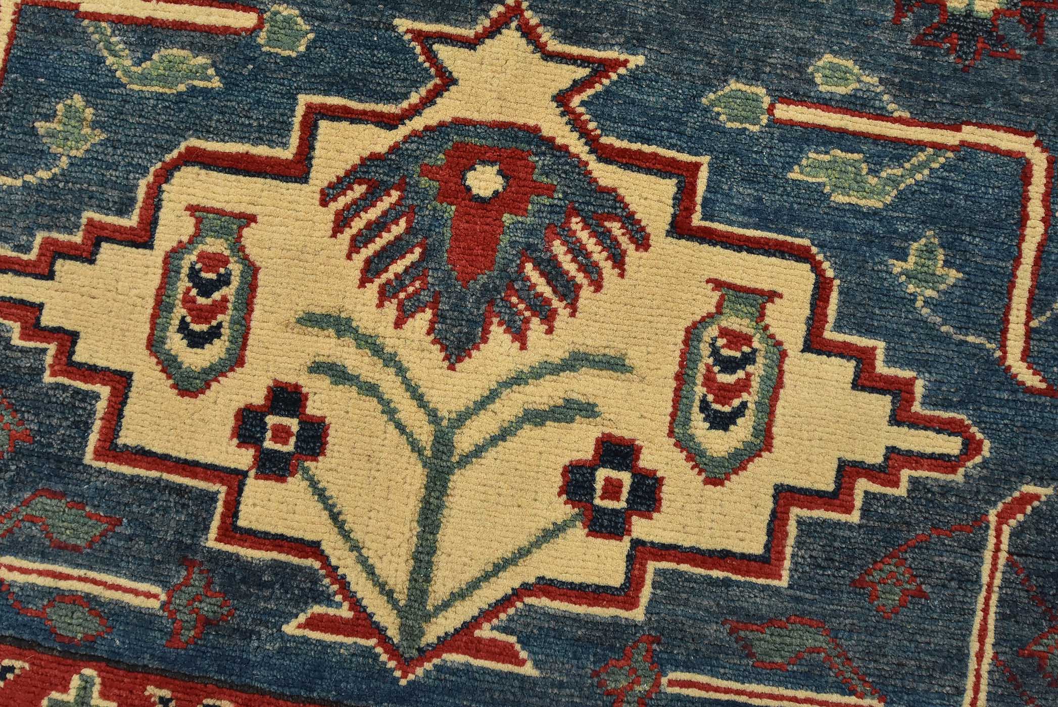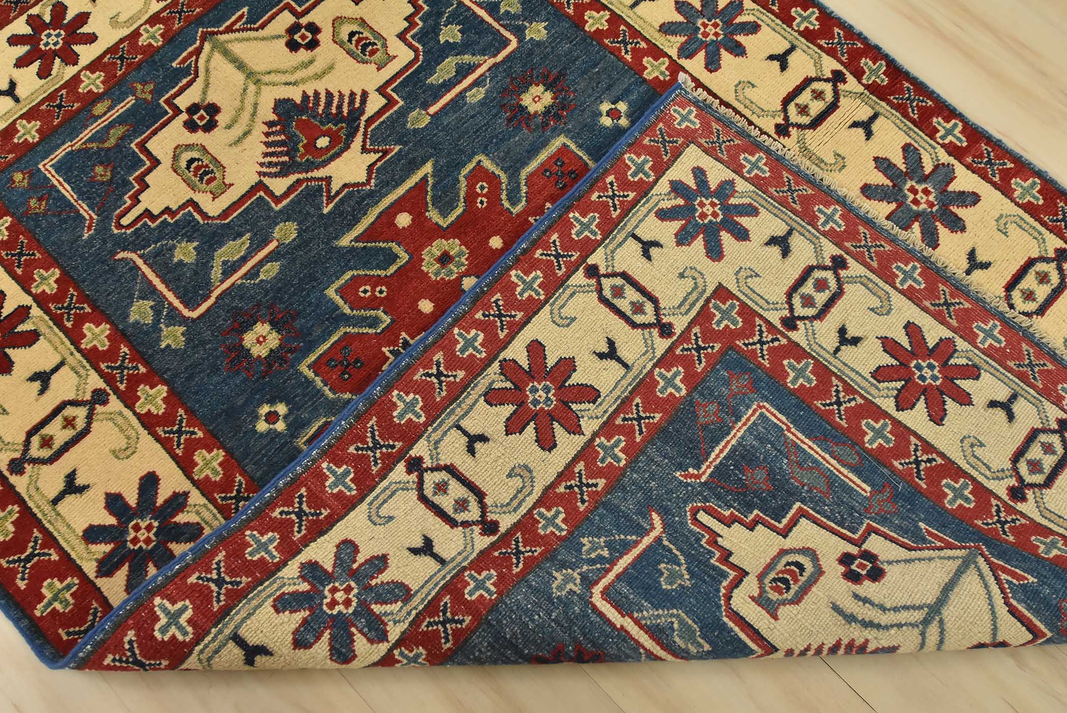 A tribal Caucasian Kazak rug hand-knotted with fine wool on a cotton foundation. This oriental rug features geometric medallions surrounded by botanical motifs set against a blue background. It is new and in excellent condition.