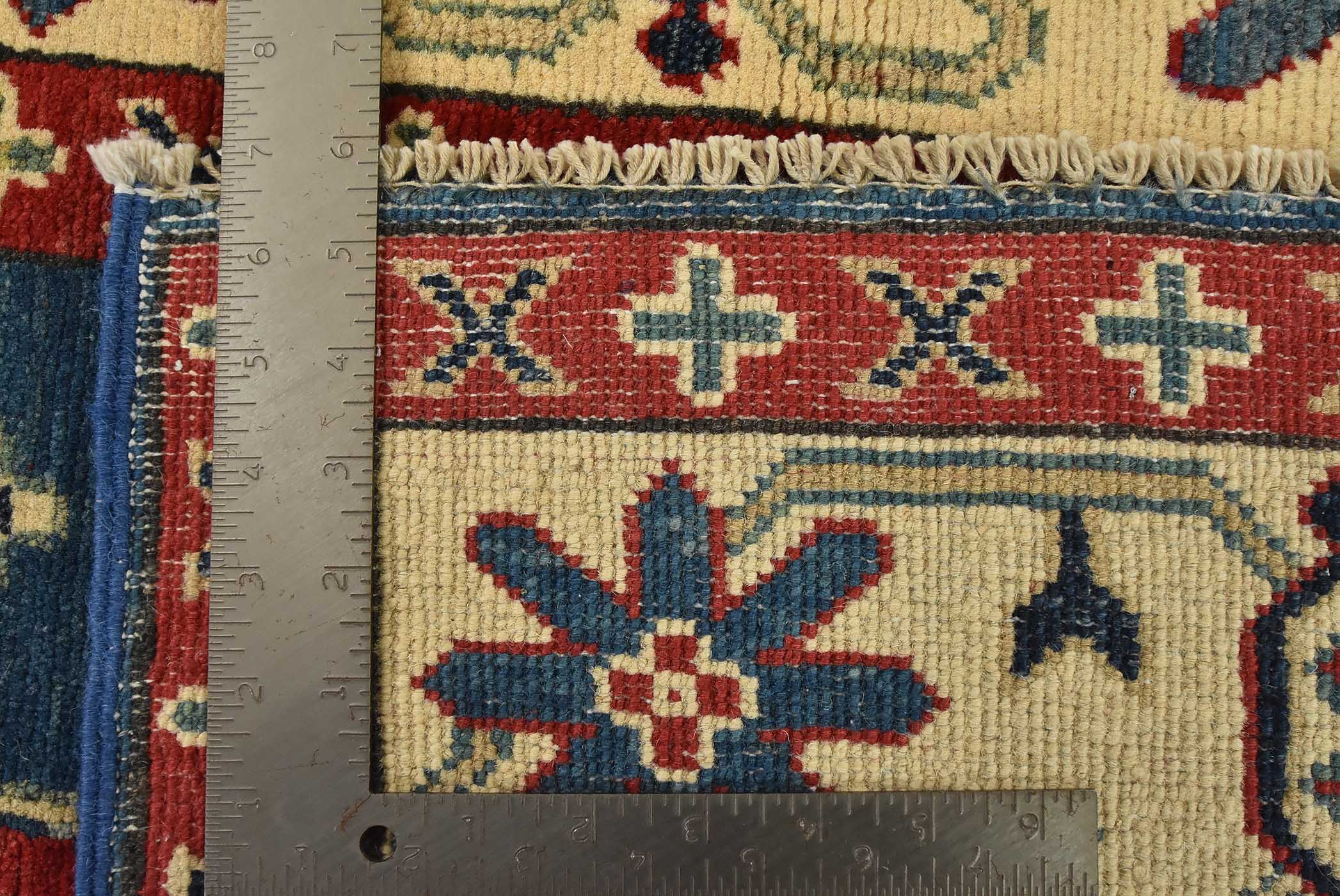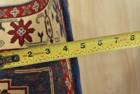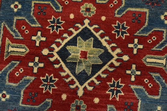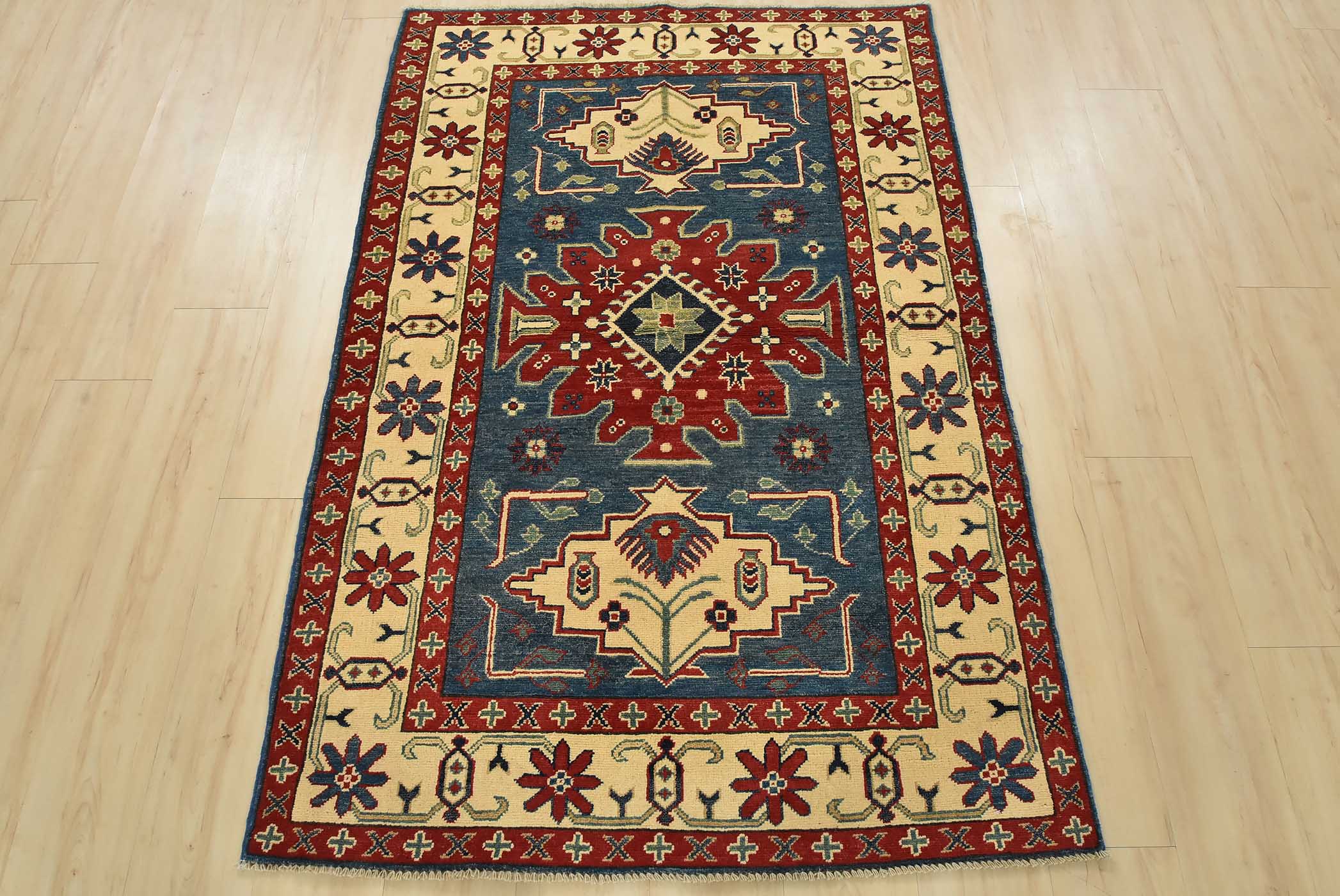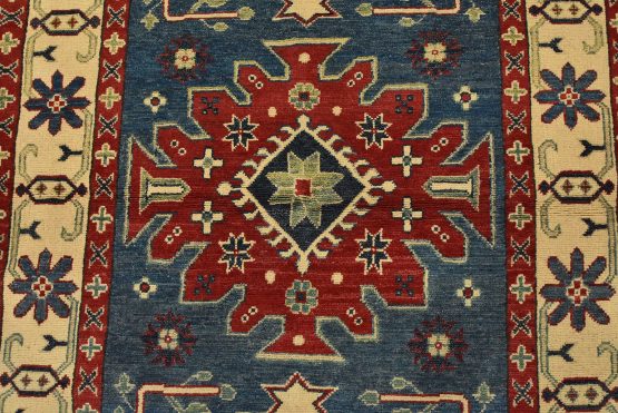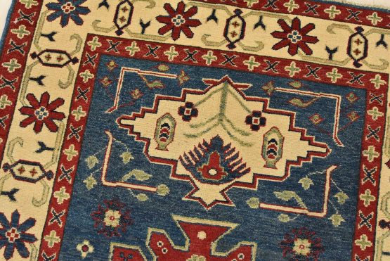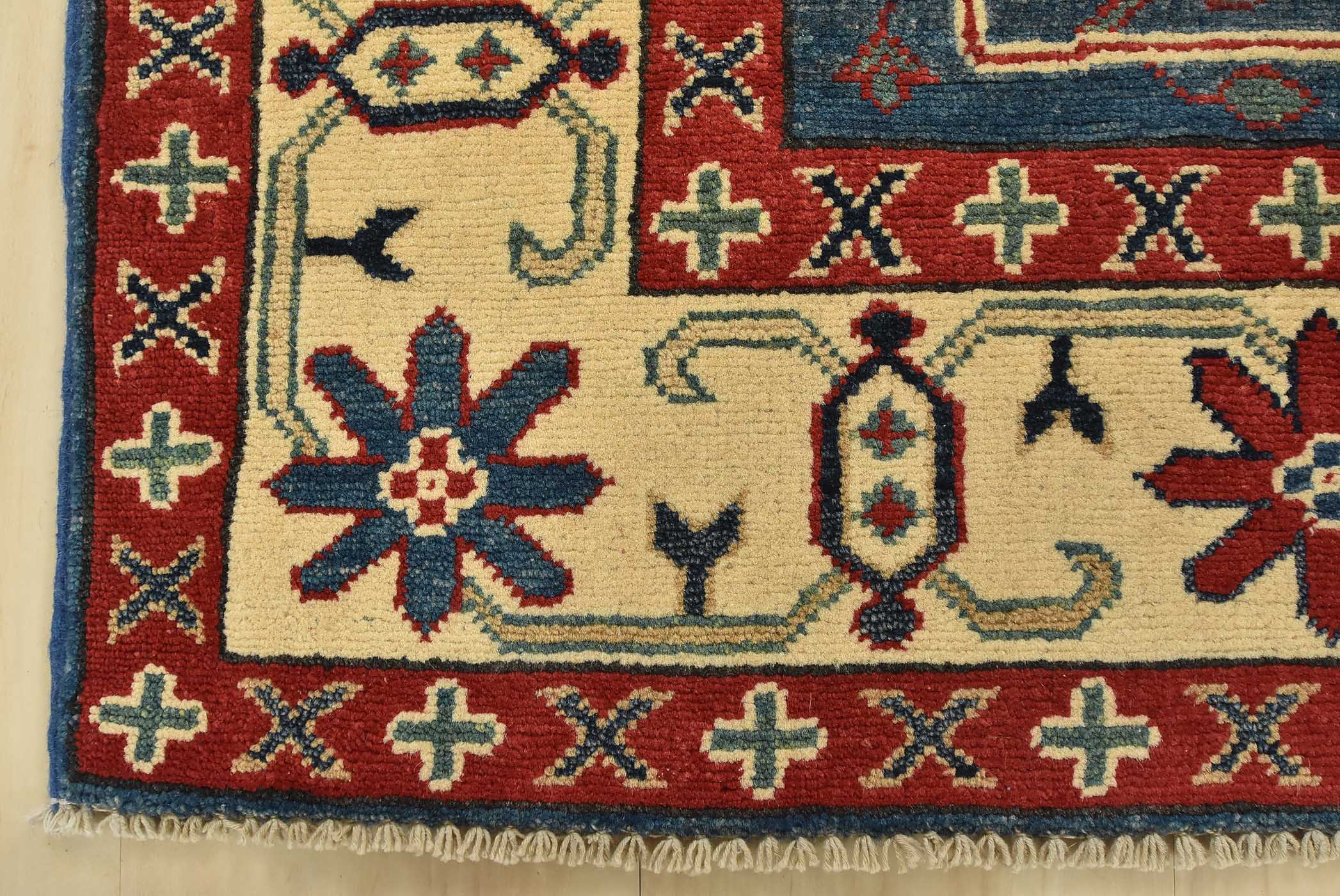 A tribal Caucasian Kazak rug hand-knotted with fine wool on a cotton foundation. This oriental rug features geometric medallions surrounded by botanical motifs set against a blue background. It is new and in excellent condition.