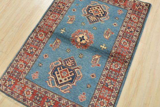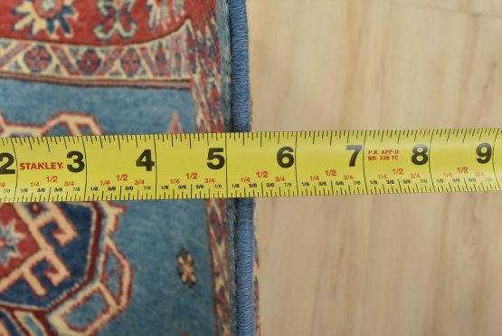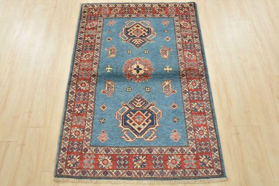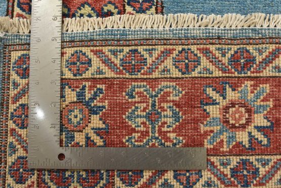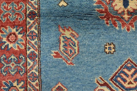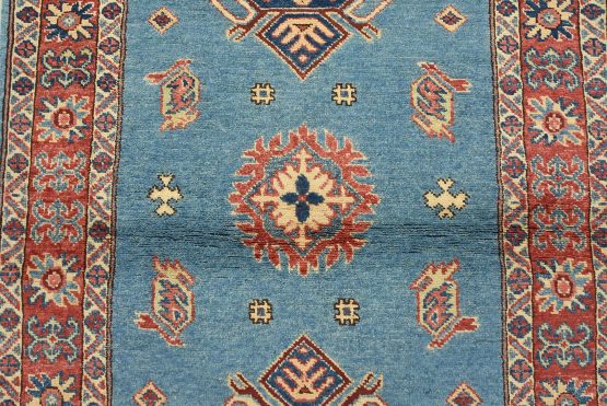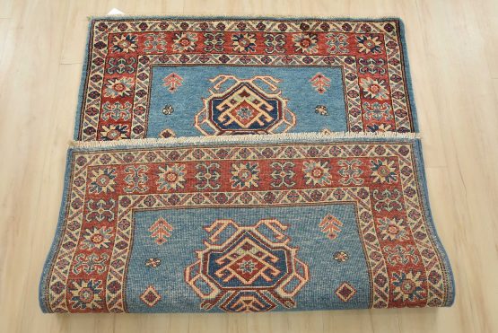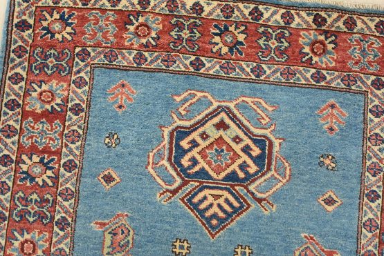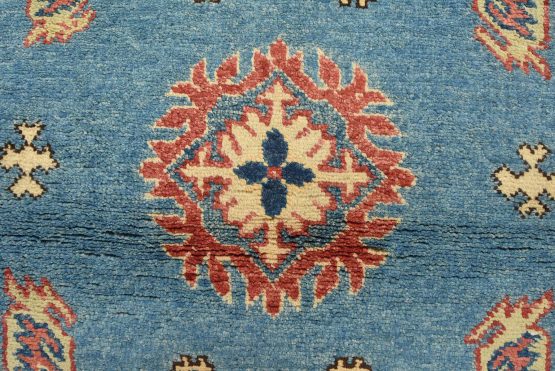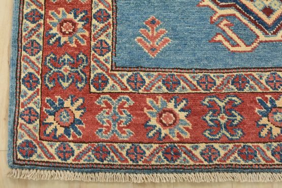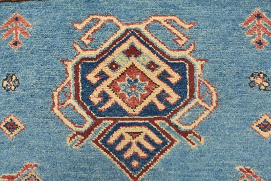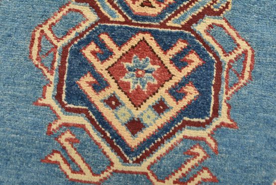 A tribal Caucasian Kazak rug is hand-knotted with an all-wool pile on a cotton foundation. This oriental rug features a small central geometric medallion surrounded by geometric motifs set against a blue background. It is new and in excellent condition.