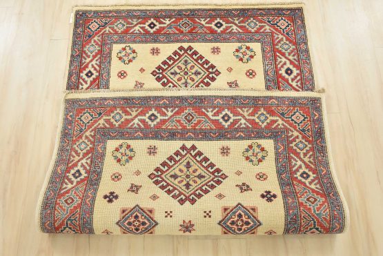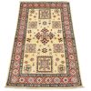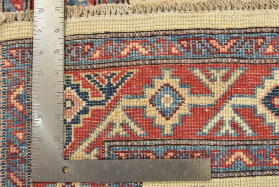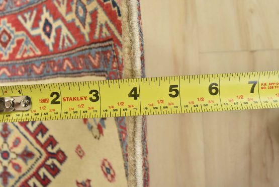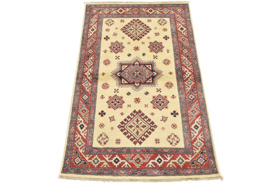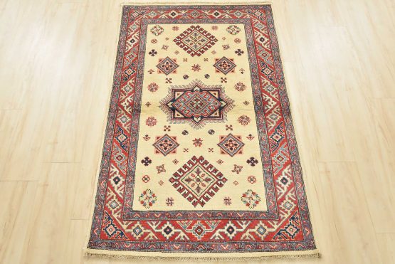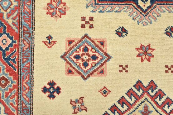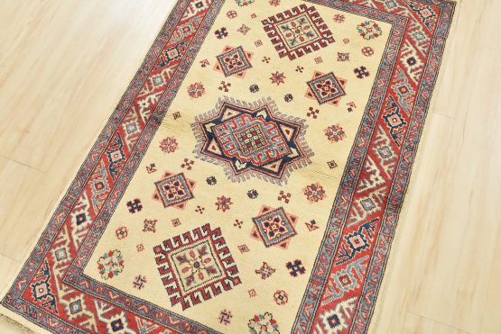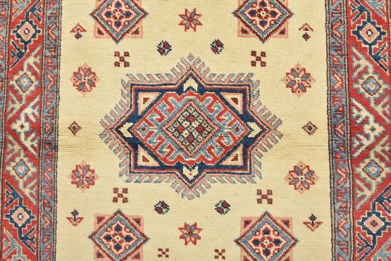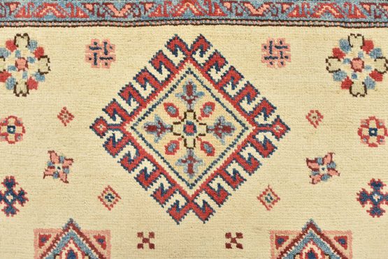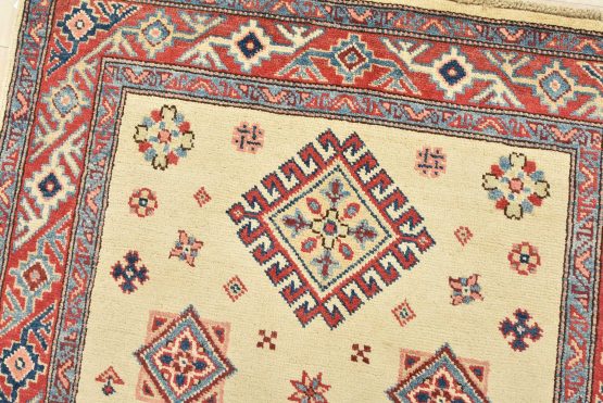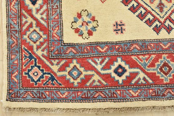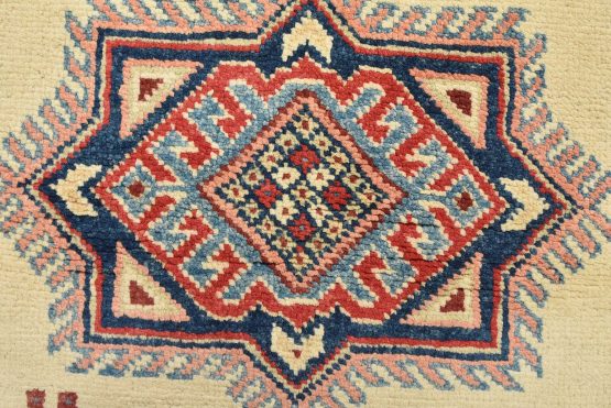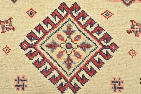 A tribal Caucasian Kazak rug hand-knotted with an all-wool pile on a cotton foundation. This oriental rug features a central geometric medallion surrounded by geometric motifs set against a beige background. It is new and in excellent condition.