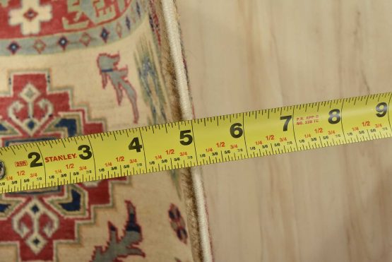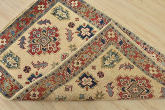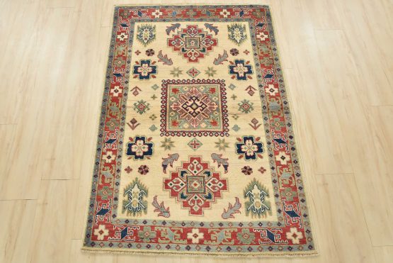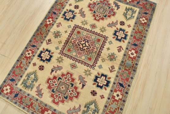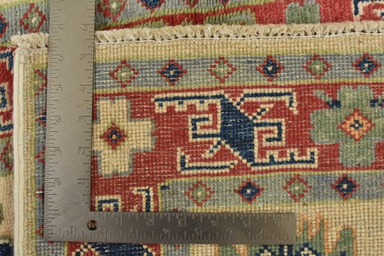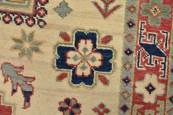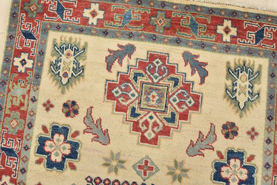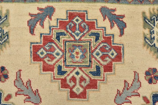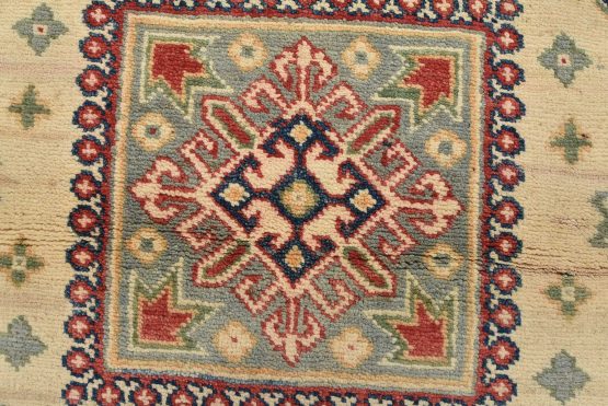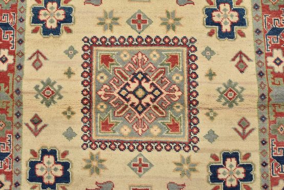 A tribal Caucasian Kazak rug hand-knotted with an all-wool pile on a cotton foundation. This oriental rug features geometric medallions surrounded by geometric motifs set against a beige background. It is new and in excellent condition.