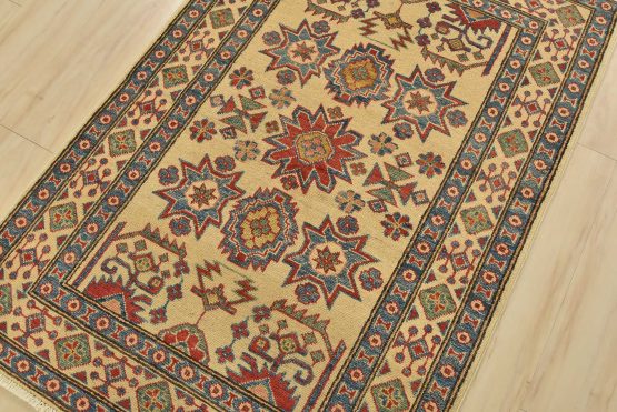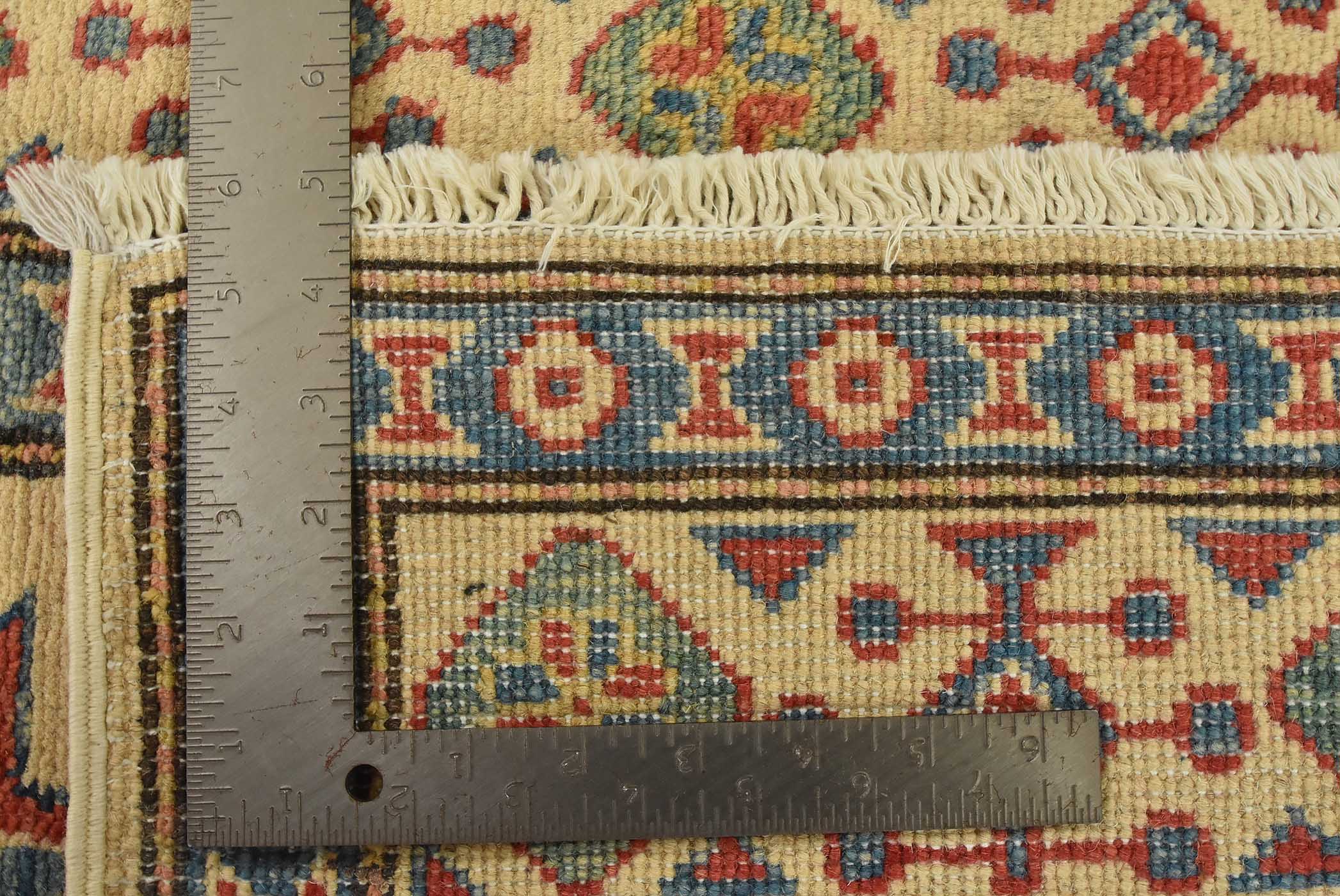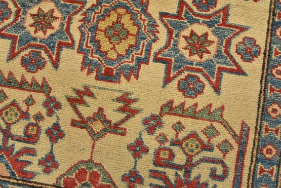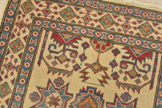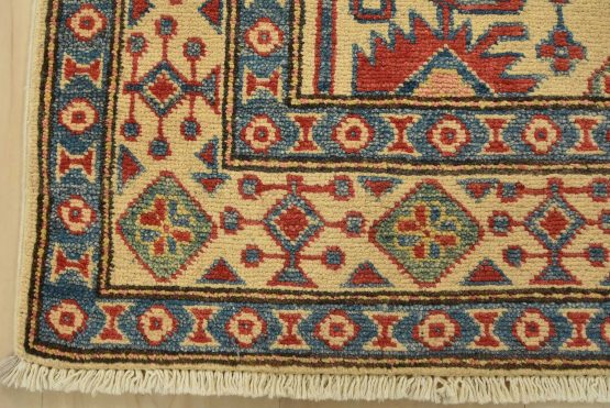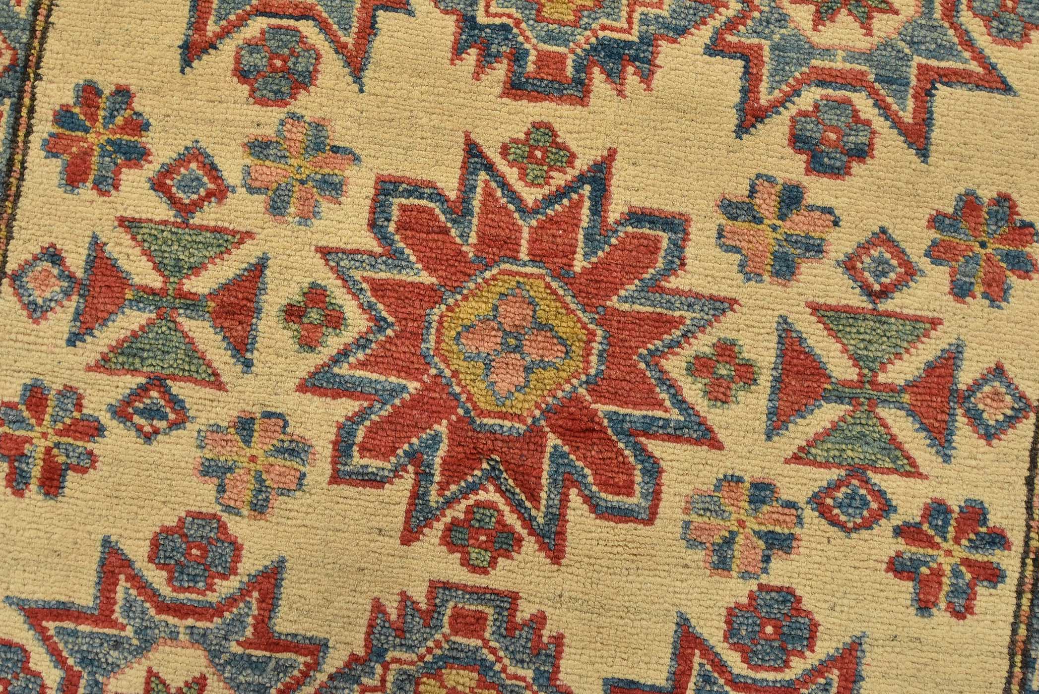 A tribal Kazak rug hand-knotted with fine wool on a cotton foundation. This oriental rug features geometric motifs set against a beige background. It is new and in excellent condition.